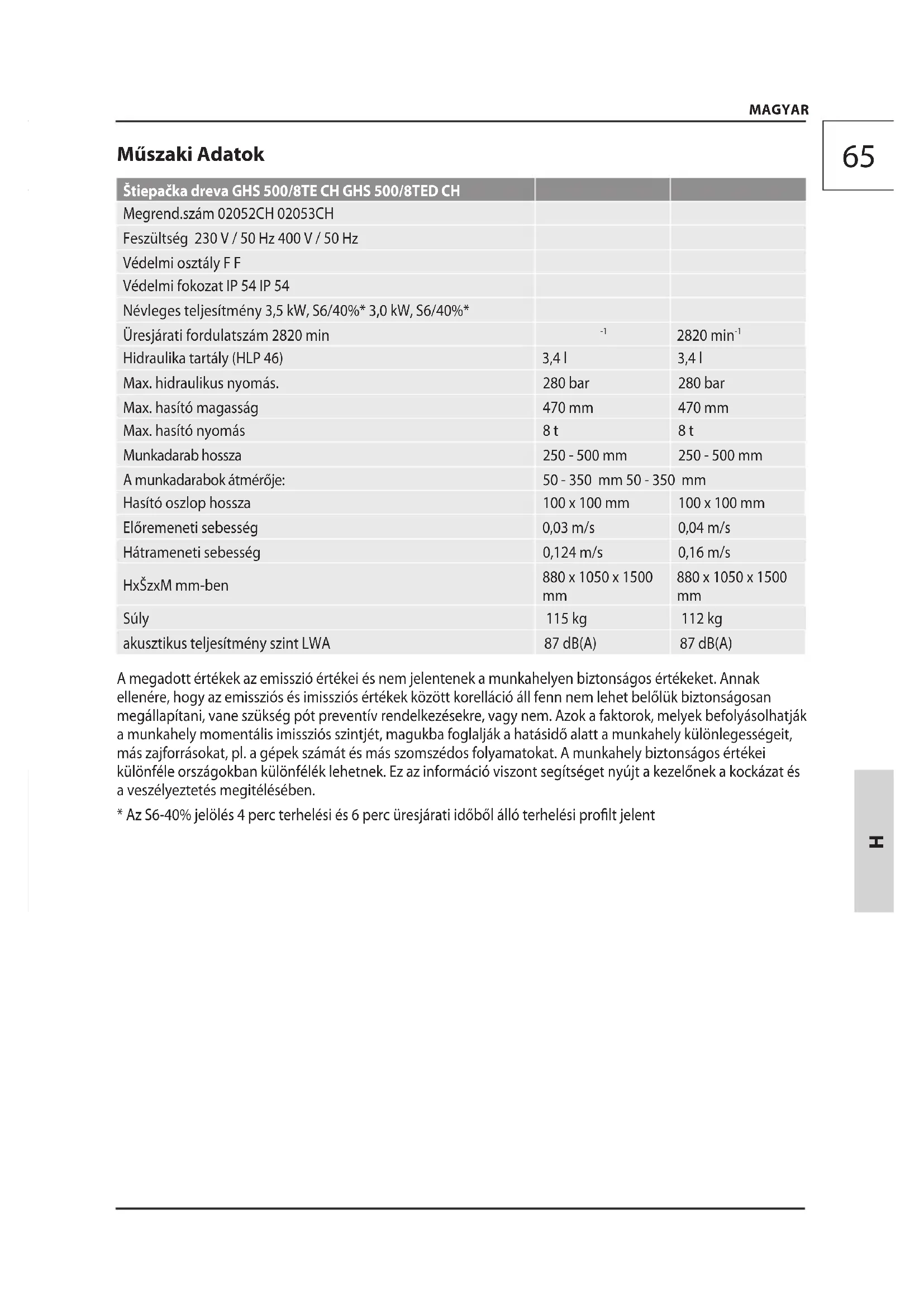 MAGYAR Műszaki Adatok Štiepačka dreva GHS 500/8TE CH GHS 500/8TED CH Megrend.szám 02052CH 02053CH Feszültség 230 V / 50 Hz 400 V / 50 Hz Védelmi osztály F F Védelmi fokozat IP 54 IP 54 Névleges teljesítmény 3,5 kW, S6/40%* 3,0 kW, S6/40%* Üresjárati fordulatszám 2820 min