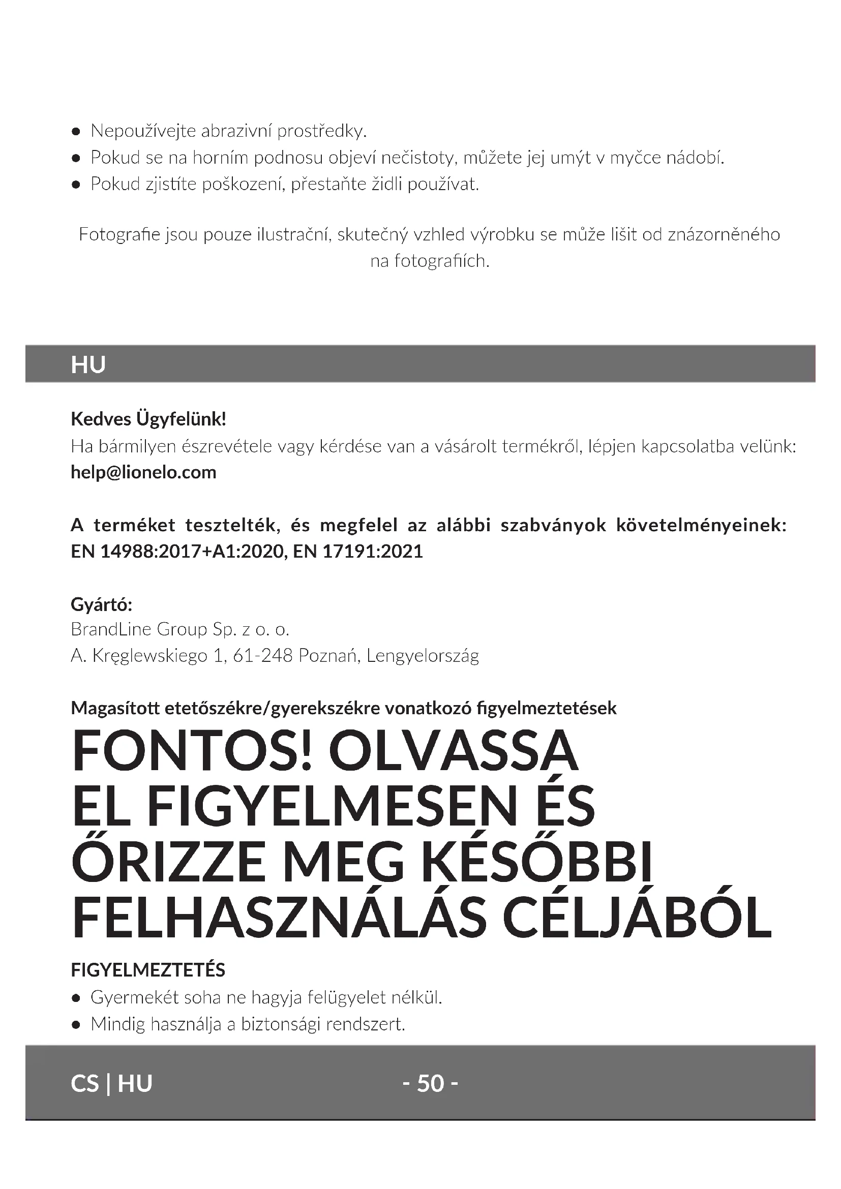 Kedves Ügyfelünk! Ha bármilyen észrevétele vagy kérdése van a vásárolt termékről, lépjen kapcsolatba velünk: help@lionelo.com A terméket tesztelték, és megfelel az alábbi szabványok követelményeinek: EN 14988:2017+A1:2020, EN 17191:2021 Gyártó: BrandLine Group Sp. z o. o. A. Kręglewskiego 1, 61-248 Poznań, Lengyelország Magasíto etetőszékre/gyerekszékre vonatkozó gyelmeztetések FONTOS! OLVASSA