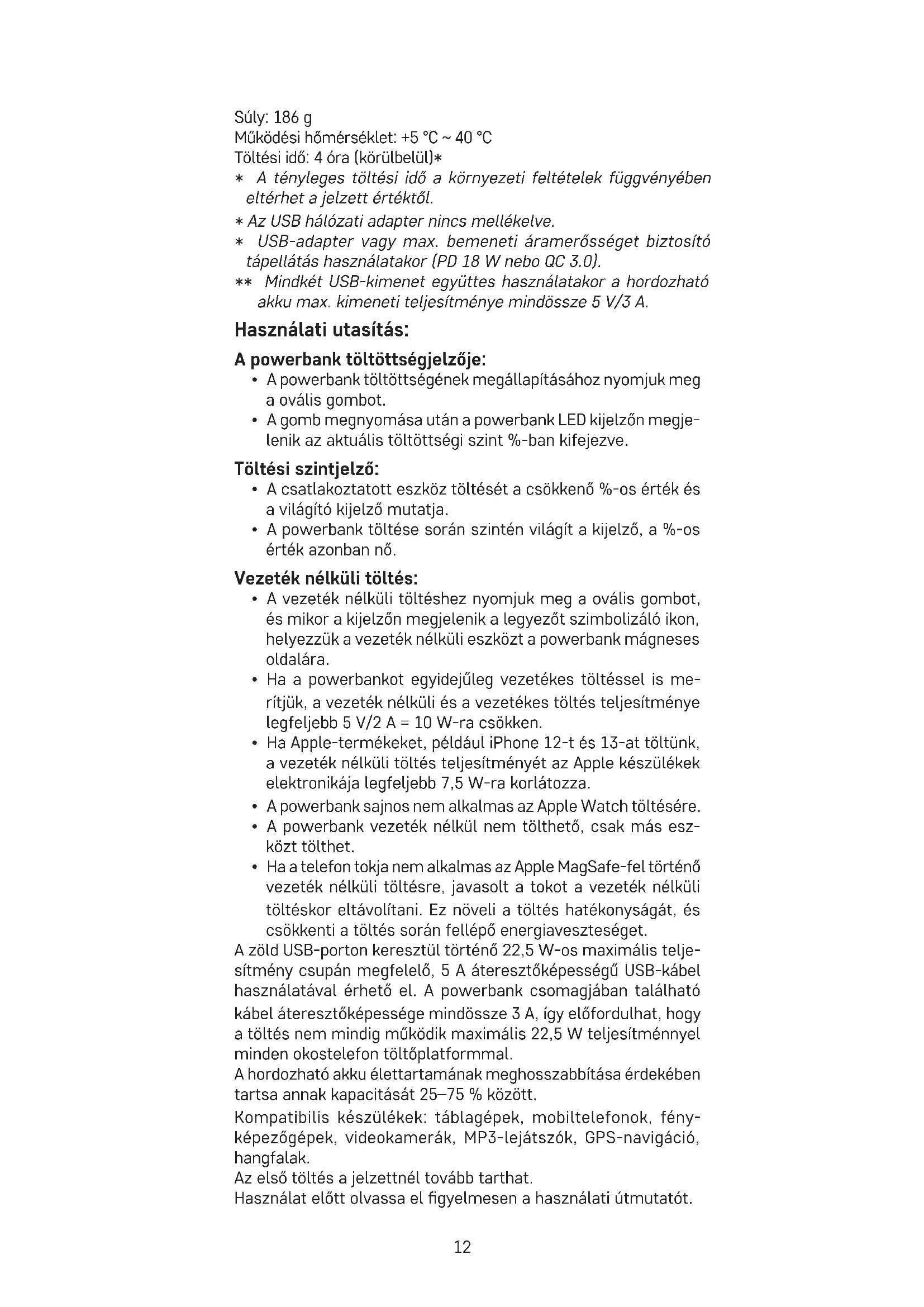- A powerbank vezeték nélkül nem tölthető, csak más esz- közt tölthet.