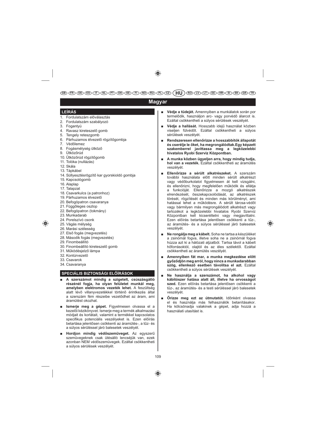 Ellen rizze a sérült alkatrészeket. A szerszám további használata eltt minden sérült alkatrészt vagy védburkolatot figyelmesen át kell vizsgálni, és ellenrizni, hogy megfelelen mködik és ellátja a funkcióját. Ellenrizze a mozgó alkatrészek elrendezését, összekapcsolódását, az alkatrészek törését, rögzítését és minden más körülményt, ami hatással lehet a mködésre. A sérült tárcsa-védt vagy bármilyen más megrongálódott alkatrészt vagy tartozékot a legközelebbi hivatalos Ryobi Szerviz Központban kell kicseréltetni vagy megjavíttatni. Ezen elírás betartása jelentsen csökkenti a tz-, az áramütés- és a súlyos sérüléssel járó balesetek veszélyét.