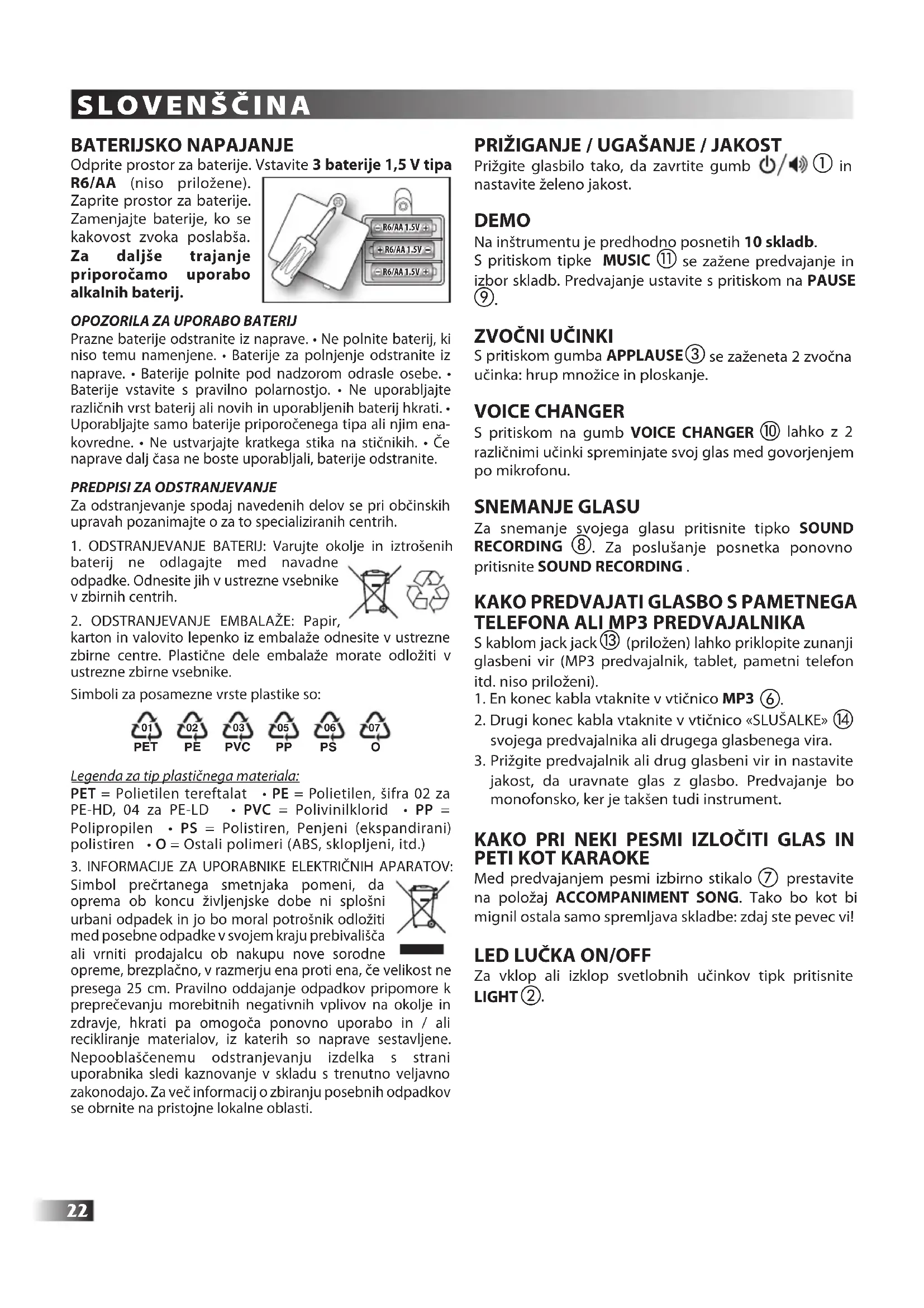 Bekapcsolás / Kikapcsolás / Hangerő; b LIGHT Fény effekt aktiváló gomb; c APPLAUSE Taps effekt és tömeg moraj; d MIC - Mikrofon csatlakozó-1 (készlet része); e MIC - Mikrofon csatlakozó-2 (készlet része); f Csatlakozó külső zeneforráshoz (MP3 leolvasó, okostelefon, stb.) (Csatlakozó kábel mellékelve) g Accompaniment Song / Original Song Aktiválja/deaktiválja a dalok hangjait; h SOUND RECORDING Hang felvétel és hang visszajátszás; i PAUSE Ritmus vagy demo darab leállítása; j VOICE CHANGER Hangváltó effekt; k MUSIC 10 előre programozott zenedarabot; l Elem tartó rekeszt Б Ъ Л Г А Р С К И