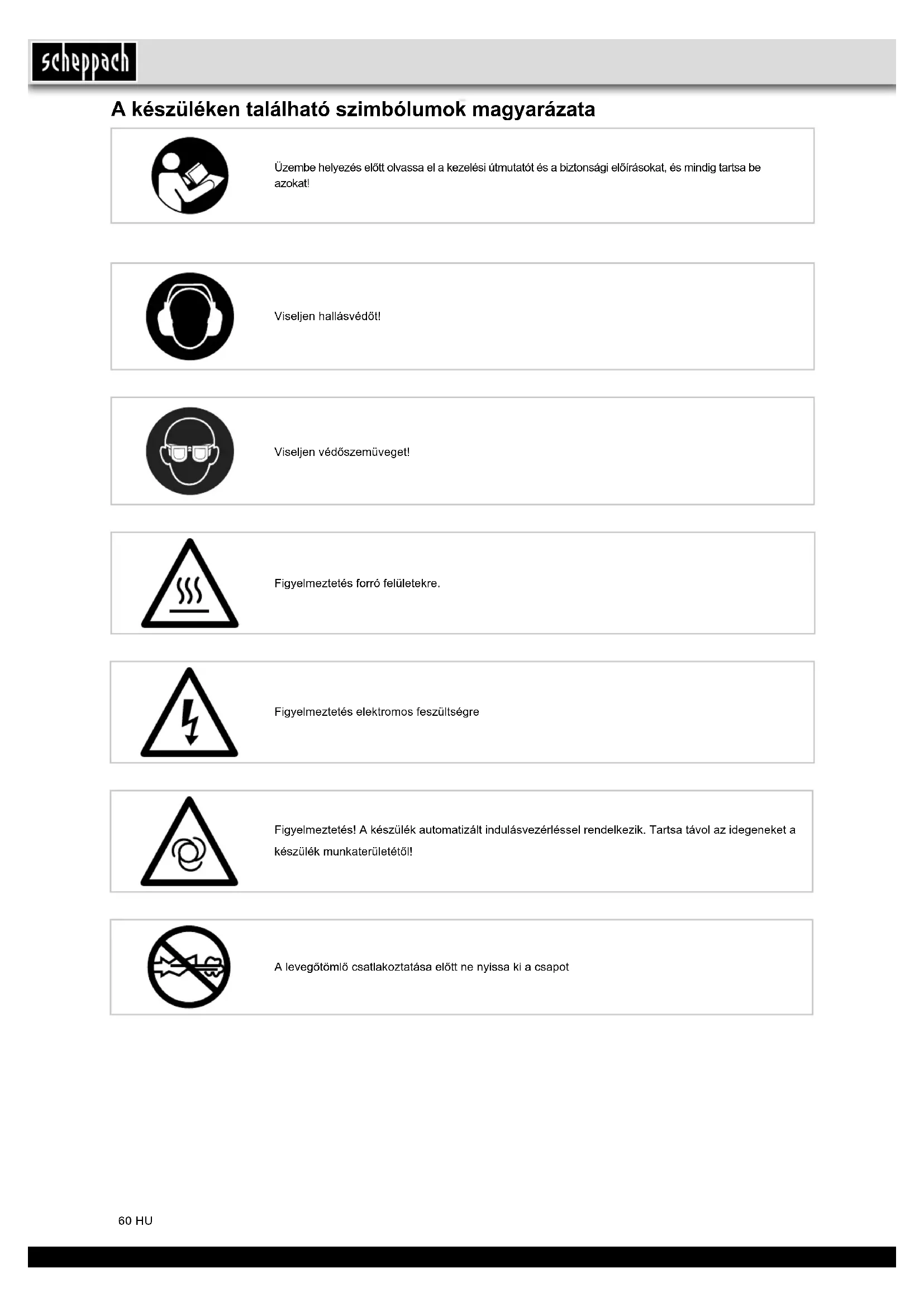 - Sprawdzić szybkozłączkę, w razie potrzeby wymienić.60 HU A készüléken található szimbólumok magyarázata Üzembe helyezés előtt olvassa el a kezelési útmutatót és a biztonsági előírásokat, és mindig tartsa be azokat! Figyelmeztetés elektromos feszültségre Figyelmeztetés! A készülék automatizált indulásvezérléssel rendelkezik. Tartsa távol az idegeneket a készülék munkaterületétől! Viseljen hallásvédőt! Figyelmeztetés forró felületekre. Viseljen védőszemüveget! A levegőtömlő csatlakoztatása előtt ne nyissa ki a csapot61HU A készülék leírása