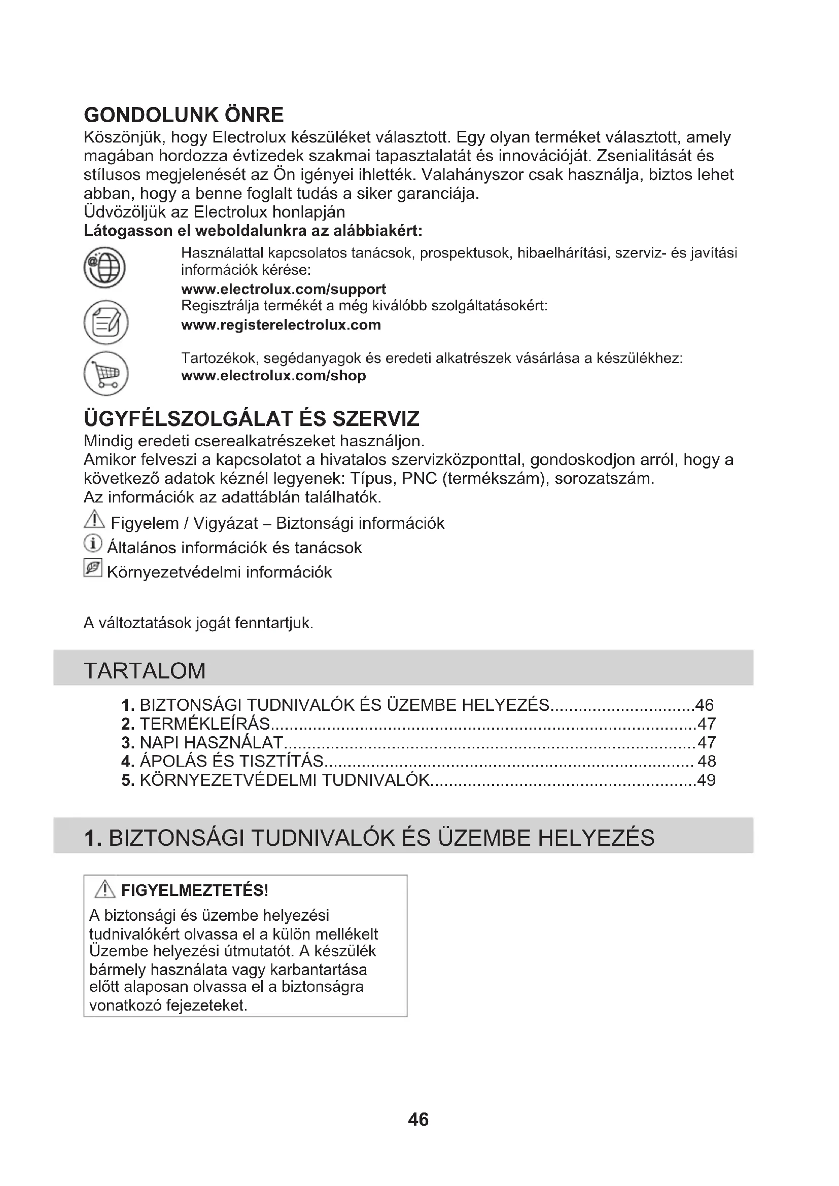 Mindig eredeti cserealkatrészeket használjon. Amikor felveszi a kapcsolatot a hivatalos szervizközponttal, gondoskodjon arról, hogy a következő adatok kéznél legyenek: Típus, PNC (termékszám), sorozatszám. Az információk az adattáblán találhatók. Figyelem / Vigyázat – Biztonsági információk Általános információk és tanácsok Környezetvédelmi információk A változtatások jogát fenntartjuk. TARTALOM