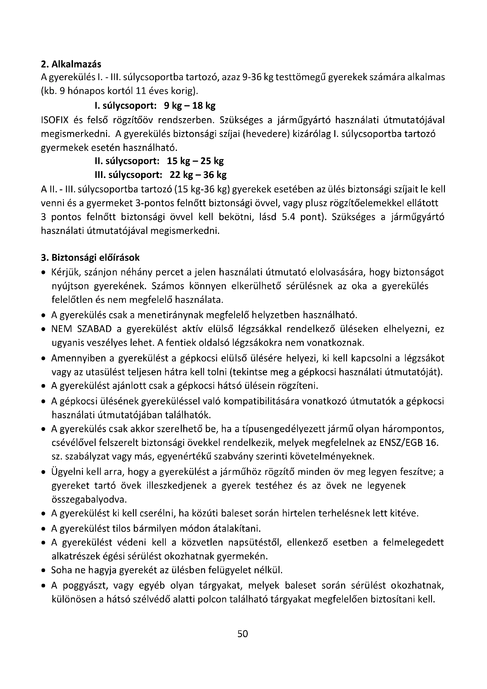 A II. - III. súlycsoportba tartozó (15 kg-36 kg) gyerekek esetében az ülés biztonsági szíjait le kell venni és a gyermeket 3-pontos felnőtt biztonsági övvel, vagy plusz rögzítőelemekkel ellátott 3 pontos felnőtt biztonsági övvel kell bekötni, lásd 5.4 pont). Szükséges a járműgyártó használati útmutatójával megismerkedni.
