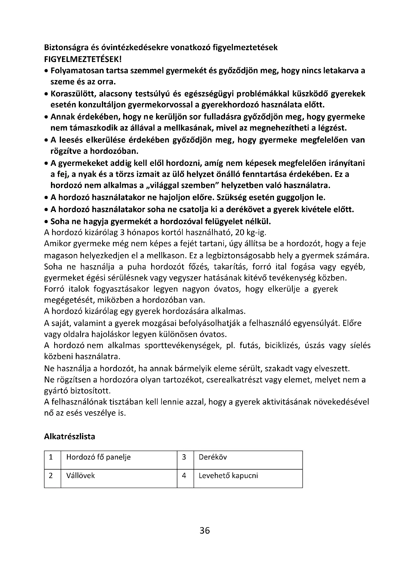 - Soha ne hagyja gyermekét a hordozóval felügyelet nélkül. A hordozó kizárólag 3 hónapos kortól használható, 20 kg-ig. Amikor gyermeke még nem képes a fejét tartani, úgy állítsa be a hordozót, hogy a feje magason helyezkedjen el a mellkason. Ez a legbiztonságosabb hely a gyermek számára. Soha ne használja a puha hordozót főzés, takarítás, forró ital fogása vagy egyéb, gyermeket égési sérülésnek vagy vegyszer hatásának kitévő tevékenység közben. Forró italok fogyasztásakor legyen nagyon óvatos, hogy elkerülje a gyerek megégetését, miközben a hordozóban van. A hordozó kizárólag egy gyerek hordozására alkalmas. A saját, valamint a gyerek mozgásai befolyásolhatják a felhasználó egyensúlyát. Előre vagy oldalra hajoláskor legyen különösen óvatos. A hordozó nem alkalmas sporttevékenységek, pl. futás, biciklizés, úszás vagy síelés közbeni használatra. Ne használja a hordozót, ha annak bármelyik eleme sérült, szakadt vagy elveszett. Ne rögzítsen a hordozóra olyan tartozékot, cserealkatrészt vagy elemet, melyet nem a gyártó biztosított. A felhasználónak tisztában kell lennie azzal, hogy a gyerek aktivitásának növekedésével nő az esés veszélye is. Alkatrészlista