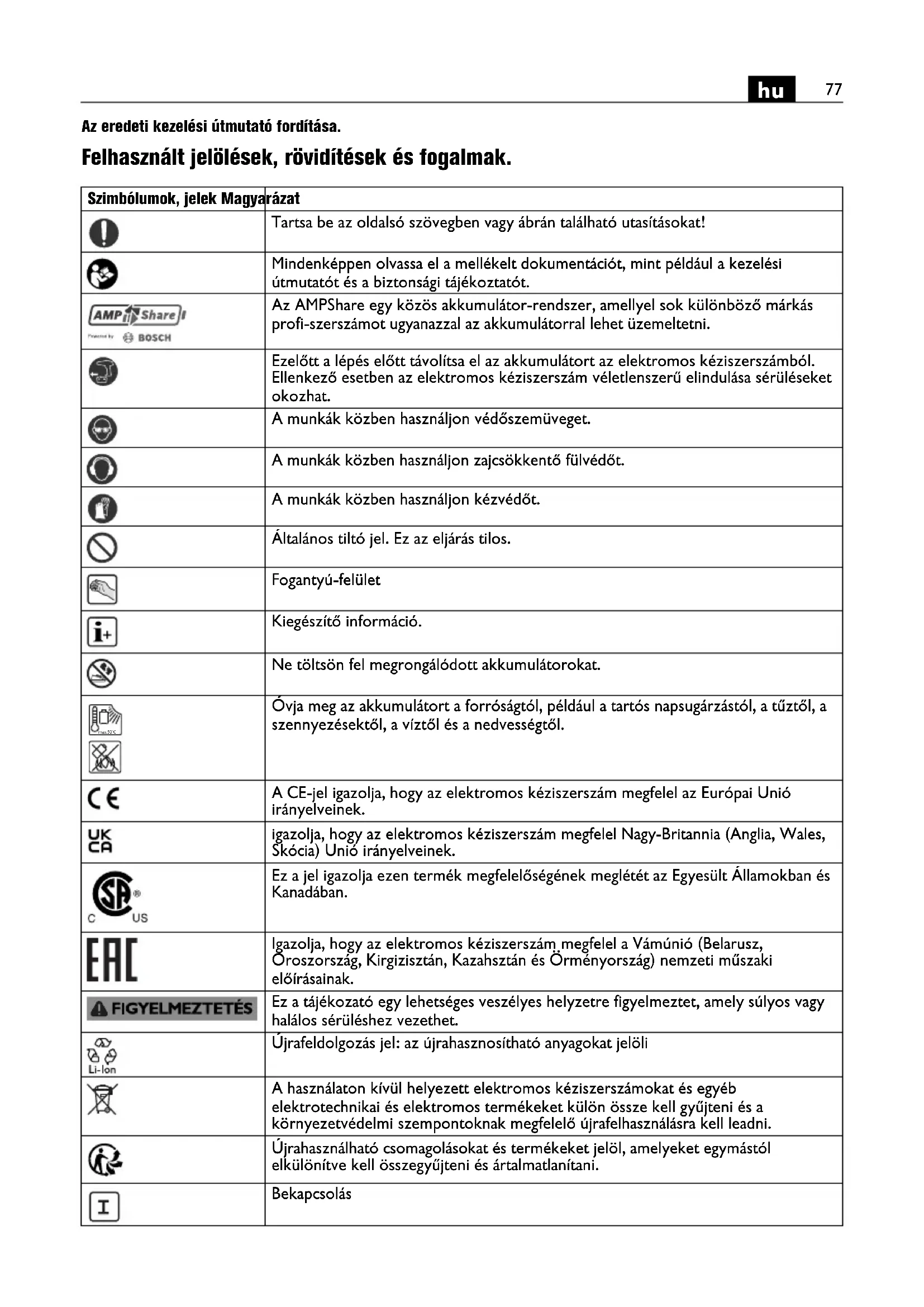 Az eredeti kezelési útmutató fordítása. Felhasznált jelölések, rövidítések és fogalmak. Szimbólumok, jelek Magyarázat Tartsa be az oldalsó szövegben vagy ábrán található utasításokat! Mindenképpen olvassa el a mellékelt dokumentációt, mint például a kezelési útmutatót és a biztonsági tájékoztatót. Az AMPShare egy közös akkumulátor-rendszer, amellyel sok különböző márkás profi-szerszámot ugyanazzal az akkumulátorral lehet üzemeltetni. Ezelőtt a lépés előtt távolítsa el az akkumulátort az elektromos kéziszerszámból. Ellenkező esetben az elektromos kéziszerszám véletlenszerű elindulása sérüléseket okozhat. A munkák közben használjon védőszemüveget. A munkák közben használjon zajcsökkentő fülvédőt. A munkák közben használjon kézvédőt. Általános tiltó jel. Ez az eljárás tilos. Fogantyú-felület Kiegészítő információ. Ne töltsön fel megrongálódott akkumulátorokat. Óvja meg az akkumulátort a forróságtól, például a tartós napsugárzástól, a tűztől, a szennyezésektől, a víztől és a nedvességtől. A CE-jel igazolja, hogy az elektromos kéziszerszám megfelel az Európai Unió irányelveinek. igazolja, hogy az elektromos kéziszerszám megfelel Nagy-Britannia (Anglia, Wales, Skócia) Unió irányelveinek. Ez a jel igazolja ezen termék megfelelőségének meglétét az Egyesült Államokban és Kanadában. Igazolja, hogy az elektromos kéziszerszám megfelel a Vámúnió (Belarusz, Oroszország, Kirgizisztán, Kazahsztán és Örményország) nemzeti műszaki előírásainak. Ez a tájékozató egy lehetséges veszélyes helyzetre figyelmeztet, amely súlyos vagy halálos sérüléshez vezethet. Újrafeldolgozás jel: az újrahasznosítható anyagokat jelöli A használaton kívül helyezett elektromos kéziszerszámokat és egyéb elektrotechnikai és elektromos termékeket külön össze kell gyűjteni és a környezetvédelmi szempontoknak megfelelő újrafelhasználásra kell leadni. Újrahasználható csomagolásokat és termékeket jelöl, amelyeket egymástól elkülönítve kell összegyűjteni és ártalmatlanítani. Bekapcsolás max.50°C78