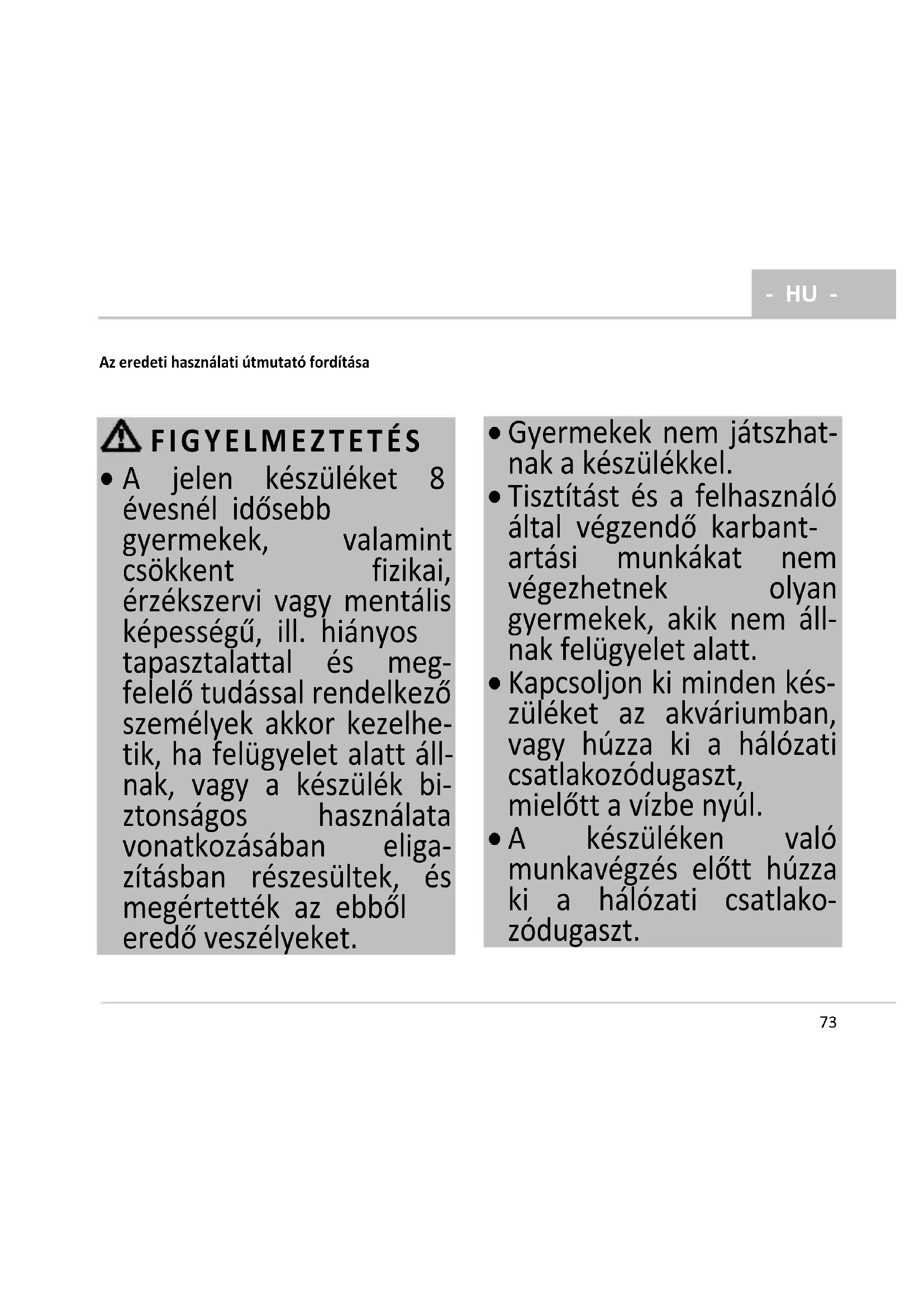 A jelen készüléket 8 évesnél idősebb gyermekek, valamint csökkent fizikai, érzékszervi vagy mentális képességű, ill. hiányos tapasztalattal és meg- felelő tudással rendelkező személyek akkor kezelhe- tik, ha felügyelet alatt áll- nak, vagy a készülék bi- ztonságos használata vonatkozásában eliga- zításban részesültek, és megértették az ebből eredő veszélyeket.