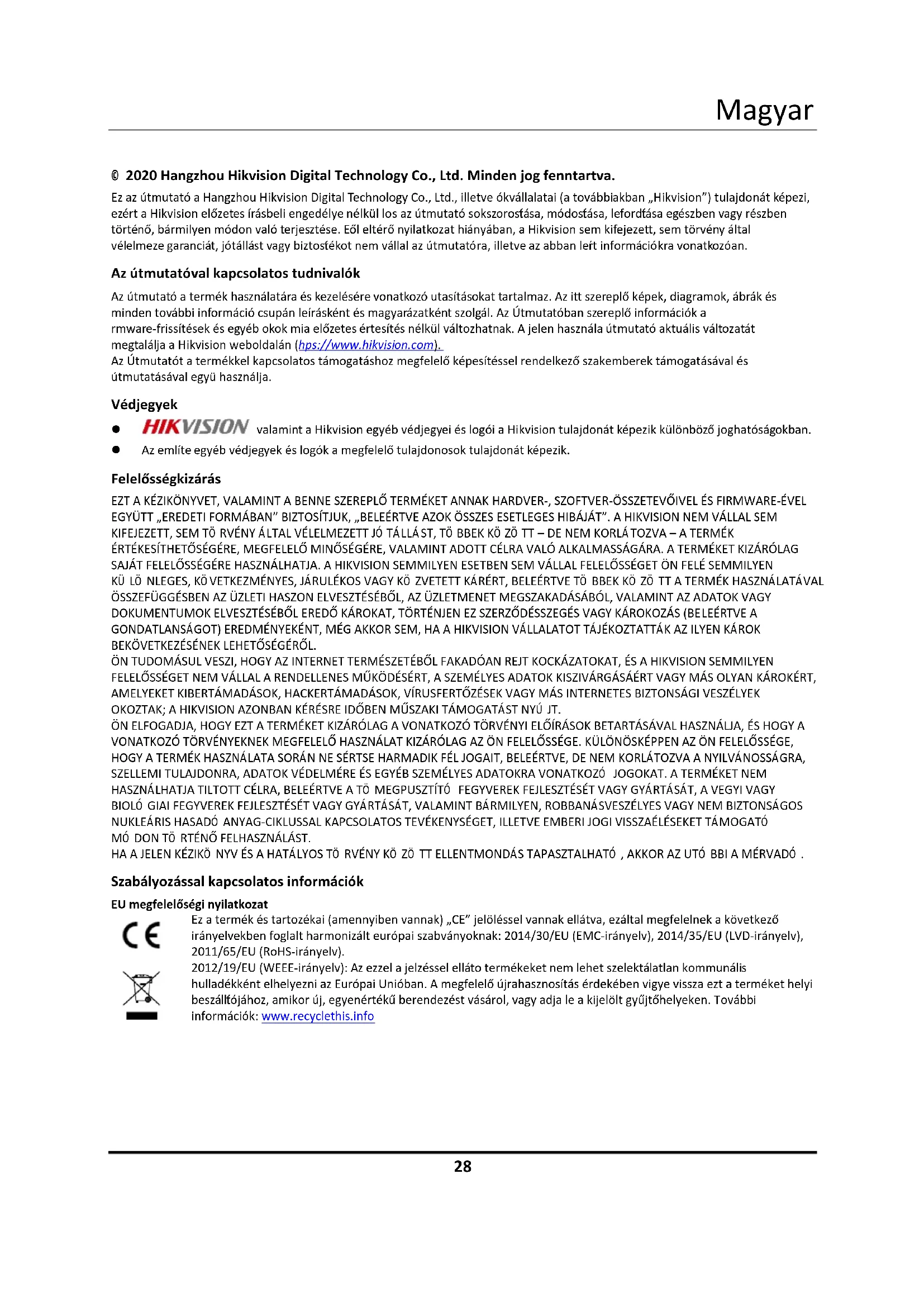 © 2020 Hangzhou Hikvision Digital Technology Co., Ltd. Minden jog fenntartva. Ez az útmutató a Hangzhou Hikvision Digital Technology Co., Ltd., illetve fiókvállalatai (a továbbiakban „Hikvision”) tulajdonát képezi, ezért a Hikvision előzetes írásbeli engedélye nélkül tilos az útmutató sokszorosítása, módosítása, lefordítása egészben vagy részben történő, bármilyen módon való terjesztése. Ettől eltérő nyilatkozat hiányában, a Hikvision sem kifejezett, sem törvény által vélelmezett garanciát, jótállást vagy biztosítékot nem vállal az útmutatóra, illetve az abban leírt információkra vonatkozóan. Az útmutatóval kapcsolatos tudnivalók Az útmutató a termék használatára és kezelésére vonatkozó utasításokat tartalmaz. Az itt szereplő képek, diagramok, ábrák és minden további információ csupán leírásként és magyarázatként szolgál. Az Útmutatóban szereplő információk a firmware-frissítések és egyéb okok miatt előzetes értesítés nélkül változhatnak. A jelen használati útmutató aktuális változatát megtalálja a Hikvision weboldalán (https://www.hikvision.com). Az Útmutatót a termékkel kapcsolatos támogatáshoz megfelelő képesítéssel rendelkező szakemberek támogatásával és útmutatásával együtt használja. Védjegyek valamint a Hikvision egyéb védjegyei és logói a Hikvision tulajdonát képezik különböző joghatóságokban. Az említett egyéb védjegyek és logók a megfelelő tulajdonosok tulajdonát képezik. Felelősségkizárás EZT A KÉZIKÖNYVET, VALAMINT A BENNE SZEREPLŐ TERMÉKET ANNAK HARDVER-, SZOFTVER-ÖSSZETEVŐIVEL ÉS FIRMWARE-ÉVEL EGYÜTT „EREDETI FORMÁBAN” BIZTOSÍTJUK, „BELEÉRTVE AZOK ÖSSZES ESETLEGES HIBÁJÁT”. A HIKVISION NEM VÁLLAL SEM KIFEJEZETT, SEM TÖ RVÉNY ÁLTAL VÉLELMEZETT JÓ TÁLLÁST, TÖ BBEK KÖ ZÖ TT – DE NEM KORLÁTOZVA – A TERMÉK ÉRTÉKESÍTHETŐSÉGÉRE, MEGFELELŐ MINŐSÉGÉRE, VALAMINT ADOTT CÉLRA VALÓ ALKALMASSÁGÁRA. A TERMÉKET KIZÁRÓLAG SAJÁT FELELŐSSÉGÉRE HASZNÁLHATJA. A HIKVISION SEMMILYEN ESETBEN SEM VÁLLAL FELELŐSSÉGET ÖN FELÉ SEMMILYEN KÜ LÖ NLEGES, KÖVETKEZMÉNYES, JÁRULÉKOS VAGY KÖ ZVETETT KÁRÉRT, BELEÉRTVE TÖ BBEK KÖ ZÖ TT A TERMÉK HASZNÁLATÁVAL ÖSSZEFÜGGÉSBEN AZ ÜZLETI HASZON ELVESZTÉSÉBŐL, AZ ÜZLETMENET MEGSZAKADÁSÁBÓL, VALAMINT AZ ADATOK VAGY DOKUMENTUMOK ELVESZTÉSÉBŐL EREDŐ KÁROKAT, TÖRTÉNJEN EZ SZERZŐDÉSSZEGÉS VAGY KÁROKOZÁS (BELEÉRTVE A GONDATLANSÁGOT) EREDMÉNYEKÉNT, MÉG AKKOR SEM, HA A HIKVISION VÁLLALATOT TÁJÉKOZTATTÁK AZ ILYEN KÁROK BEKÖVETKEZÉSÉNEK LEHETŐSÉGÉRŐL. ÖN TUDOMÁSUL VESZI, HOGY AZ INTERNET TERMÉSZETÉBŐL FAKADÓAN REJT KOCKÁZATOKAT, ÉS A HIKVISION SEMMILYEN FELELŐSSÉGET NEM VÁLLAL A RENDELLENES MŰKÖDÉSÉRT, A SZEMÉLYES ADATOK KISZIVÁRGÁSÁÉRT VAGY MÁS OLYAN KÁROKÉRT, AMELYEKET KIBERTÁMADÁSOK, HACKERTÁMADÁSOK, VÍRUSFERTŐZÉSEK VAGY MÁS INTERNETES BIZTONSÁGI VESZÉLYEK OKOZTAK; A HIKVISION AZONBAN KÉRÉSRE IDŐBEN MŰSZAKI TÁMOGATÁST NYÚ JT. ÖN ELFOGADJA, HOGY EZT A TERMÉKET KIZÁRÓLAG A VONATKOZÓ TÖRVÉNYI ELŐÍRÁSOK BETARTÁSÁVAL HASZNÁLJA, ÉS HOGY A VONATKOZÓ TÖRVÉNYEKNEK MEGFELELŐ HASZNÁLAT KIZÁRÓLAG AZ ÖN FELELŐSSÉGE. KÜLÖNÖSKÉPPEN AZ ÖN FELELŐSSÉGE, HOGY A TERMÉK HASZNÁLATA SORÁN NE SÉRTSE HARMADIK FÉL JOGAIT, BELEÉRTVE, DE NEM KORLÁTOZVA A NYILVÁNOSSÁGRA, SZELLEMI TULAJDONRA, ADATOK VÉDELMÉRE ÉS EGYÉB SZEMÉLYES ADATOKRA VONATKOZÓ JOGOKAT. A TERMÉKET NEM HASZNÁLHATJA TILTOTT CÉLRA, BELEÉRTVE A TÖ MEGPUSZTÍTÓ FEGYVEREK FEJLESZTÉSÉT VAGY GYÁRTÁSÁT, A VEGYI VAGY BIOLÓ GIAI FEGYVEREK FEJLESZTÉSÉT VAGY GYÁRTÁSÁT, VALAMINT BÁRMILYEN, ROBBANÁSVESZÉLYES VAGY NEM BIZTONSÁGOS NUKLEÁRIS HASADÓ ANYAG-CIKLUSSAL KAPCSOLATOS TEVÉKENYSÉGET, ILLETVE EMBERI JOGI VISSZAÉLÉSEKET TÁMOGATÓ MÓ DON TÖ RTÉNŐ FELHASZNÁLÁST. HA A JELEN KÉZIKÖ NYV ÉS A HATÁLYOS TÖ RVÉNY KÖ ZÖ TT ELLENTMONDÁS TAPASZTALHATÓ , AKKOR AZ UTÓ BBI A MÉRVADÓ . Szabályozással kapcsolatos információk EU megfelelőségi nyilatkozat
