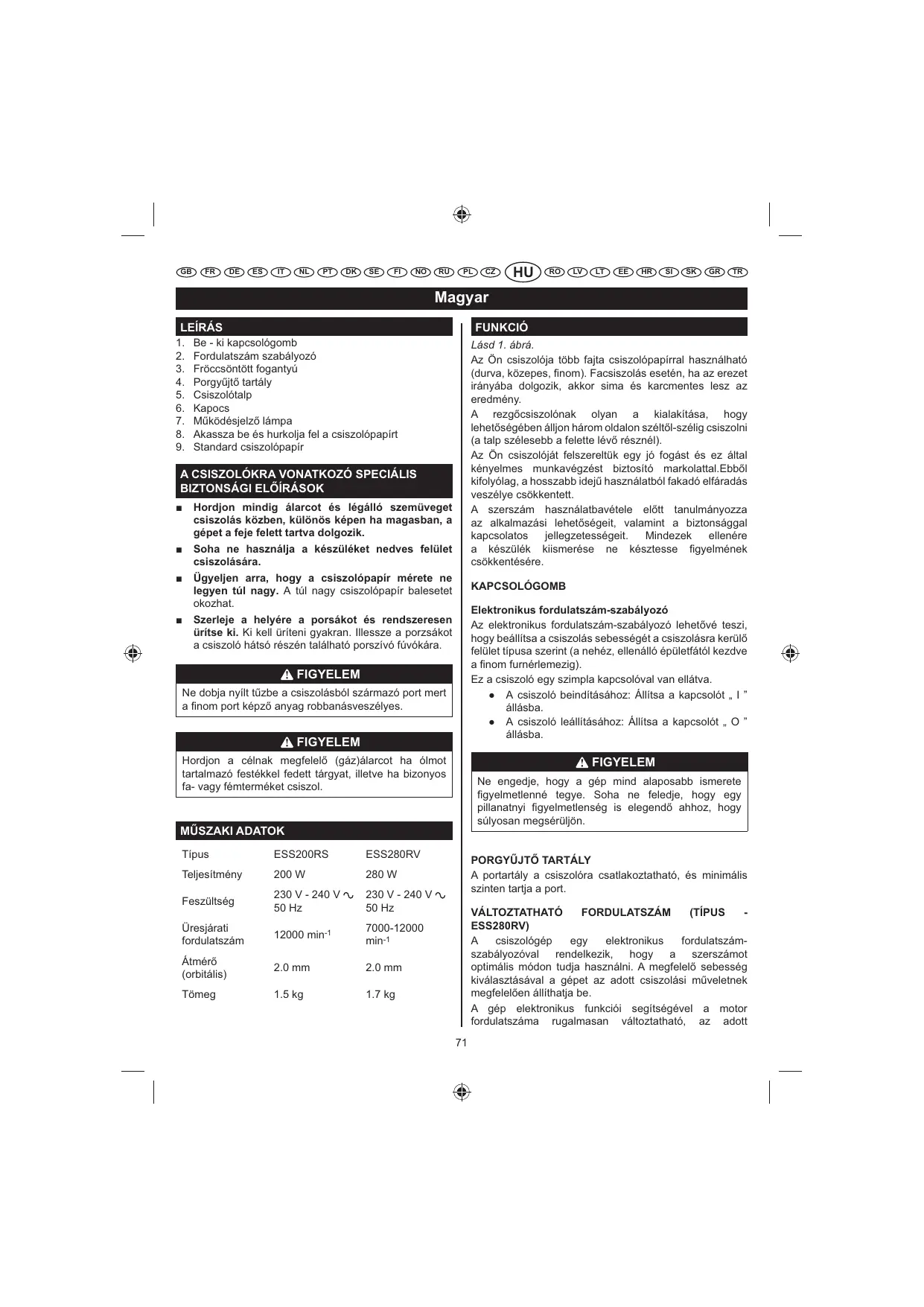 Típus ESS200RS ESS280RV Teljesítmény 200 W 280 W Feszültség 230 V - 240 V 50 Hz 230 V - 240 V 50 Hz VÁLTOZTATHATÓ FORDULATSZÁM (TÍPUS ESS280RV) csiszológép egy elektronikus fordulatszámszabályozóval rendelkezik, hogy szerszámot optimális módon tudja használni. A megfelel sebesség kiválasztásával a gépet az adott csiszolási mµveletnek megfelelen állíthatja be. A gép elektronikus funkciói segítségével a motor fordulatszáma rugalmasan változtatható, az adott 7000-12000 min-1 Üresjárati fordulatszám