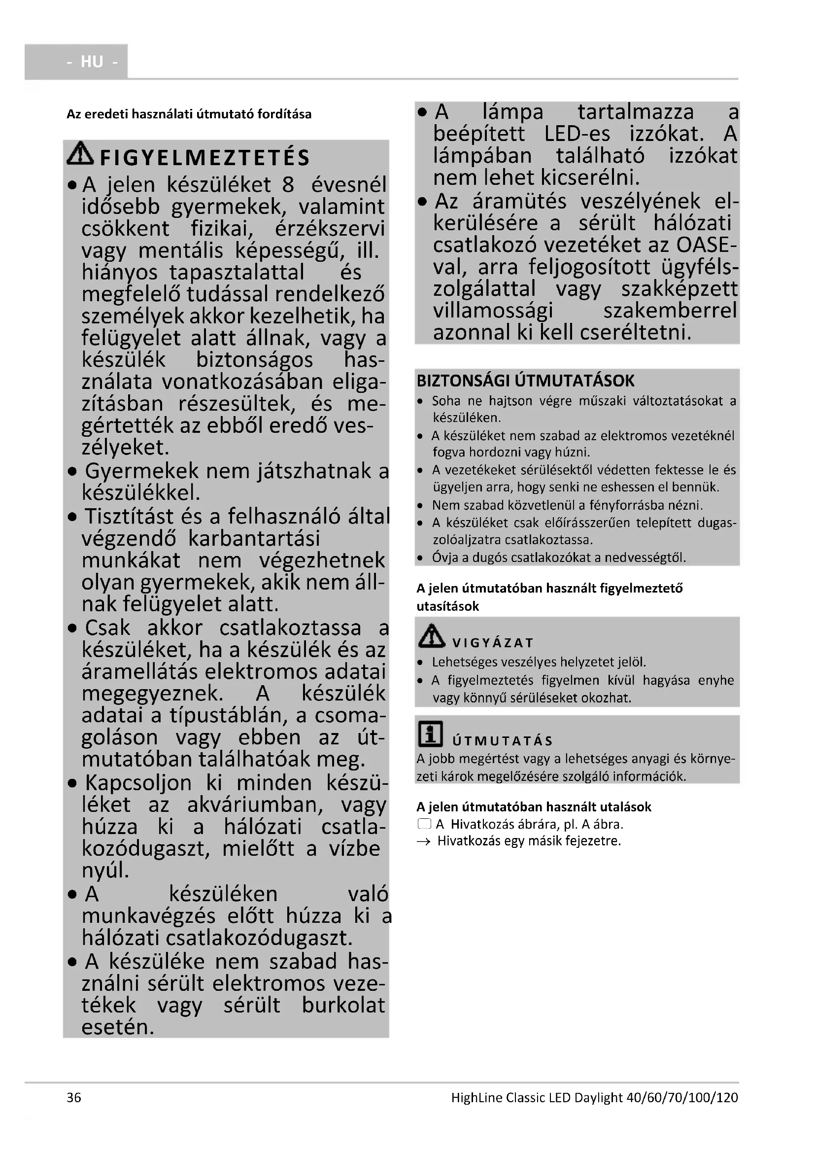 A HighLine Classic LED Daylight OASE HighLine ak- váriumokhoz való LED lámpa. A fénysáv egy sor egymás mellett elhelyezkedő LED-ből áll. A LED-ek fénysugárzási szöge gondoskodik az akvárium egyen- letes megvilágításáról. Rendeltetésszerű használat Az HighLine Classic LED Daylight 40/60/70/100/120 ké- szülék kizárólag a következőképpen használandó: