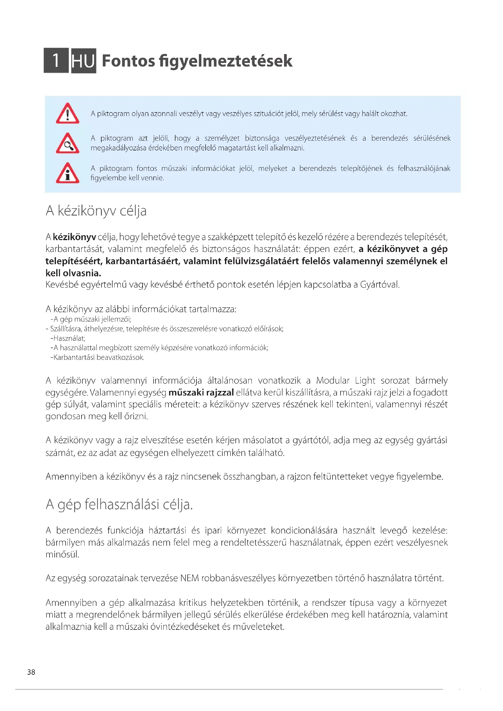 Biztonsági szabályok A gép használatához és karbantartásához előírt illetékességek Általános kezelő: Az elektromos vezérlőszekrény kapcsolótábláján lévő vezérlők révén a gép irányítására ENGEDÉLLYEL rendelkező személy. Csak a gép vezérlésének műveleteit, bekapcsolást/kikapcsolást végzi (Szakképzett) mechanikai karbantartó: A mechanikus egységek karbantartási, beállítási, csere és javítási beavatkozásaira ENGEDÉLLYEL rendelkező személy. Ismernie kell a mechanikus rendszereket, vagyis képesnek kell lennie mechanikus karbantartás megfelelő és biztonságos elvégzésére, rendelkeznie kell elméleti előkészítéssel és manuális tapasztalattal. NINCS ENGEDÉLYE az elektromos rendszereken végzett karbantartásokra. A gyártó műszaki szakembere (szakképzett): Bármilyen szituációban komplex műveletek végzésére ENGEDÉLLYEL rendelkező személy. A felhasználóval összhangban végzi a munkáját. (Szakképzett) elektromos karbantartó szakember: Elektromos jellegű, beállítási, karbantartási, valamint elektromos javítási beavatkozások végzésére ENGEDÉLLYEL rendelkező személy. ENGEDÉLLYEL rendelkezik feszültség alatt lévő elektromos szekrényeken és elosztódobozokon történő beavatkozásra. Elektronikus vagy elektrotechnikus képzettséggel kell rendelkeznie, vagyis képesnek kell lennie elektromos rendszereken történő megfelelő és biztonságos beavatkozásra, rendelkeznie kell elméleti előkészülettel és bizonyított tapasztalattal. NINCS ENGEDÉLYE mechanikai jellegű beavatkozások végzésére. A gép telepítéséhez előírt illetékességek A telepítő szakembereknek a beavatkozásokat saját szakképzettségüknek megfelelően kell elvégezni: saját illetékességén kívül eső valamennyi beavatkozást (pl.: elektromos bekötések) speciális és szakképzett kezelőknek kell elvégezniük annak érdekében, hogy ne veszélyeztessék saját biztonságukat, és a berendezéssel kapcsolatba kerülő más személyek biztonságát. A gép szállításáért és mozgatásáért felelős kezelő: engedéllyel rendelkező, szállítóeszközök és emelőeszközök használatában jártas személy. Műszaki telepítő személy: a gyártó vagy megbízottja által biztosított képzett műszaki szakember, aki a gép telepítéséhez szükséges megfelelő műszaki illetékességgel és képzettséggel rendelkezik. Kisegítő személy: a felszerelés emelésének és összeszerelésének irányítási feladatát végző műszaki személy. Megfelelő képzettséggel kell rendelkeznie, valamint információkkal kell rendelkeznie a beavatkozásokkal és a telephely/telepítési hely biztonsági terveire vonatkozóan. A kézikönyvben valamennyi művelethez meghatároztuk a feladat elvégzéséhez illetékes műszaki személyt. A telepítők, felhasználók és karbantartók NEM végezhetnek munkát a gépen, amennyiben: - nincs tapasztalatuk, nem felelősek vagy kiskorúak; - testi károsodással élnek vagy testi és szellemi állapotuk nem tökéletes; - nem rendelkeznek a gép üzemciklusára vonatkozó ismeretekkel; - nem végezték el az elméleti/gyakorlati felkészítő tanfolyamot egy tapasztalt gépkezelő illetve a gyártó szakembere vezetésével. A kézikönyvben valamennyi művelethez meghatároztuk a feladat elvégzéséhez illetékes műszaki személyt.40 A gép telepítése, használata és karbantartása előtt olvassa el figyelmesen a kézikönyvet, őrizze meg a kezelők későbbi tanulmányozása céljából. Ne távolítsa el, ne tépje el és ne írja át semmilyen okból a kézikönyv részeit. Az összes telepítési, felszerelési, elektromos hálózati bekötési, valamint rendes/rendkívüli karbantartási műveletet kizárólag olyan műszaki szakemberek végezhetnek, akik betartják a törvény előírásait, elektromosan kikapcsolták az egységet és egyéni védőfelszerelést (pl. védőkesztyűt, -szemüveget stb.) alkalmaznak, a telepítési célországban érvényes szabványok szerint és a munkahelyi biztonságra és a berendezésekre vonatkozó összes szabványnak megfelelően. A kézikönyvtől eltérő telepítés, használat vagy karbantartás sérüléseket vagy halálos baleseteket okozhat, érvényteleníti a garanciát, és felmenti a gyártót bármilyen felelősség alól. A berendezés mozgatása vagy telepítése során a balesetek megelőzése, valamint saját vagy más személyek biztonságának biztosítása érdekében kötelező védőfelszerelés és a célnak megfelelő eszközök alkalmazása. A gép összeszerelése vagy karbantartása során a munkaterület közelében telepítés végzésével nem megbízott személyek áthaladása vagy tartózkodása NEM engedélyezett. Bármilyen telepítési vagy karbantartási beavatkozás előtt válassza le a berendezést az elektromos hálózatról. A berendezés telepítése előtt ellenőrizze, hogy a rendszerek megfelelnek-e a felhasználás országában érvényes szabványoknak, valamint az azonosító adattáblán található adatoknak. A felhasználónak/telepítő szakembernek kell meggyőződnie a telepítésre vonatkozó statikus és dinamikus stabilitásról, valamint elő kell készítenie a környezetet úgy, hogy illetéktelen és engedéllyel nem rendelkező személyek NE férhessenek a géphez vagy a gép vezérlőihez. A felhasználónak/telepítő szakembernek kell meggyőződnie arról, hogy a környezeti feltételek nem veszélyeztetik-e a személyi és dologi biztonságot a telepítési, felhasználási és karbantartási fázisok alatt. Győződjön meg arról, hogy a levegő beszívás nem elvezetők, égéstermékek vagy egyéb szennyező elemek közelében történik. NE telepítse a berendezést erős szélnek, magas sótartalmú környezetnek, nyílt lángnak vagy 40°C (104°F) foknál magasabb hőmérsékletnek kitett helyekre. A telepítés végén adjon megf