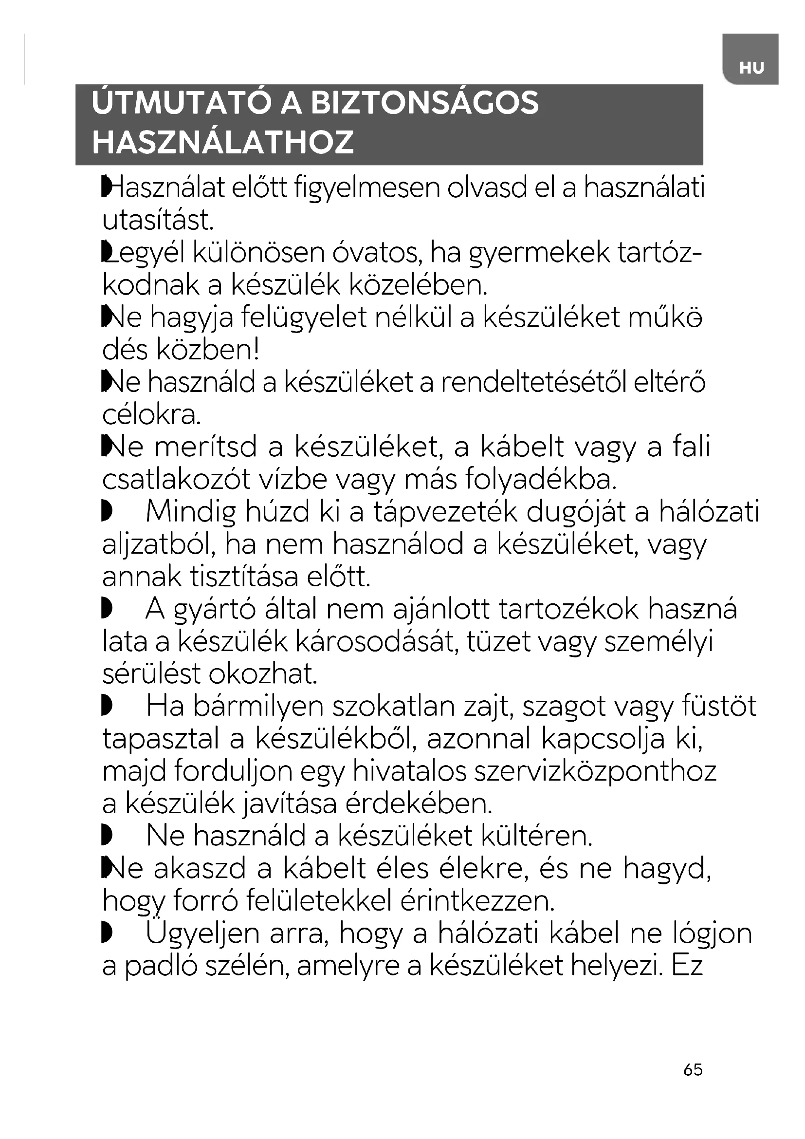 Ne merítsd a készüléket, a kábelt vagy a fali csatlakozót vízbe vagy más folyadékba. Mindig húzd ki a tápvezeték dugóját a hálózati aljzatból, ha nem használod a készüléket, vagy annak tisztítása előtt. A gyártó által nem ajánlott tartozékok haszná