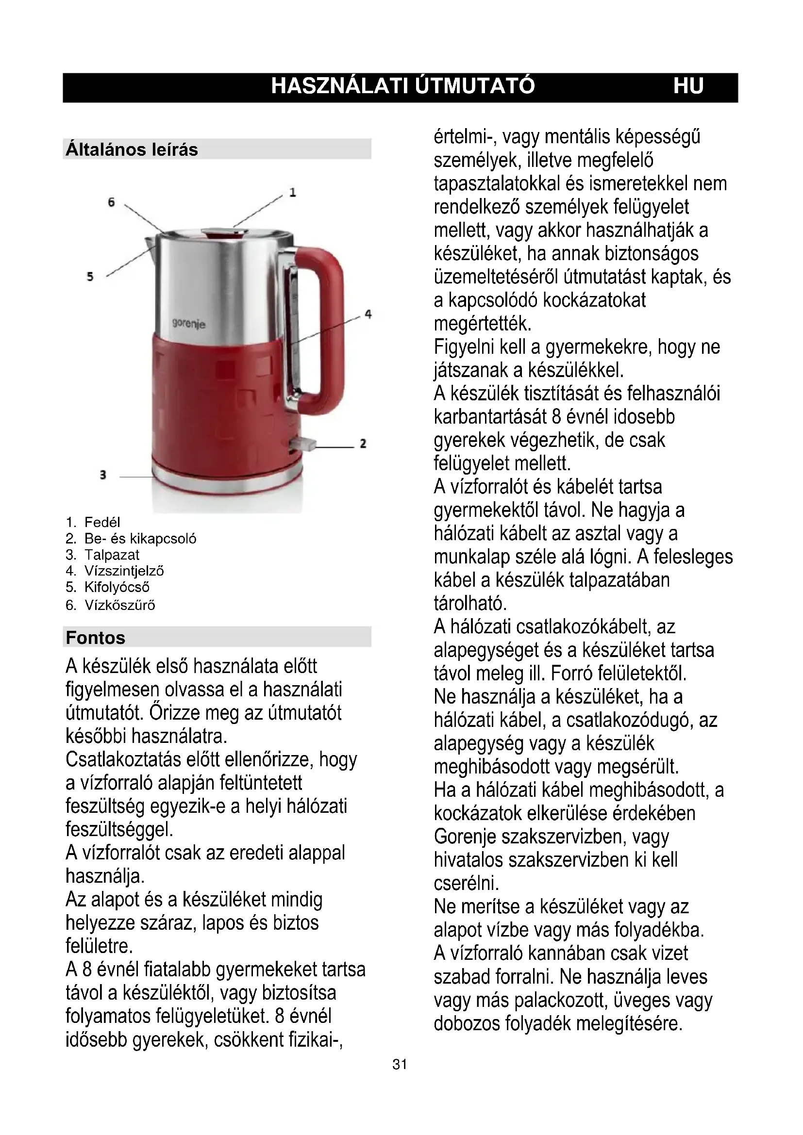 Fontos A készülék első használata előtt figyelmesen olvassa el a használati útmutatót. Őrizze meg az útmutatót későbbi használatra. Csatlakoztatás előtt ellenőrizze, hogy a vízforraló alapján feltüntetett feszültség egyezik-e a helyi hálózati feszültséggel. A vízforralót csak az eredeti alappal használja. Az alapot és a készüléket mindig helyezze száraz, lapos és biztos felületre. A 8 évnél fiatalabb gyermekeket tartsa távol a készüléktől, vagy biztosítsa folyamatos felügyeletüket. 8 évnél idősebb gyerekek, csökkent fizikai-, értelmi-, vagy mentális képességű személyek, illetve megfelelő tapasztalatokkal és ismeretekkel nem rendelkező személyek felügyelet mellett, vagy akkor használhatják a készüléket, ha annak biztonságos üzemeltetéséről útmutatást kaptak, és a kapcsolódó kockázatokat megértették. Figyelni kell a gyermekekre, hogy ne játszanak a készülékkel. A készülék tisztítását és felhasználói karbantartását 8 évnél idosebb gyerekek végezhetik, de csak felügyelet mellett. A vízforralót és kábelét tartsa gyermekektől távol. Ne hagyja a hálózati kábelt az asztal vagy a munkalap széle alá lógni. A felesleges kábel a készülék talpazatában tárolható. A hálózati csatlakozókábelt, az alapegységet és a készüléket tartsa távol meleg ill. Forró felületektől. Ne használja a készüléket, ha a hálózati kábel, a csatlakozódugó, az alapegység vagy a készülék meghibásodott vagy megsérült. Ha a hálózati kábel meghibásodott, a kockázatok elkerülése érdekében Gorenje szakszervizben, vagy hivatalos szakszervizben ki kell cserélni. Ne merítse a készüléket vagy az alapot vízbe vagy más folyadékba. A vízforraló kannában csak vizet szabad forralni. Ne használja leves vagy más palackozott, üveges vagy dobozos folyadék melegítésére.32 A forró víz komoly égési sebeket okozhat. Legyen óvatos, ha a kannában forró víz van. Soha ne töltse a kannát a maximális szintjelzésen túl. Ha a vízforraló túlságosan tele van, a forró víz kifuthat a kiöntőnyíláson és leforrázhatja Önt. Vízforralás közben ne nyissa fel a fedelet. Legyen óvatos, ha a fedelet közvetlenül a víz felforralása után nyitja fel, mert a kannából kiáramló gőz nagyon forró. Ne érintse meg a kannát, mert használat közben nagyon felmelegszik. A kannát mindig a fogantyújánál fogva emelje fel. Ügyeljen rá, hogy a kannában lévő víz legalább a kanna aljáig érjen, nehogy forrás közben elpárologjon az összes víz a készülékből. Kevés pára jelenhet meg a vízforraló kanna alapján. Ez teljesen normális jelenség, és nem jelenti, hogy a kannának bármilyen meghibásodása lenne. Lakóhelyének vízkeménységétől függően használatkor a kanna fűtőegységén kis foltok jelenhetnek meg. Ez a jelenség az idővel a fűtőegységre és a kanna belsejére lerakódó vízkő következménye. Minél keményebb a víz, annál gyorsabban keletkezik vízkő. A vízkő különböző színű lehet. Bár a vízkő veszélytelen, a túl sok vízkő csökkentheti a készülék teljesítményét. Rendszeresen vízkőmentesítse a kannát a „Vízkőmentesítés” című részben leírtak szerint. Ez a készülék az elhasznált villamossági és elektronikai készülékekről szóló 2012/19/EU irányelvnek megfelelő jelölést kapott. Ez az irányelv a már nem használt készülékek visszavételének és hasznosításának EU-szerte érvényes kereteit határozza meg. Elektromágneses mezők (EMF) Ez a Gorenje készülék megfelel az elektromágneses mezőkre (EMF) vonatkozó szabványoknak. Amennyiben a használati útmutatóban foglaltaknak megfelelően üzemeltetik, a tudomány mai állása szerint a készülék biztonságos. Bimetál hőkapcsoló A vízforraló kanna túlfűtés elleni védelemmel rendelkezik. A készülék automatikusan kikapcsol, ha véletlenül bekapcsolná, amikor nincs benne víz, vagy a víz mennyisége nem elegendő. Ekkor a be- és kikapcsoló bekapcsolt állapotban marad, de a működésjelző fény gyűrűje nem világít. Kapcsolja ki a készüléket, és hagyja lehűlni 10 percig. Ezután a túlfűtés elleni védelem kikapcsolásához emelje le a kannát a talpazatról. Most a vízforraló ismét használható. Teendők az első használat előtt