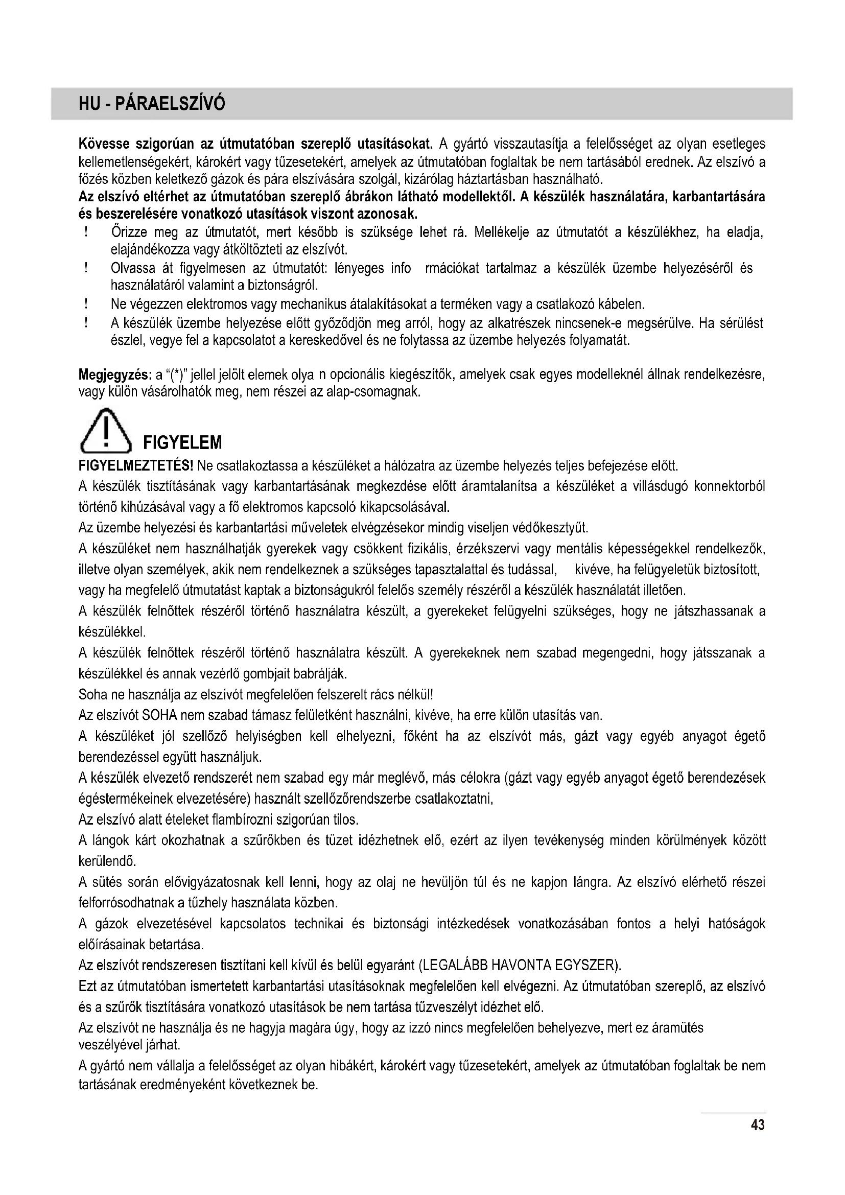 Kövesse szigorúan az útmutatóban szereplő utasításokat. A gyártó visszautasítja a felelősséget az olyan esetleges kellemetlenségekért, károkért vagy tűzesetekért, amelyek az útmutatóban foglaltak be nem tartásából erednek. Az elszívó a főzés közben keletkező gázok és pára elszívására szolgál, kizárólag háztartásban használható. Az elszívó eltérhet az útmutatóban szereplő ábrákon látható modellektől. A készülék használatára, karbantartására és beszerelésére vonatkozó utasítások viszont azonosak.