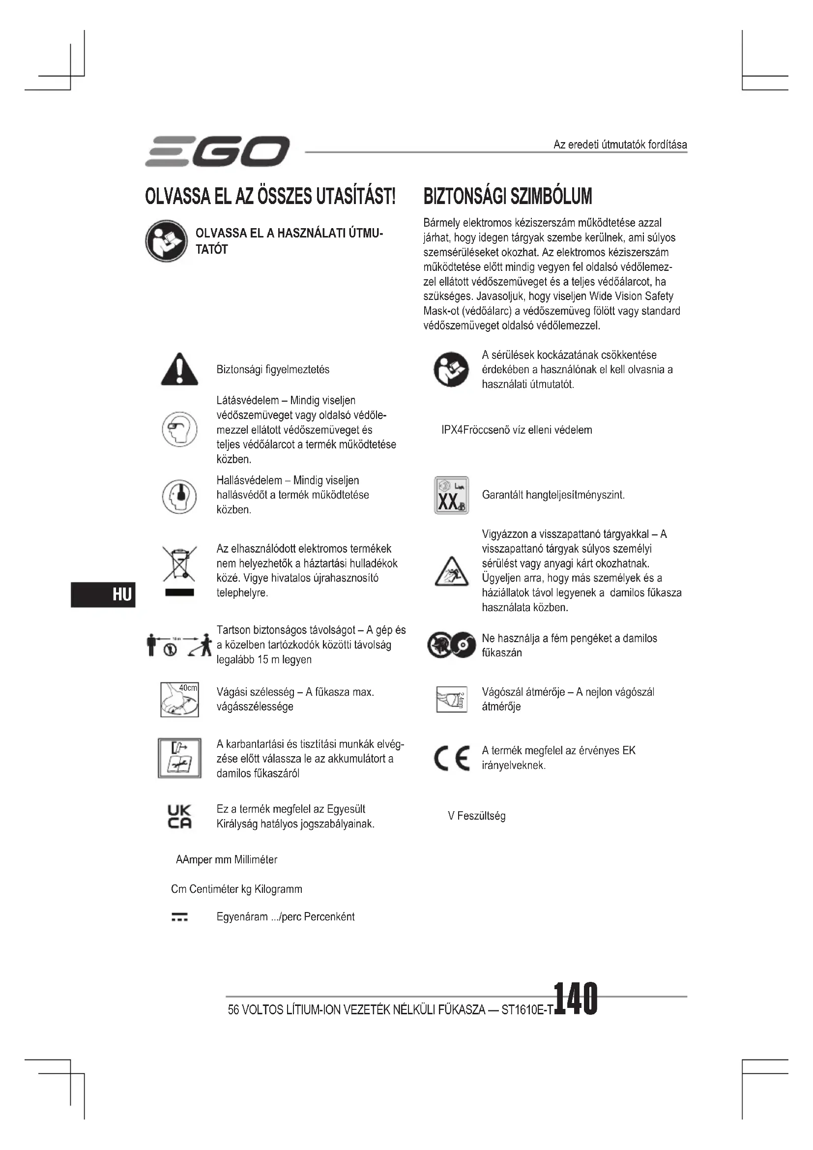 Garantált hangteljesítményszint.Az elhasználódott elektromos termékek nem helyezhetők a háztartási hulladékok közé. Vigye hivatalos újrahasznosító telephelyre.Vigyázzon a visszapattanó tárgyakkal – A visszapattanó tárgyak súlyos személyi sérülést vagy anyagi kárt okozhatnak. Ügyeljen arra, hogy más személyek és a háziállatok távol legyenek a damilos fűkasza használata közben.Tartson biztonságos távolságot – A gép és a közelben tartózkodók közötti távolság legalább 15 m legyenNe használja a fém pengéket a damilos fűkaszán 40cm Vágási szélesség – A fűkasza max. vágásszélessége 2.4mm Vágószál átmérője – A nejlon vágószál átmérőjeA karbantartási és tisztítási munkák elvég-zése előtt válassza le az akkumulátort a damilos fűkaszárólA termék megfelel az érvényes EK irányelveknek.Ez a termék megfelel az Egyesült Királyság hatályos jogszabályainak.V FeszültségA Amper mm MilliméterCm Centiméter kg KilogrammEgyenáram .../perc PercenkéntAz eredeti útmutatók fordítása56 VOLTOS LÍTIUM-ION VEZETÉK NÉLKÜLI FŰKASZA — ST1610E-T 141
