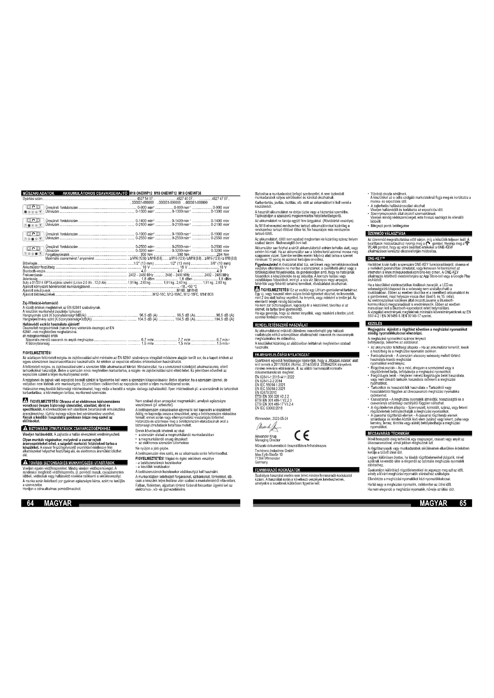 Gyártási szám.................................................................................................. Üresjárati fordulatszám ......................................................... Ütésszám .............................................................................. Üresjárati fordulatszám ......................................................... Ütésszám .............................................................................. Üresjárati fordulatszám ......................................................... Ütésszám .............................................................................. Üresjárati fordulatszám ......................................................... Ütésszám .............................................................................. Forgatónyomaték .................................................................. Maximális csavarméret / anyaméret ..................................... Bitbefogás........................................................................................................ Akkumulátor feszültség ................................................................................... Bluetooth-verzió............................................................................................... Frekvenciasáv ................................................................................................. Jelerősség ....................................................................................................... Súly a 01/2014 EPTA-eljárás szerint (Li-Ion 2,0 Ah...12,0 Ah) ........................ Ajánlott környezeti hőmérséklet munkavégzésnél........................................... Ajánlott akkutípusok ........................................................................................ Ajánlott töltőkészülékek ................................................................................... Zaj-/Vibráció-információ A közölt értékek megfelelnek az EN 62841 szabványnak. A készülék munkahelyi zajszintje tipikusan: Hangnyomás szint (K bizonytalanság=3dB(A)) ............................................... Hangteljesítmény szint (K bizonytalanság=3dB(A)) ........................................ Hallásvédő eszköz használata ajánlott! Összesített rezgésértékek (három irány vektoriális összege) az EN 62841.-nek megfelelően meghatározva. ah rezegésemisszió érték Maximális méretű csavarok és anyák meghúzása ...................................... K bizonytalanság.......................................................................................... FIGYELMEZTETÉS! Olvassa el az elektromos kéziszerszámra vonatkozó összes biztonsági útmutatást, utasítást, ábrát és specifi kációt. A következőkben leírt utasítások betartásának elmulasztása áramütésekhez, tűzhöz és/vagy súlyos testi sérülésekhez vezethet. Kérjük a későbbi használatra gondosan őrizze meg ezeket az előírásokat. BIZTONSÁGI ÚTMUTATÁSOK CSAVAROZÓGÉPEKHEZ Viseljen hallásvédőt. A zajhatás a hallás elvesztését eredményezheti. Olyan munkák végzésekor, melyeknél a csavar rejtett áramvezetékeket érhet, a szigetelt markolati felületeknél tartsa a készüléket. A csavar feszültsgévezető vezetékkel érintkezve fém alkatrészeket helyezhet feszültség alá, és elektromos áramütést idézhet elő. TOVÁBBI BIZTONSÁGI ÉS MUNKAVÉGZÉSI UTASÍTÁSOK Viseljen egyéni védőfelszerelést. Mindig viseljen védőszemüveget. A mindenkor megfelelő védőfelszerelés, pl. porvédő maszk, csúszásmentes lábbeli, védősisak vagy hallásvédő viselése csökkenti a sérülésveszélyt. A munka során keletkező por gyakran egészségre káros, ezért ne kerüljön a szervezetbe Hordjon e célra alkalmas porvédőmaszkot. Nem szabad olyan anyagokat megmunkálni, amelyek egészségre veszélyesek (pl. azbesztet). A betétszerszám elakadásakor azonnal ki kell kapcsolni a készüléket! Addig ne kapcsolja vissza a készüléket, amíg a betétszerszám elakadása fennáll; ennek során nagy ellennyomatékú visszarúgás történhet. Határozza és szüntesse meg a betétszerszám elakadásának okát a biztonsági útmutatások betartása mellett. Ennek következők lehetnek az okai: