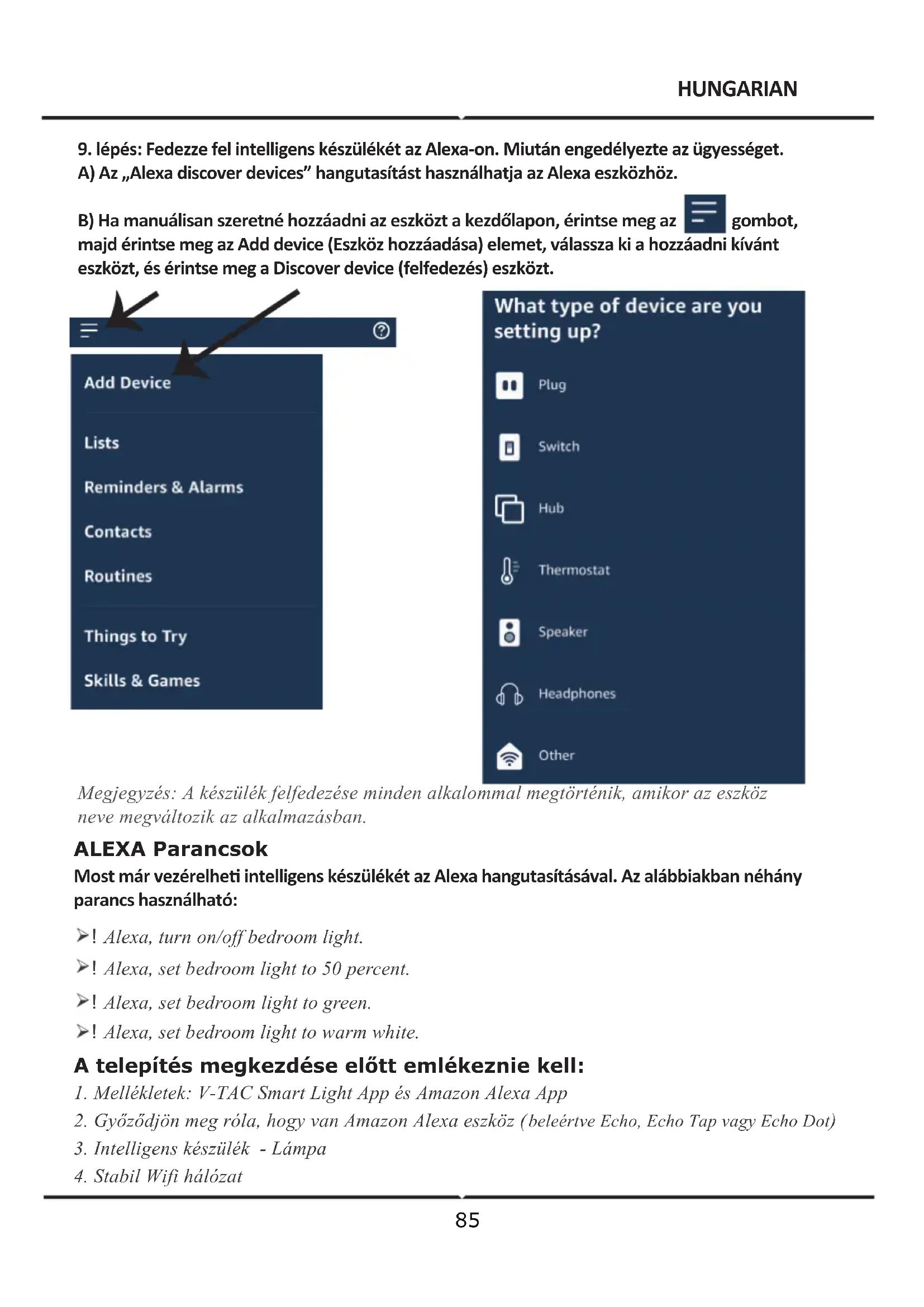 ALEXA Parancsok A telepítés megkezdése előtt emlékeznie kell: ! Alexa, turn on/off bedroom light. ! Alexa, set bedroom light to 50 percent. ! Alexa, set bedroom light to green. ! Alexa, set bedroom light to warm white. 85a.