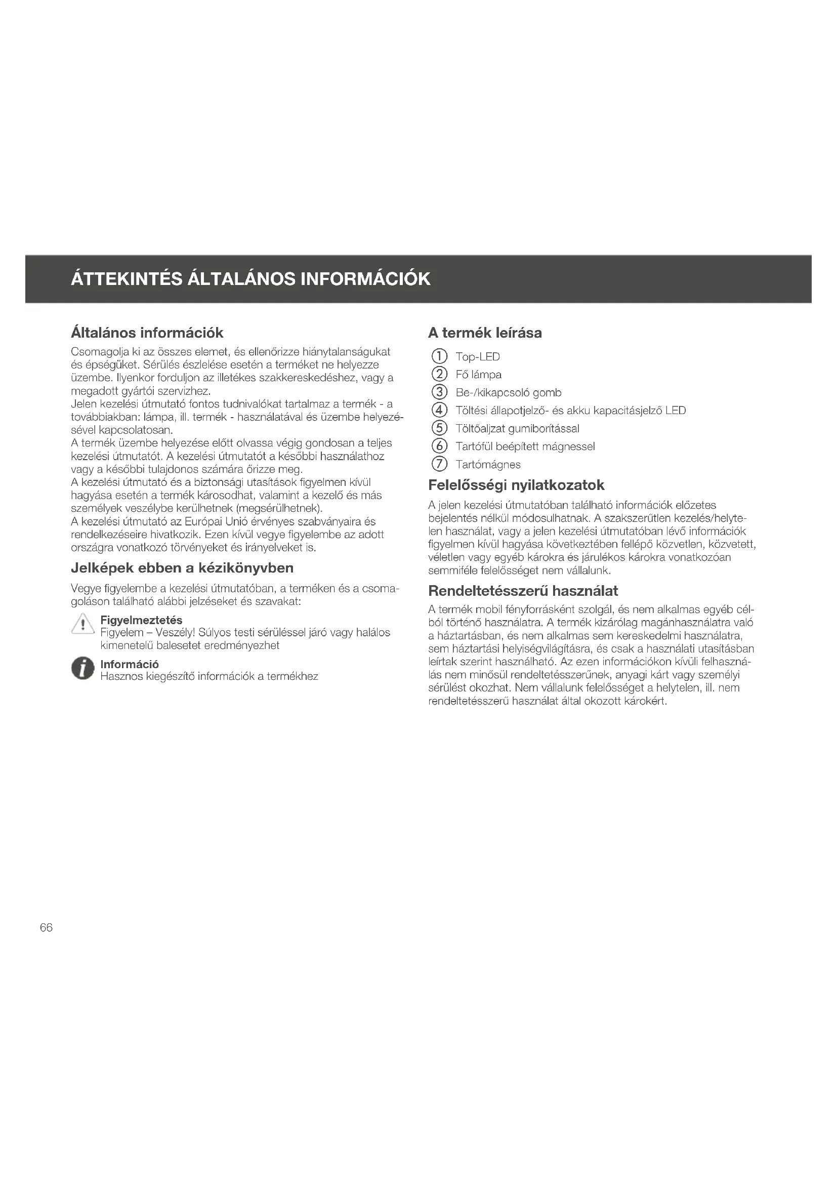 - Baterie a akumulátory můžete bezplatně odevzdat na sběrném místě ve vaší obci/městské části nebo v obchodech, aby se mohly ekologicky zlikvidovat a recyklovat za účelem zpětného získání cenných surovin. V případě nesprávné likvidace se mohou do životního prostředí uvolnit toxické látky, které mohou mít nepříznivé účinky na zdraví lidí, zvířat a rostlin. LIKVIDACE Výrobek splňuje požadavky směrnic EU. Technické změny vyhrazeny. Za tiskové chyby neručíme.HUTARTALOMJEGYZÉK Áttekintés …………………………………………………………………………………… 66 Általános információk …………………………………………………………………………………… 66 Jelképek ebben a kézikönyvben ……………………………………………………………………… 66 Általános információk …………………………………………………………………… 66 A termék leírása ………………………………………………………………………………………… 66 Felelősségi nyilatkozatok ……………………………………………………………………………… 66 Rendeltetésszerű használat ……………………………………………………………………………… 66 Az Ön biztonsága érdekében …………………………………………………………… 67 Általános biztonsági utasítások ………………………………………………………………………… 67 Tűz- és robbanásveszély ………………………………………………………………………………… 68 Általános információk …………………………………………………………………………………… 68 Újratölthető akkumulátor ………………………………………………………………………………… 68 Működés …………………………………………………………………………………… 69 Üzembe helyezés ………………………………………………………………………………………… 69 Ápolás és karbantartás ………………………………………………………………………………… 69 Eltávolítás …………………………………………………………………………………… 69 Környezetvédelmi információk / ártalmatlanítás ……………………………………………………… 69 Lítiumtartalmú elemek és akkumulátorok …………………………………………………………… 6966 ÁTTEKINTÉS ÁLTALÁNOS INFORMÁCIÓK Általános információk Csomagolja ki az összes elemet, és ellenőrizze hiánytalanságukat és épségüket. Sérülés észlelése esetén a terméket ne helyezze üzembe. Ilyenkor forduljon az illetékes szakkereskedéshez, vagy a megadott gyártói szervizhez. Jelen kezelési útmutató fontos tudnivalókat tartalmaz a termék - a továbbiakban: lámpa, ill. termék - használatával és üzembe helyezé- sével kapcsolatosan. A termék üzembe helyezése előtt olvassa végig gondosan a teljes kezelési útmutatót. A kezelési útmutatót a későbbi használathoz vagy a későbbi tulajdonos számára őrizze meg. A kezelési útmutató és a biztonsági utasítások gyelmen kívül hagyása esetén a termék károsodhat, valamint a kezelő és más személyek veszélybe kerülhetnek (megsérülhetnek). A kezelési útmutató az Európai Unió érvényes szabványaira és rendelkezéseire hivatkozik. Ezen kívül vegye gyelembe az adott országra vonatkozó törvényeket és irányelveket is. Jelképek ebben a kézikönyvben Vegye gyelembe a kezelési útmutatóban, a terméken és a csoma- goláson található alábbi jelzéseket és szavakat: Figyelmeztetés Figyelem – Veszély! Súlyos testi sérüléssel járó vagy halálos kimenetelű balesetet eredményezhet Információ Hasznos kiegészítő információk a termékhez A termék leírása a.Top-LED b.Fő lámpa c.Be-/kikapcsoló gomb d.Töltési állapotjelző- és akku kapacitásjelző LED e.Töltőaljzat gumiborítással f.Tartófül beépített mágnessel g.Tartómágnes Felelősségi nyilatkozatok A jelen kezelési útmutatóban található információk előzetes bejelentés nélkül módosulhatnak. A szakszerűtlen kezelés/helyte- len használat, vagy a jelen kezelési útmutatóban lévő információk gyelmen kívül hagyása következtében fellépő közvetlen, közvetett, véletlen vagy egyéb károkra és járulékos károkra vonatkozóan semmiféle felelősséget nem vállalunk. Rendeltetésszerű használat A termék mobil fényforrásként szolgál, és nem alkalmas egyéb cél- ból történő használatra. A termék kizárólag magánhasználatra való a háztartásban, és nem alkalmas sem kereskedelmi használatra, sem háztartási helyiségvilágításra, és csak a használati utasításban leírtak szerint használható. Az ezen információkon kívüli felhaszná- lás nem minősül rendeltetésszerűnek, anyagi kárt vagy személyi sérülést okozhat. Nem vállalunk felelősséget a helytelen, ill. nem rendeltetésszerű használat által okozott károkért.HU