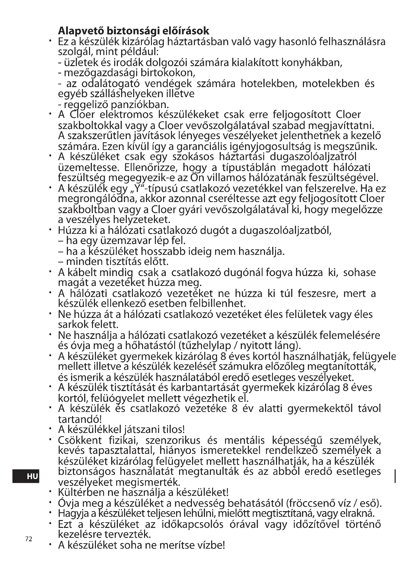 Alapvető biztonsági előírások Ez a készülék kizárólag háztartásban való vagy hasonló felhasználásra szolgál, mint például: - üzletek és irodák dolgozói számára kialakított konyhákban, - mezőgazdasági birtokokon, - az odalátogató vendégek számára hotelekben, motelekben és egyéb szálláshelyeken illetve - reggeliző panziókban. A Cloer elektromos készülékeket csak erre feljogosított Cloer szakboltokkal vagy a Cloer vevőszolgálatával szabad megjavíttatni. A szakszerűtlen javítások lényeges veszélyeket jelenthetnek a kezelő számára. Ezen kívül így a garanciális igényjogosultság is megszűnik. A készüléket csak egy szokásos háztartási dugaszolóaljzatról üzemeltesse. Ellenőrizze, hogy a típustáblán megadott hálózati feszültség megegyezik-e az Ön villamos hálózatának feszültségével. A készülék egy „Y“-típusú csatlakozó vezetékkel van felszerelve. Ha ez megrongálódna, akkor azonnal cseréltesse azt egy feljogosított Cloer szakboltban vagy a Cloer gyári vevőszolgálatával ki, hogy megelőzze a veszélyes helyzeteket. Húzza ki a hálózati csatlakozó dugót a dugaszolóaljzatból, – ha egy üzemzavar lép fel. – ha a készüléket hosszabb ideig nem használja. – minden tisztítás előtt. A kábelt mindig csak a csatlakozó dugónál fogva húzza ki, sohase magát a vezetéket húzza meg. A hálózati csatlakozó vezetéket ne húzza ki túl feszesre, mert a készülék ellenkező esetben felbillenhet. Ne húzza át a hálózati csatlakozó vezetéket éles felületek vagy éles sarkok felett. Ne használja a hálózati csatlakozó vezetéket a készülék felemelésére és óvja meg a hőhatástól (tűzhelylap / nyitott láng). A készüléket gyermekek kizárólag 8 éves kortól használhatják, felügyelet mellett illetve a készülék kezelését számukra előzőleg megtanították, és ismerik a készülék használatából eredő esetleges veszélyeket. A készülék tisztítását és karbantartását gyermekek kizárólag 8 éves kortól, felüógyelet mellett végezhetik el. A készülék és csatlakozó vezetéke 8 év alatti gyermekektől távol tartandó! A készülékkel játszani tilos! Csökkent fizikai, szenzorikus és mentális képességű személyek, kevés tapasztalattal, hiányos ismeretekkel rendelkzeő személyek a készüléket kizárólag felügyelet mellett használhatják, ha a készülék biztonságos használatát megtanulták és az abból eredő esetleges veszélyeket megismerték. Kültérben ne használja a készüléket! Óvja meg a készüléket a nedvesség behatásától (fröccsenő víz / eső). Hagyja a készüléket teljesen lehűlni, mielőtt megtisztítaná, vagy elrakná. Ezt a készüléket az időkapcsolós órával vagy időzítővel történő kezelésre tervezték. A készüléket soha ne merítse vízbe!