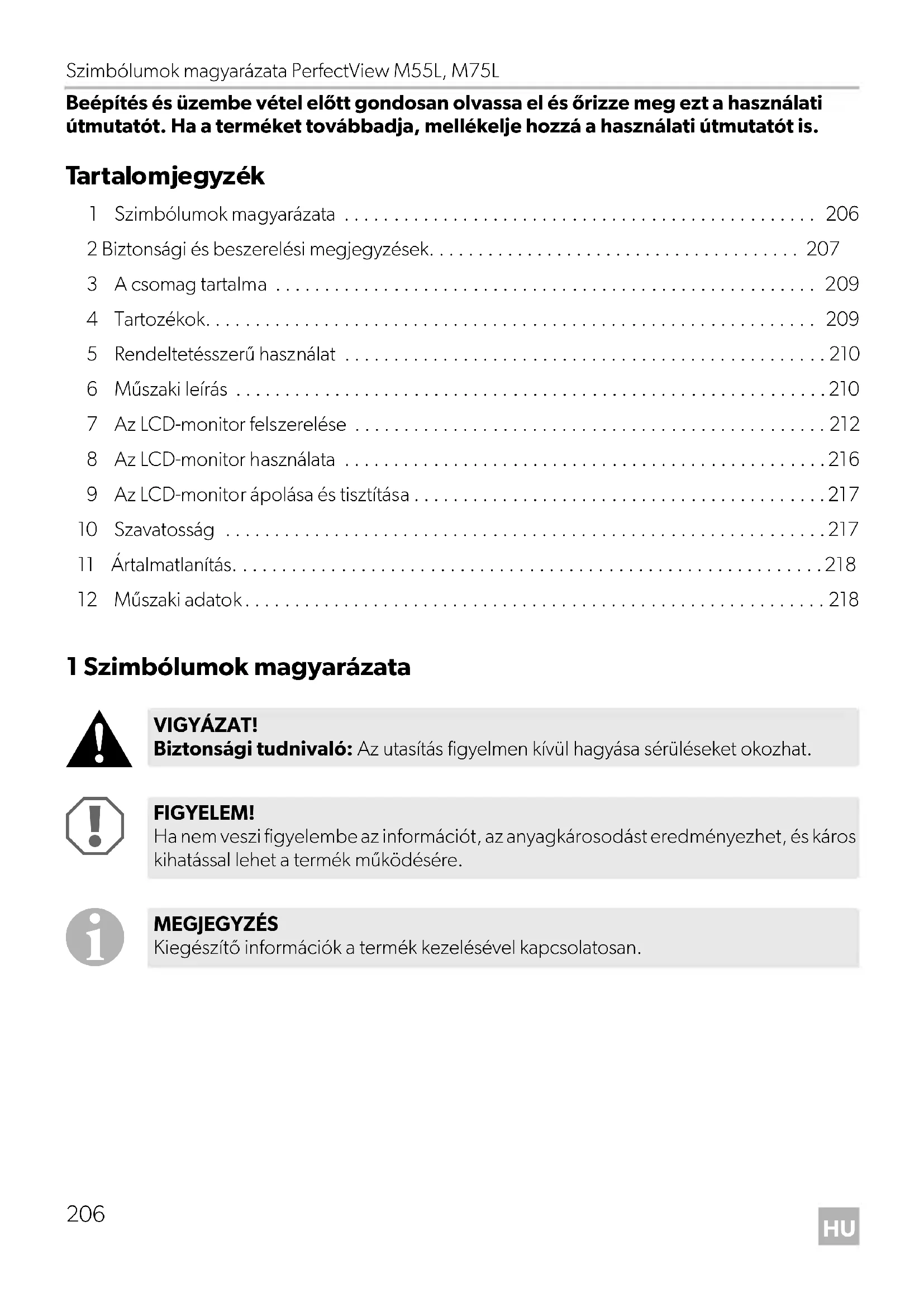 VIGYÁZAT! Biztonsági tudnivaló: Az utasítás figyelmen kívül hagyása sérüléseket okozhat. FIGYELEM! Ha nem veszi figyelembe az információt, az anyagkárosodást eredményezhet, és káros kihatással lehet a termék működésére. MEGJEGYZÉS Kiegészítő információk a termék kezelésével kapcsolatosan. M55L-M75L-IO-16s.book Seite 206 Mittwoch, 20. Dezember 2017 12:32 12PerfectView M55L, M75L Biztonsági és beszerelési megjegyzések