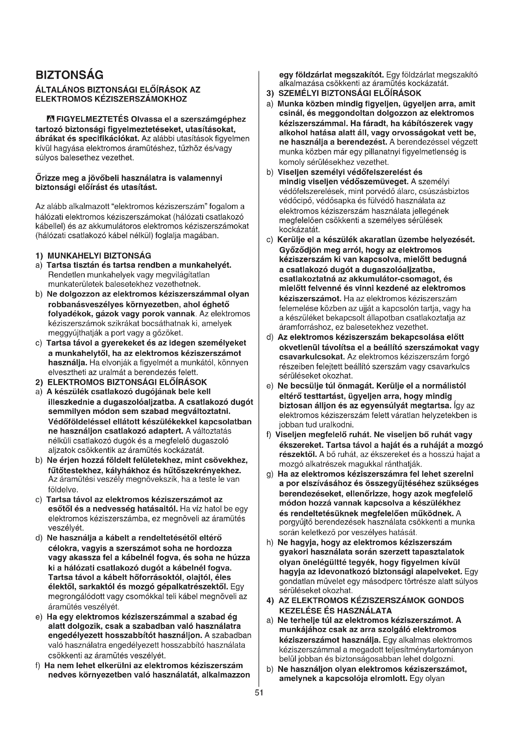 a) Ne terhelje túl az elektromos kéziszerszámot. A munkájához csak az arra szolgáló elektromos kéziszerszámot használja. Egy alkalmas elektromos kéziszerszámmal a megadott teljesítménytartományon belül jobban és biztonságosabban lehet dolgozni. b) Ne használjon olyan elektromos kéziszerszámot, amelynek a kapcsolója elromlott. Egy olyan BIZTONSÁG ÁLTALÁNOS BIZTONSÁGI ELŐÍRÁSOK AZ