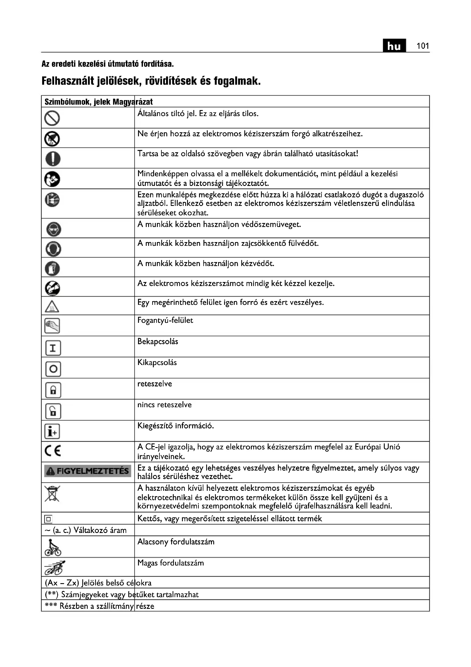 Az eredeti kezelési útmutató fordítása. Felhasznált jelölések, rövidítések és fogalmak. Szimbólumok, jelek Magyarázat Általános tiltó jel. Ez az eljárás tilos. Ne érjen hozzá az elektromos kéziszerszám forgó alkatrészeihez. Tartsa be az oldalsó szövegben vagy ábrán található utasításokat! Mindenképpen olvassa el a mellékelt dokumentációt, mint például a kezelési útmutatót és a biztonsági tájékoztatót. Ezen munkalépés megkezdése előtt húzza ki a hálózati csatlakozó dugót a dugaszoló aljzatból. Ellenkező esetben az elektromos kéziszerszám véletlenszerű elindulása sérüléseket okozhat. A munkák közben használjon védőszemüveget. A munkák közben használjon zajcsökkentő fülvédőt. A munkák közben használjon kézvédőt. Az elektromos kéziszerszámot mindig két kézzel kezelje. Egy megérinthető felület igen forró és ezért veszélyes. Fogantyú-felület Bekapcsolás Kikapcsolás reteszelve nincs reteszelve Kiegészítő információ. A CE-jel igazolja, hogy az elektromos kéziszerszám megfelel az Európai Unió irányelveinek. Ez a tájékozató egy lehetséges veszélyes helyzetre figyelmeztet, amely súlyos vagy halálos sérüléshez vezethet. A használaton kívül helyezett elektromos kéziszerszámokat és egyéb elektrotechnikai és elektromos termékeket külön össze kell gyűjteni és a környezetvédelmi szempontoknak megfelelő újrafelhasználásra kell leadni. Kettős, vagy megerősített szigeteléssel ellátott termék ~ (a. c.) Váltakozó áram Alacsony fordulatszám Magas fordulatszám (Ax – Zx) Jelölés belső célokra (**) Számjegyeket vagy betűket tartalmazhat *** Részben a szállítmány része102