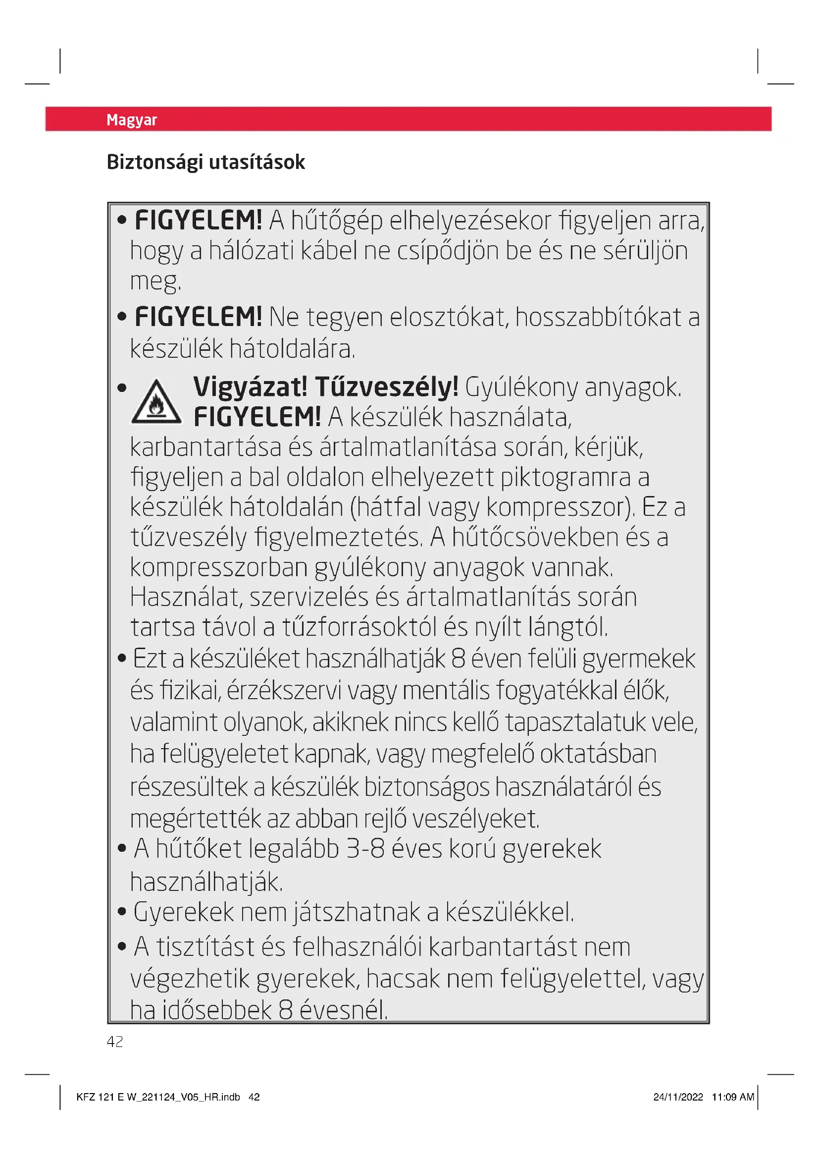 - A tisztítást és felhasználói karbantartást nem végezhetik gyerekek, hacsak nem felügyelettel, vagy ha idősebbek 8 évesnél. KFZ 121 E W_221124_V05_HR.indb 42KFZ 121 E W_221124_V05_HR.indb 42 24/11/2022 11:09 AM24/11/2022 11:09 AMMagyar