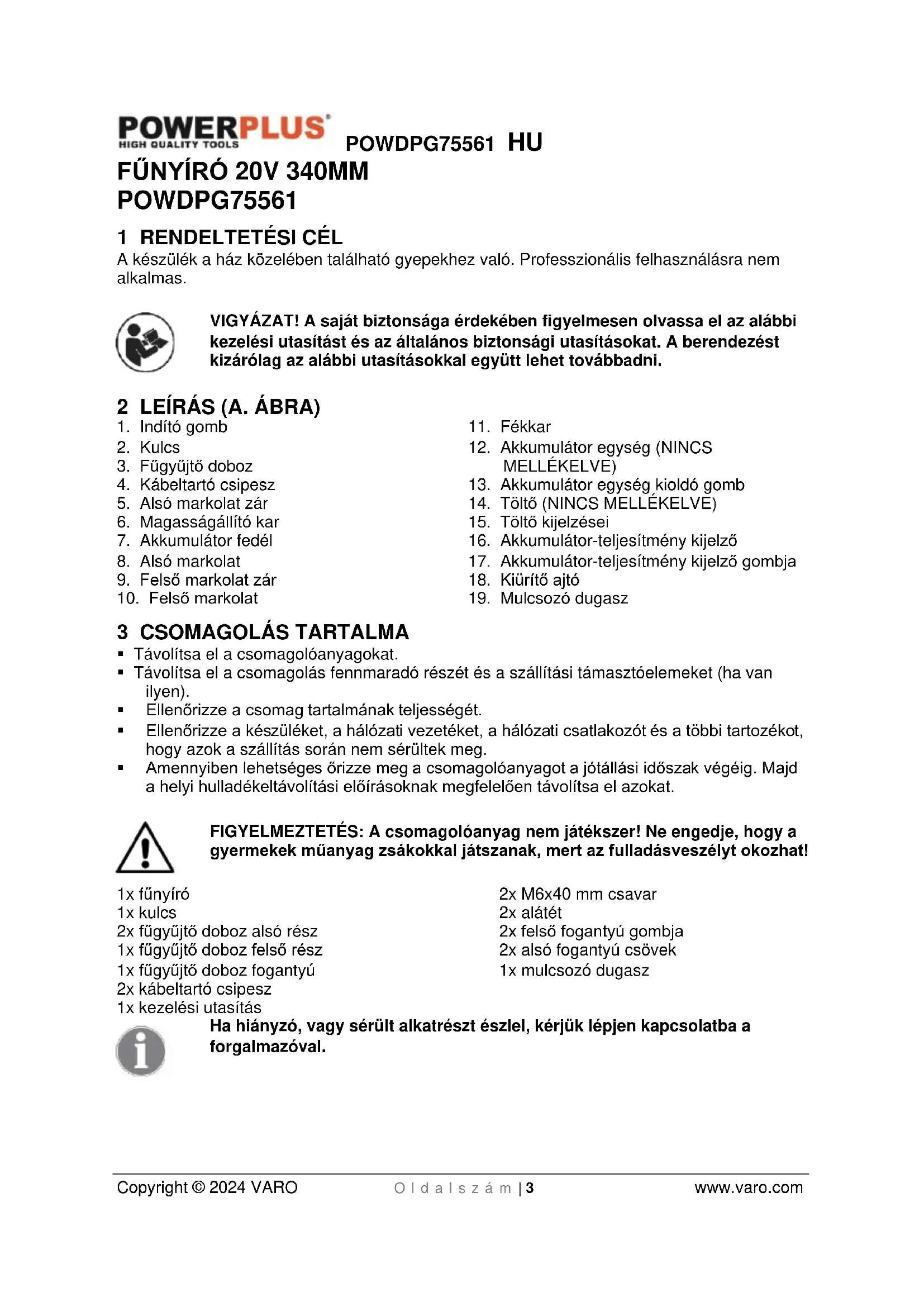 Az akkumulátort és a töltőt csak beltéri helyiségben használja.POWDPG75561 HU Copyright © 2024 VARO O l d a l s z á m | 5 www.varo.com