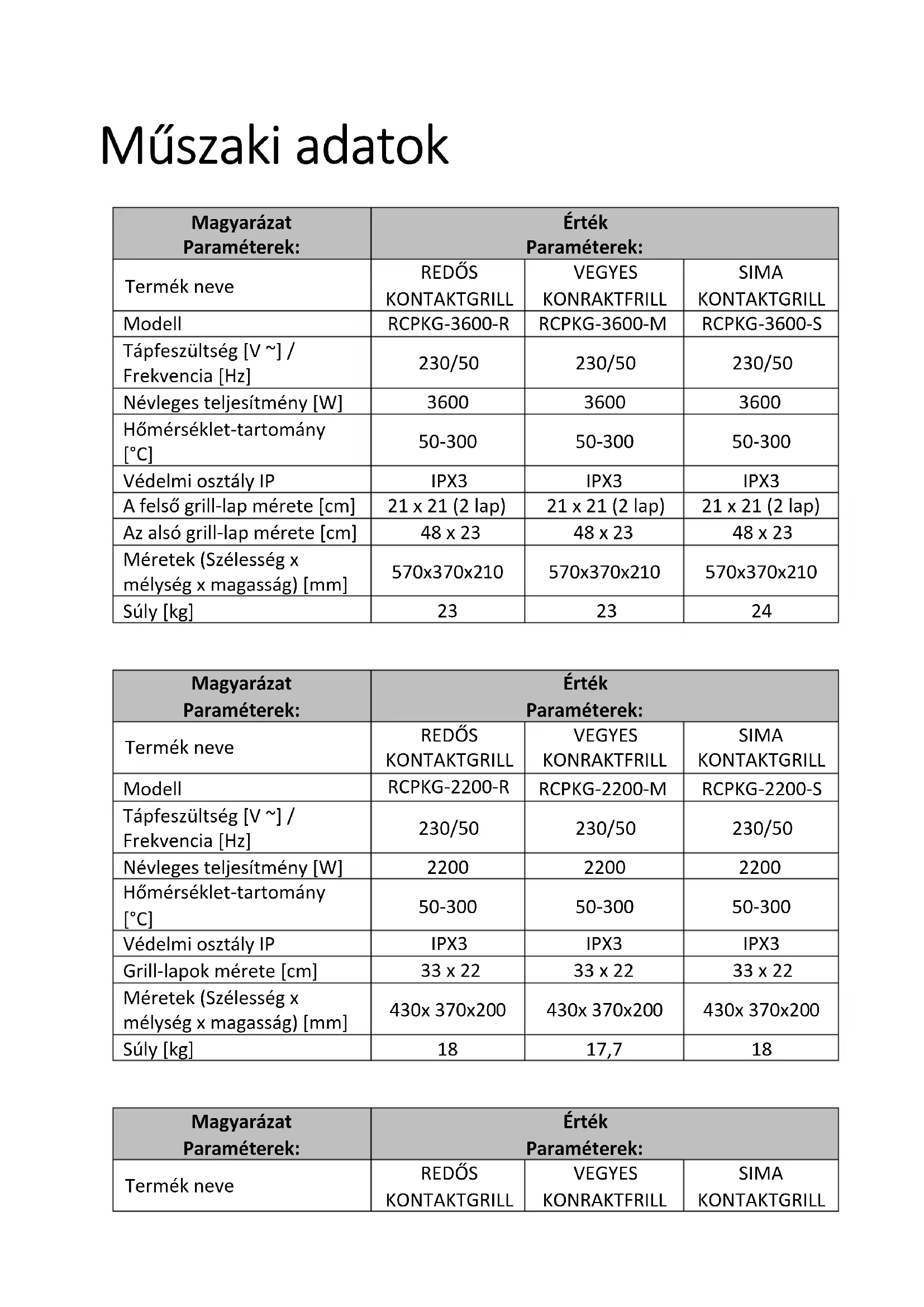 Magyarázat Paraméterek: Érték Paraméterek: Termék neve REDŐS KONTAKTGRILL VEGYES KONRAKTFRILL SIMA KONTAKTGRILLModell RCPKG-1800-R RCPKG-1800-M RCPKG-1800-S Tápfeszültség [V ~] / Frekvencia [Hz] 230/50 230/50 230/50 Névleges teljesítmény [W]