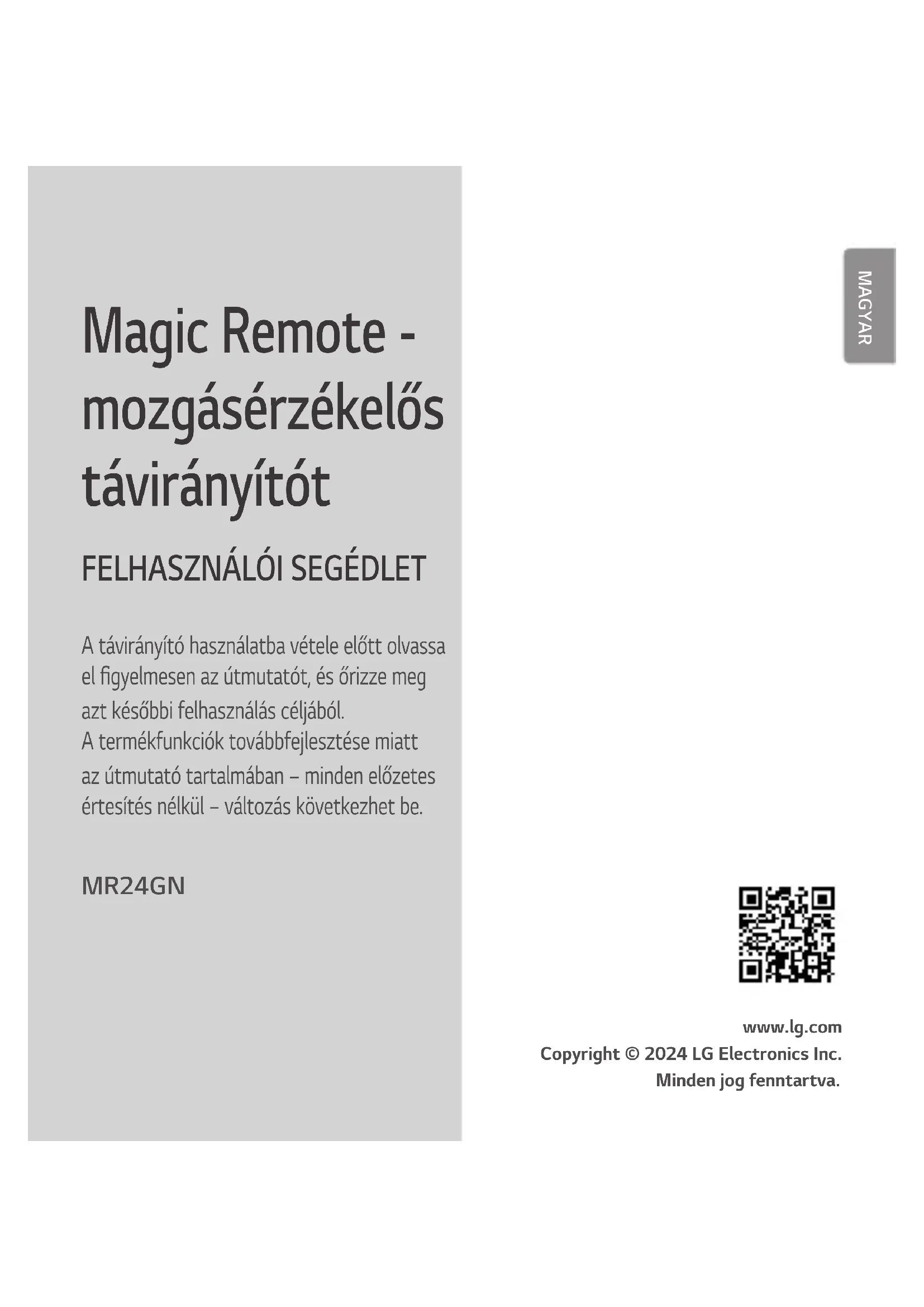 A távirányító használatba vétele előtt olvassa el gyelmesen az útmutatót, és őrizze meg azt későbbi felhasználás céljából. A termékfunkciók továbbfejlesztése miatt az útmutató tartalmában – minden előzetes értesítés nélkül – változás következhet be. MR24GN www.lg.com Copyright © 2024 LG Electronics Inc. Minden jog fenntartva. MAGYAR2 Az útmutató elolvasása előtt