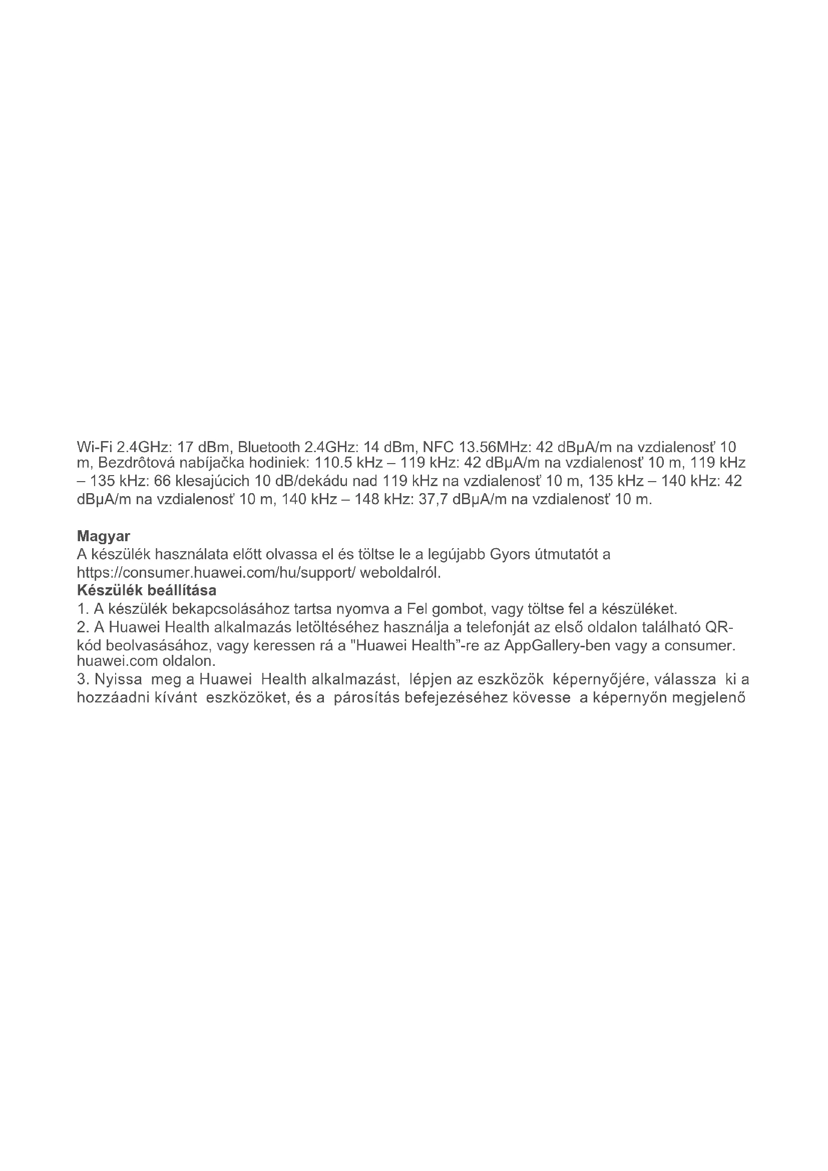- A készüléke megfelel az IP68 (IEC 60529) előírásainak, valamint az 5ATM besorolású ellenállási szintnek. Hulladékkezelési és újrahasznosítási tudnivalók118 A terméken, akkumulátoron, dokumentáción vagy csomagoláson található szimbólum azt jelzi, hogy a terméket és az akkumulátort a helyi hatóságok által kijelölt külön hulladékgyűjtő pontokra kell vinni az élettartamuk végén. Ez biztosítja az EEE hulladékok újrahasznosíthatóságát és kezelését olyan módon, hogy az értékes anyagaik megőrizhetők legyenek, és azoktól az emberi egészség és a környezet megóvható legyen. Bővebb információért kérjük, vegye fel a kapcsolatot a helyi hatóságokkal, a viszonteladóval vagy a háztartási hulladékot kezelő szolgáltatóval, illetve látogasson el a https://consumer.huawei.com/en/ weboldalra. EU előírásoknak való megfelelőség A Huawei Device Co., Ltd. ezennel kijelenti, hogy ez az JNA-B19 készülék megfelel a következő irányelvek rendelkezéseinek: RED 2014/53/EU, RoHS 2011/65/EU. Az EU-megfelelőségi nyilatkozat teljes szövege és a tartozékokra és a szoftverre vonatkozó legfrissebb információk a következő internetcímen állnak rendelkezésre: https://consumer.huawei.com/certication. Rádiófrekvenciás sugárzás hatásával kapcsolatos követelmények118 119 A nemzetközi iránymutatások ajánlása szerint a készülék kialakítása olyan, hogy megfeleljen az azon piac által megállapított határértékeknek, ahol a készülék forgalmazásra kerül. Azokban az országokban, amelyek elfogadják a 10 grammnál több szöveten mért 2,0 W/kg-os (fej) és 4,0W/kg-os (végtagok) SAR-határértéket, a csuklón hordva és az arctól 1,0 cm-es távolságban használva a készülék megfelel a rádiófrekvenciás készülékekre vonatkozó előírásoknak. A legmagasabb mért SAR-érték: SAR-érték a fej esetén: 0.18 W/kg; SAR-érték a végtagok esetén: 0.66 W/kg. Frekvenciasávok és teljesítmény Frekvenciasávok, amelyeken a rádióberendezés üzemel: Bizonyos sávok nem minden országban, illetve régióban érhetők el. További részletekért forduljon a helyi szolgáltatóhoz. Wi-Fi 2.4GHz: 17 dBm, Bluetooth 2.4GHz: 14 dBm, NFC 13.56MHz: 42 dBμA/m 10 méteres távolságban, Vezeték nélküli töltő: 110.5 kHz-119 kHz: 42 dBμA/m 10 méteres távolságban, 119 kHz-135 kHz: 66, 10 dB/dec-cel csökken 119 kHz felett (10 méteres távolságban), 135 kHz-140 kHz: 42 dBμA/m 10 méteres távolságban, 140 kHz-148 kHz: 37,7 dBμA/m 10 méteres távolságban.120 Srpski Pre korišćenja uređaja, pregledajte i preuzmite najnovije Kratko uputstvo na https://consumer.huawei.com/rs/support/. Podesite uređaj