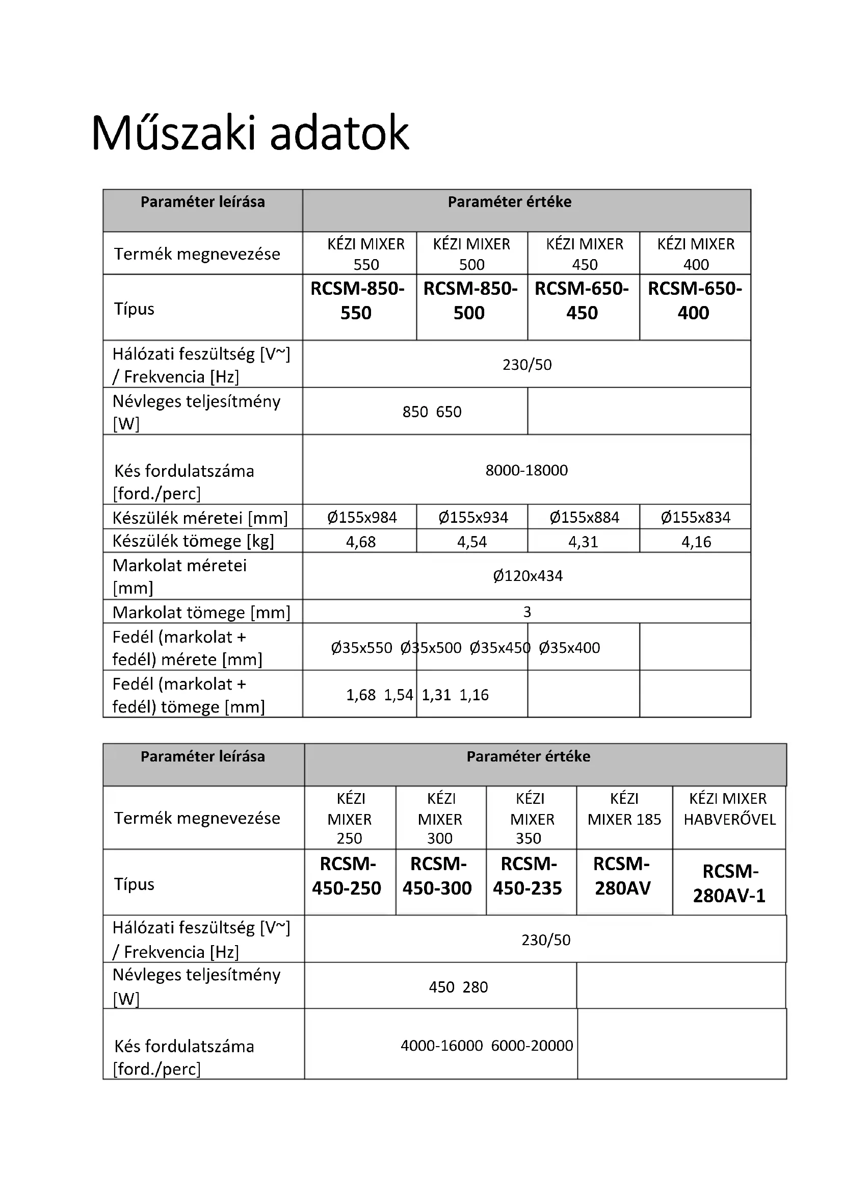 HABVERŐVEL Típus RCSM- 450-250 RCSM- 450-300 RCSM- 450-235 RCSM- 280AV RCSM- 280AV-1 Hálózati feszültség [V~] / Frekvencia [Hz] 230/50 Névleges teljesítmény [W]