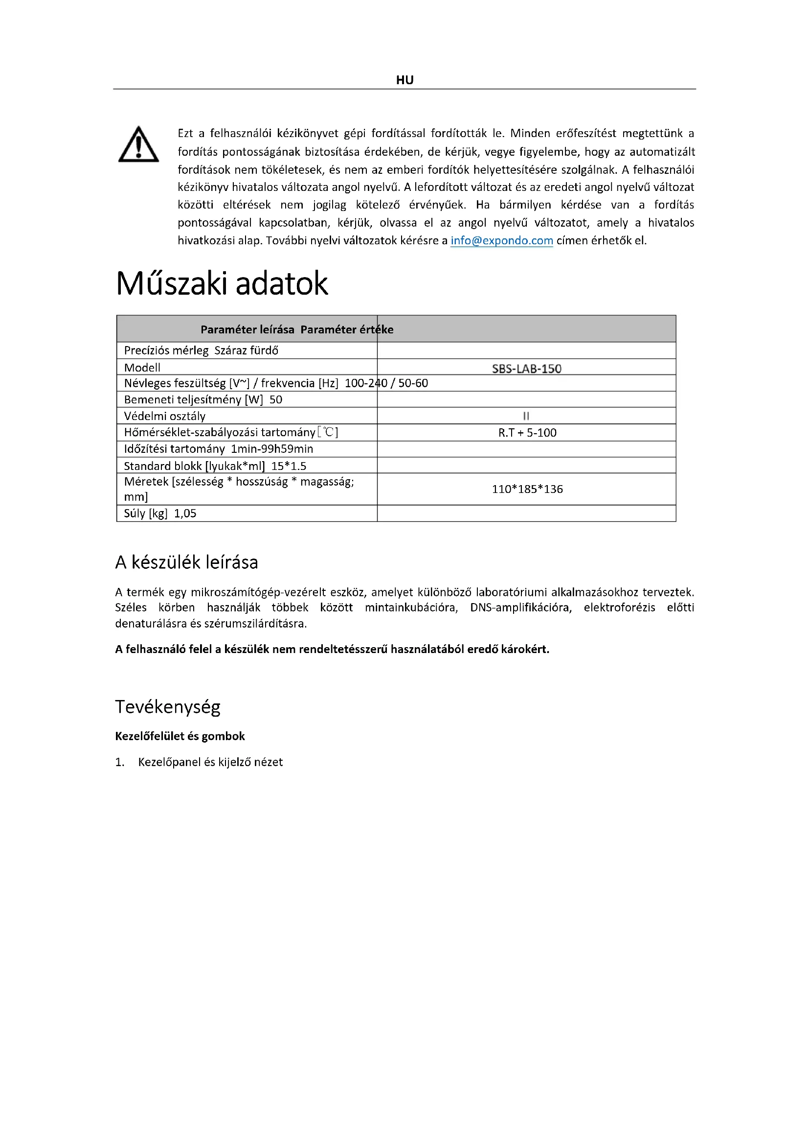 a) Nyomja meg a gombot az S1, S2, S3, S4 és S5 hőmérsékleti pontjainak kombinálásához többpontos csatlakozási programokba, például S1-S2, S1-S2-S2-S3, S1-S2-S3-S3-S4 vagy S1-S2-S3-S3- S4-S5. FIGYELEM! A többpontos program hőmérsékleti pontja csak S1-től indulhat. b) Pl. az S1-S2-S3-S4 csatlakozási program beállításához nyomja meg a gombot. A kijelzőn megjelenik az aktuális konfiguráció, ahol S1 a kezdő csomópont (amely nem módosítható) és S2 a végcsomópont (amely módosítható). Nyomja meg a gombot, hogy S2-t S4-re váltson. Ezután nyomja meg a gombot a beállítás megerősítéséhez. A csomópont konfigurációja S1-4-ként jelenik meg, és a program végigfut az S1-S2-S3-S4 sorrendben. c) Nyomja meg újra a gombot az S1-S2-S3-S3-S4 négypontos csatlakozási program futtatásához.HU A többpontos program működtetése FIGYELEM! A végcsomópont kiválasztása után a gomb megnyomásával közvetlenül futtathatja a többpontos programot. Tisztítás és karbantartás Egy kis mennyiségű vízmentes alkohollal megnedvesített tiszta, puha ruhával tisztítsa meg a műszerblokkok kúpos furatait. Ez biztosítja a teljes érintkezést és a hatékony hővezetést a kémcső és a kúpos lyukak között, miközben megakadályozza a szennyeződést. Ha foltok jelennek meg a készülék felületén, puha ruhával és enyhe tisztítópasztával tisztítsa meg. VIGYÁZAT A készülék tisztítása előtt győződjön meg arról, hogy a tápegység ki van kapcsolva. A tisztítás során NE engedje, hogy tisztítószerek kerüljenek a kúpos furatokba. Kerülje a maró hatású tisztítószerek használatát a műszer felületén. A használt eszközök ártalmatlanítása Ne dobja ezt a készüléket a kommunális hulladékrendszerekbe. Adja át egy elektromos és elektromos készülék újrahasznosító és gyűjtőhelyen. Ellenőrizze a terméken, a használati utasításon és a csomagoláson található szimbólumot. A készülék gyártásához használt műanyagok a jelölésüknek megfelelően újrahasznosíthatók. Azzal, hogy az újrahasznosítást választja, jelentősen hozzájárul környezetünk védelméhez. A helyi újrahasznosító létesítményre vonatkozó információkért forduljon a helyi hatóságokhoz.DA Denne brugervejledning er blevet oversat ved hjælp af maskinoversættelse. Vi har gjort alt for at sikre, at oversættelsen er nøjagtig, men vær opmærksom på, at automatiserede oversættelser ikke er perfekte og ikke er beregnet til at erstatte menneskelige oversættere. Den officielle version af brugervejledningen er på engelsk. Eventuelle forskelle mellem den oversatte version og den oprindelige engelske er ikke juridisk bindende. Hvis du har spørgsmål om nøjagtigheden af oversættelsen, bedes du henvise til den engelske version, som er den officielle reference. Flere sprogversioner er tilgængelige efter anmodning via info@expondo.com. Tekniske data Parameterbeskrivelse Parameterværdi Produktnavn Tørt bad Model Nominel spænding [V~] / frekvens [Hz] 100-240 / 50-60 Indgangseffekt [W] 50 Beskyttelsesklasse Temperaturkontrolområde[℃] R.T + 5-100 Tidsinterval 1min-99h59min Standardblok [huller*ml] 15*1.5 Dimensioner [bredde * længde * højde; mm]. 110*185*136 Vægt [kg] 1,05 Beskrivelse af apparatet Produktet er en mikrocomputerstyret enhed, der er designet til en række forskellige laboratorieanvendelser. Det bruges i vid udstrækning til inkubation af prøver, DNA-amplifikation, elektroforesefordenaturering og størkning af serum, blandt andre procedurer. Brugeren er ansvarlig for eventuelle skader som følge af utilsigtet brug af enheden. Handling Betjeningsgrænseflade og knapper