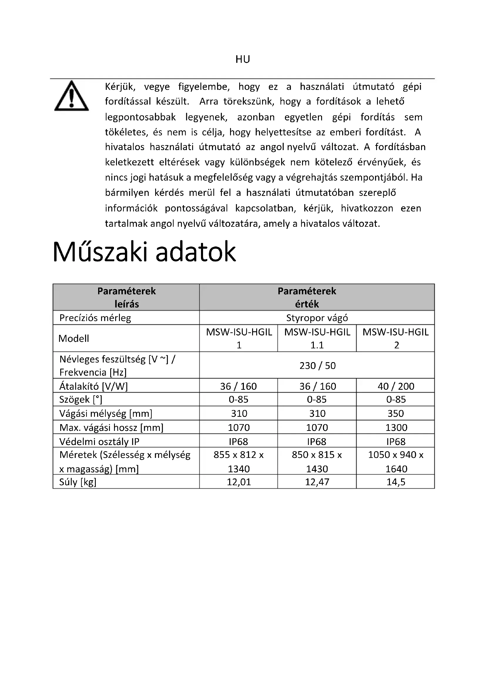 Súly [kg] 12,01 12,47 14,5HU Paraméterek A készülék leírása Paraméterek érték Precíziós mérleg Styropor vágó Modell MSW-ISU-HGIL