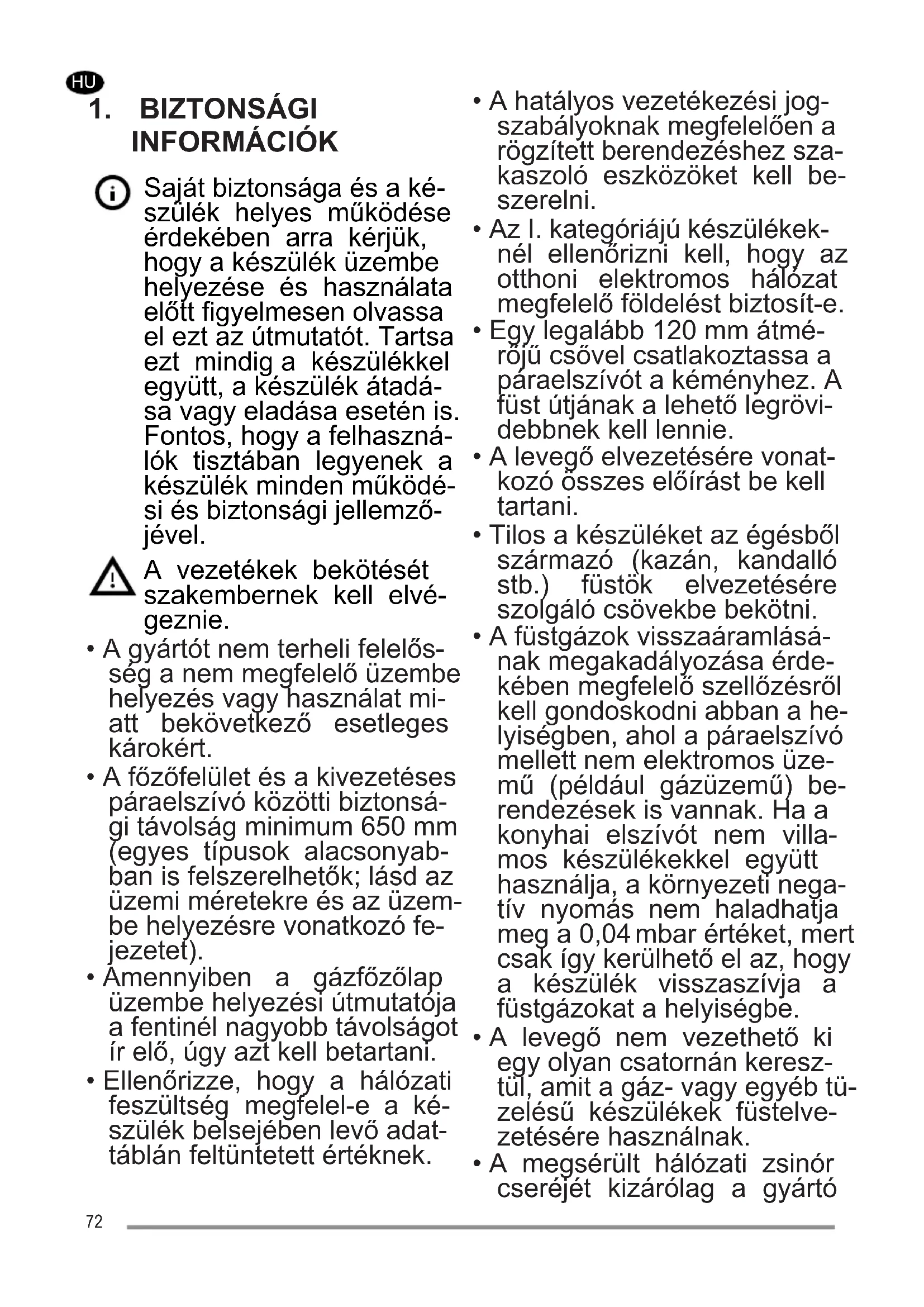 - A füstgázok visszaáramlásá- nak megakadályozása érde- kében megfelelő szellőzésről kell gondoskodni abban a he- lyiségben, ahol a páraelszívó mellett nem elektromos üze- mű (például gázüzemű) be- rendezések is vannak. Ha a konyhai elszívót nem villa- mos készülékekkel együtt használja, a környezeti nega- tív nyomás nem haladhatja meg a 0,04 mbar értéket, mert csak így kerülhető el az, hogy a készülék visszaszívja a füstgázokat a helyiségbe.