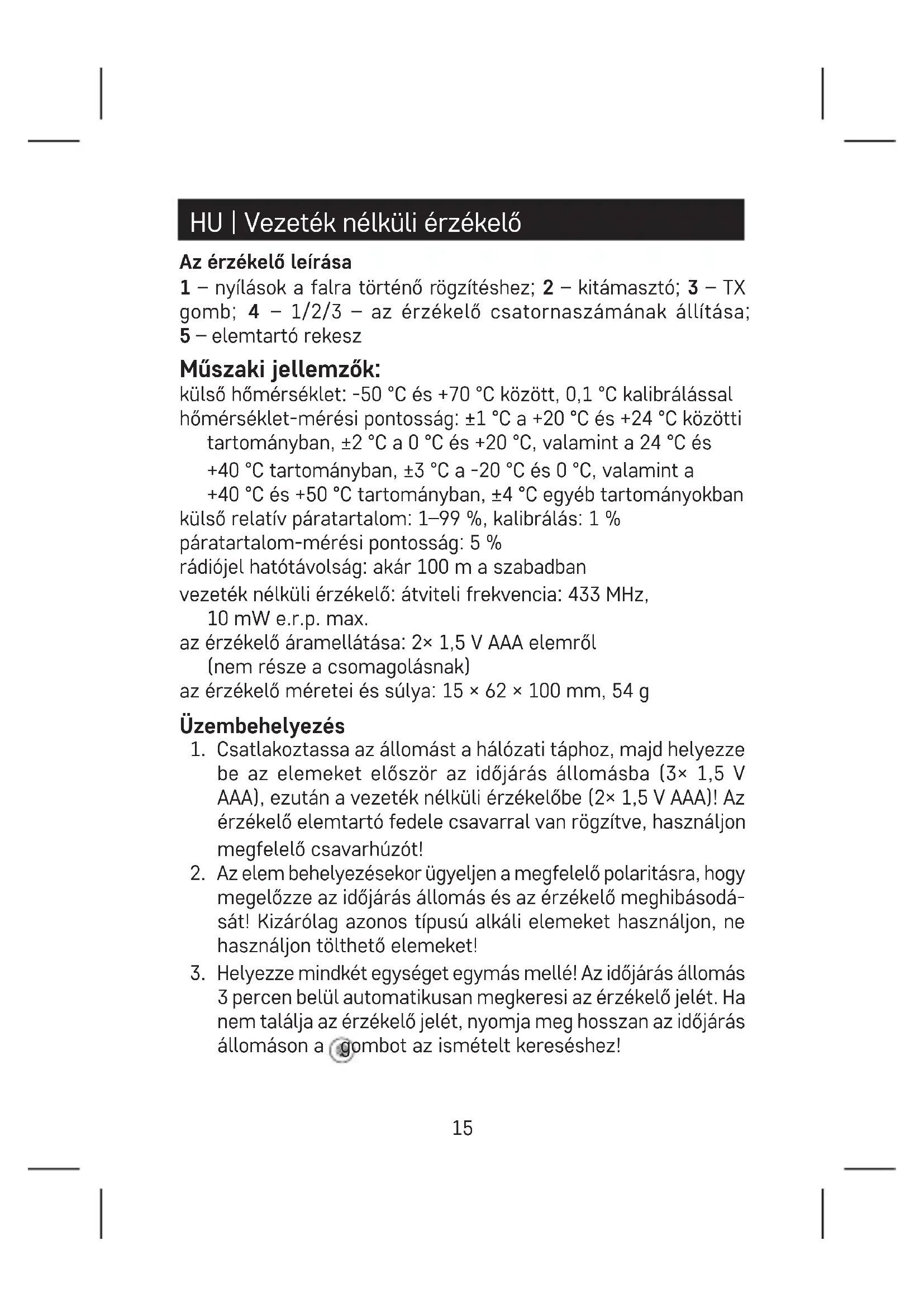 HU | Vezeték nélküli érzékelő Az érzékelő leírása 1 – nyílások a falra történő rögzítéshez; 2 – kitámasztó; 3 – TX gomb; 4 – 1/2/3 – az érzékelő csatornaszámának állítása; 5 – elemtartó rekesz Műszaki jellemzők: külső hőmérséklet: -50 °C és +70 °C között, 0,1 °C kalibrálással hőmérséklet-mérési pontosság: ±1 °C a +20 °C és +24 °C közötti tartományban, ±2 °C a 0 °C és +20 °C, valamint a 24 °C és +40 °C tartományban, ±3 °C a -20 °C és 0 °C, valamint a +40 °C és +50 °C tartományban, ±4 °C egyéb tartományokban külső relatív páratartalom: 1–99 %, kalibrálás: 1 % páratartalom-mérési pontosság: 5 % rádiójel hatótávolság: akár 100 m a szabadban vezeték nélküli érzékelő: átviteli frekvencia: 433 MHz, 10 mW e.r.p. max. az érzékelő áramellátása: 2× 1,5 V AAA elemről (nem része a csomagolásnak) az érzékelő méretei és súlya: 15 × 62 × 100 mm, 54 g Üzembehelyezés
