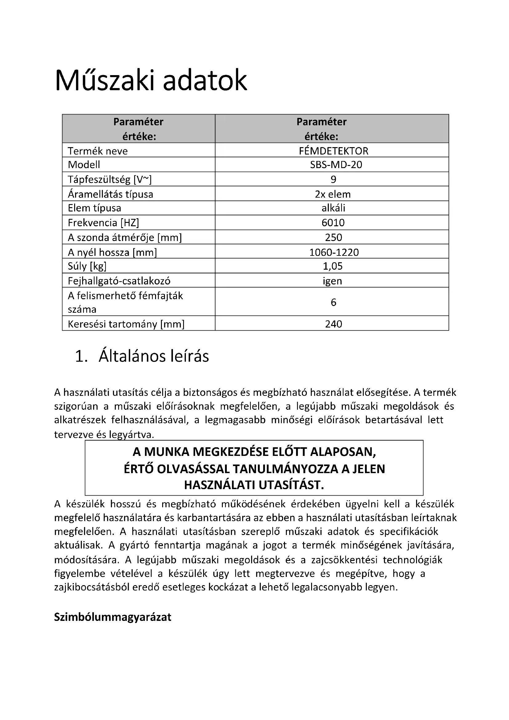 A figyelmeztetésekben és a használati utasításban szereplő „készülék” vagy „termék” kifejezés a <FÉMDETEKTOR>-ra vonatkozik. 2.1. Munkahelyre vonatkozó biztonsági szabályok a) Ha bizonytalan abban, hogy a termék megfelelően működik-e, vagy sérülést észlel, lépjen kapcsolatba a gyártó szervizével. b) A készüléket csak a gyártó szervize javíthatja. Tilos önálló javításokat végezni a terméken!c) Minden csomagolóanyagot (műanyag zacskó, karton, polisztirol stb.) gyermekektől elzárva kell tartani, mivel potenciális veszélyforrást jelentenek, és az érvényben lévő előírások szerint kell ártalmatlanítani a készülék használatának helyén. 2.2. A készülék biztonságos használata a) A készülékek javítását és karbantartását csak szakképzett személyek végezhetik, kizárólag eredeti cserealkatrészek használatával. Ez biztosítja a biztonságos használatot. b) A készülék működési integritásának biztosítása érdekében tilos eltávolítani a gyári burkolatot vagy a csavarokat. c) A használati utasítást meg kell őrizni, később is szükség lehet rá. Ha a készüléket átadja egy következő tulajdonosnak, a használati utasítást is mindenképpen a termékkel együtt át kell adni. d) A készülék nem játék. Nem szabad megengedni, hogy gyermekek játszanak a készülékkel. e) Tilos módosítani a készülék felépítését paramétereinek vagy kialakításának megváltoztatása érdekében. f) Tartsa távol a készülékeket tűztől és más hőforrásoktól. g) A nem újratölthető elemeket nem szabad újratölteni. h) Különböző típusú elemeket, valamint régi és használt elemeket nem szabad keverni.