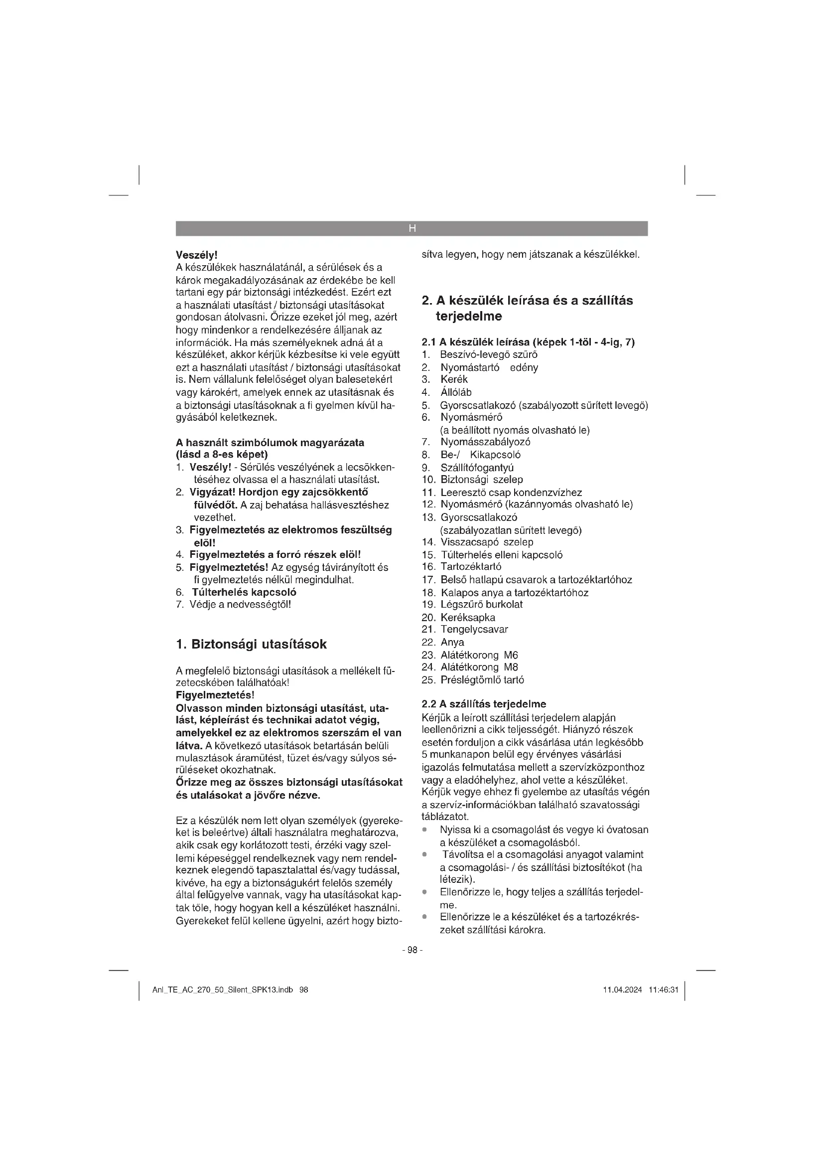 A keszülékek hasznalatánál, a sérlüleşk és a károk megakadályozásanak az erdekébe kell tartani egy párBiztonsági intezkedest. Ezert ezt a hasznalati utasitast/biztonsági utasitásokat gondosan átolvasni. Orizzé ezeket jol meg, azert hogy mindenkor a rendelkezésere alljanak az informaciók. Ha mas személynek adná à t keszüléket, akkar kérjuk kézbesitse kei vele egytt ezt a hasznalati utasitast/biztonsági utasitásokat is. Nem vällalunk feleloseg oyan balesetekert vagy károkert, amelyek ennek az utasitásnak és abiztonsági utasitásoknak a fi gyelmen kivül hagyásaból keletkeznek.