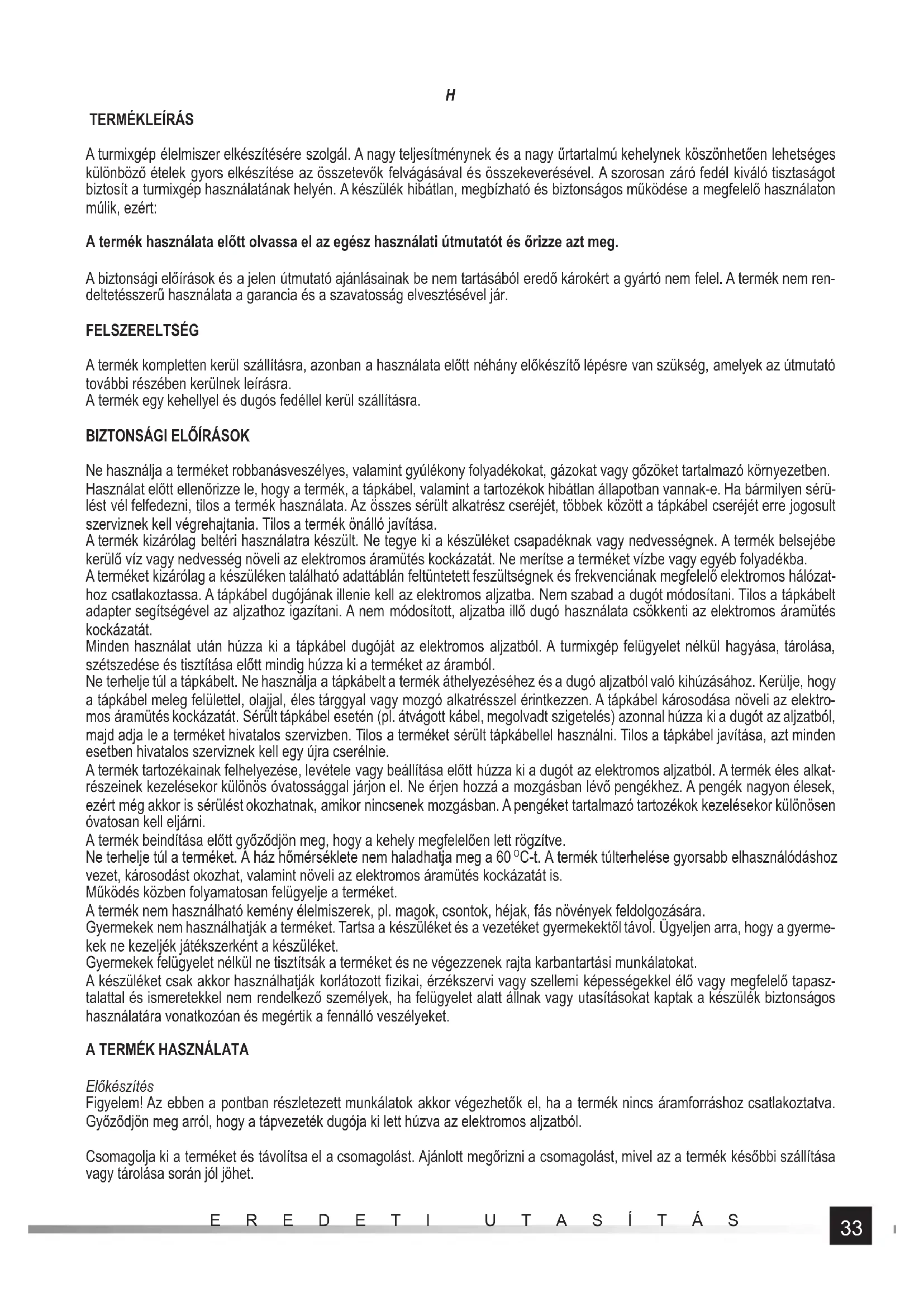 A turmixgép élelmiszer elkészítésére szolgál. A nagy teljesítménynek és a nagy űrtartalmú kehelynek köszönhetően lehetséges különböző ételek gyors elkészítése az összetevők felvágásával és összekeverésével. A szorosan záró fedél kiváló tisztaságot biztosít a turmixgép használatának helyén. A készülék hibátlan, megbízható és biztonságos működése a megfelelő használaton múlik, ezért: A termék használata előtt olvassa el az egész használati útmutatót és őrizze azt meg. A biztonsági előírások és a jelen útmutató ajánlásainak be nem tartásából eredő károkért a gyártó nem felel. A termék nem ren- deltetésszerű használata a garancia és a szavatosság elvesztésével jár. FELSZERELTSÉG A termék kompletten kerül szállításra, azonban a használata előtt néhány előkészítő lépésre van szükség, amelyek az útmutató további részében kerülnek leírásra. A termék egy kehellyel és dugós fedéllel kerül szállításra.