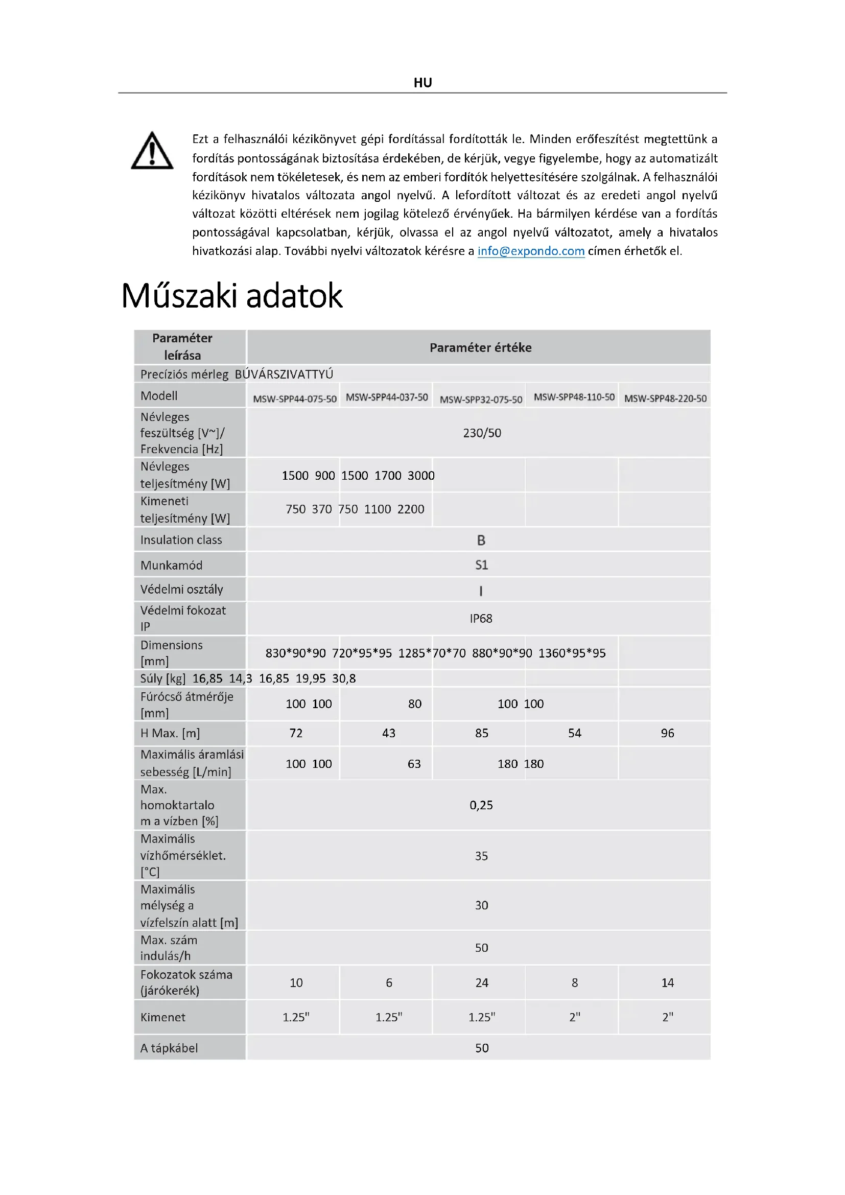 A szivattyú bekapcsolásához állítsa a be-/kikapcsolót a bekapcsoló állásba. Ha a túláramvédelmi megszakító rövidzárlat, túlmelegedés stb. miatt oldódik ki, a probléma (a túláramvédelmi megszakító kioldásának oka) elhárítása után oldja ki a megszakítót a kezelőpanel házán lévő megszakító gomb megnyomásával.HU Szedje szét a szivattyút Azokon a területeken, ahol a hőmérséklet nulla fok alá csökken, szerelje le a szivattyút a téli szezonra, és tárolja a "szállítás és tárolás" című fejezetben szereplő irányelvek szerint. A szivattyú szétszerelése: Állítsa a be-/kikapcsolót kikapcsolt ("0") állásba. Húzza ki a szivattyút az áramforrásból. Húzza ki a szivattyút a fúrt kútból a szivattyú fogantyújához rögzített acél vagy más biztonságos kötél segítségével. Csatlakoztassa le a vízszállító csövet a szivattyúról. Ürítse ki a szivattyúban maradt vizet a szivattyú fejjel lefelé fordításával. Ha a szivattyú megszáradt, készen áll a biztonságos tárolásra. Szállítás és tárolás A készülék szállításakor meg kell akadályozni a rázást, az ütközést és a fejjel lefelé fordítást. Megfelelően szellőző, száraz levegőjű, maró gázoktól mentes helyen tárolja. A készüléket nulla fok feletti környezeti hőmérsékleten, vízszintes helyzetben tárolja. Ha a szivattyút néhány napnál hosszabb ideig tárolták, az újbóli beszerelés előtt győződjön meg a készülék megfelelő működéséről. Tisztítás és karbantartás Tisztítás előtt mindig húzza ki a készüléket a hálózatból. Használjon maró hatású anyagokat nem tartalmazó tisztítószert az egyes felületek tisztításához. Minden használat után tiszta vízzel és puha ruhával tisztítsa meg a készüléket a szerves lerakódásoktól. A készüléket száraz, hűvös, nedvességtől és közvetlen napfénytől védett helyen tárolja. A készülék rendszeres ellenőrzése Rendszeresen ellenőrizze, hogy a készülék nem sérült-e meg. Sérülés esetén kérjük, azonnal hagyja abba a használatát, és forduljon az ügyfélszolgálathoz a probléma megoldása érdekében. Mi a teendő probléma esetén? Kérjük, vegye fel a kapcsolatot az ügyfélszolgálattal, és készítse elő a következő információkat: A számla száma és a sorozatszám (ez utóbbi a készüléken található műszaki táblán található). Ha szükséges, készítsen fényképet a sérült, törött vagy hibás alkatrészről. Az ügyfélszolgálati asszisztensnek könnyebb lesz meghatározni a probléma forrását, ha részletesen és pontosan leírja a problémát. Minél részletesebb információkat ad meg, annál jobban tudja az ügyfélszolgálat gyorsan és hatékonyan megoldani a problémáját!HU VIGYÁZAT! Soha ne nyissa ki a készüléket az ügyfélszolgálat engedélye nélkül. Ez a garancia elvesztéséhez vezethet! Használt eszközök ártalmatlanítása Ne dobja ezt a készüléket a kommunális hulladékrendszerekbe. Adja át egy elektromos és elektromos készülék újrahasznosító és gyűjtőhelyen. Ellenőrizze a terméken, a használati utasításon és a csomagoláson található szimbólumot. A készülék gyártásához használt műanyagok a jelölésüknek megfelelően újrahasznosíthatók. Azzal, hogy az újrahasznosítást választja, jelentősen hozzájárul környezetünk védelméhez. A helyi újrahasznosító létesítményre vonatkozó információkért forduljon a helyi hatóságokhoz. Hibaelhárítás Probléma Lehetséges ok Megoldás A készülék nem indul el A túláram-megszakító kioldott Hozza helyre a megszakító kioldásának okát. Várja meg, amíg a motor lehűl. Állítsa vissza a megszakítót az eredeti helyzetbe. Nincs áram Győződjön meg róla, hogy a tápkábel megfelelően csatlakoztatva van. Sérült motor vagy tápkábel Hívja ügynökét vagy szakképzett szakembert. A készülék elindul, de nem pumpál / csak kevés vizet pumpál A vízellátás eltömődött Távolítsa el a dugulást. Szivárgó vízcsatlakozások Zárja le a csatlakozásokat. Elégtelen vízszint a fúrt kútban Ellenőrizze a vízszintet. A szivattyúnak legalább 2 m-rel a vízfelszín alatt kell lennie. Vízszállító fej túl magas A szivattyút a műszaki specifikációnak megfelelően telepítse.DA Denne brugervejledning er blevet oversat ved hjælp af maskinoversættelse. Vi har gjort alt for at sikre, at oversættelsen er nøjagtig, men vær opmærksom på, at automatiserede oversættelser ikke er perfekte og ikke er beregnet til at erstatte menneskelige oversættere. Den officielle version af brugervejledningen er på engelsk. Eventuelle forskelle mellem den oversatte version og den oprindelige engelske er ikke juridisk bindende. Hvis du har spørgsmål om nøjagtigheden af oversættelsen, bedes du henvise til den engelske version, som er den officielle reference. Flere sprogversioner er tilgængelige efter anmodning via info@expondo.com. Tekniske data Parameterbes krivelse Parameterværdi Produktnavn DYKPUMPE Model Nominel spænding [V~]/ Frekvens [Hz] 230/50 Nominel effekt[W]