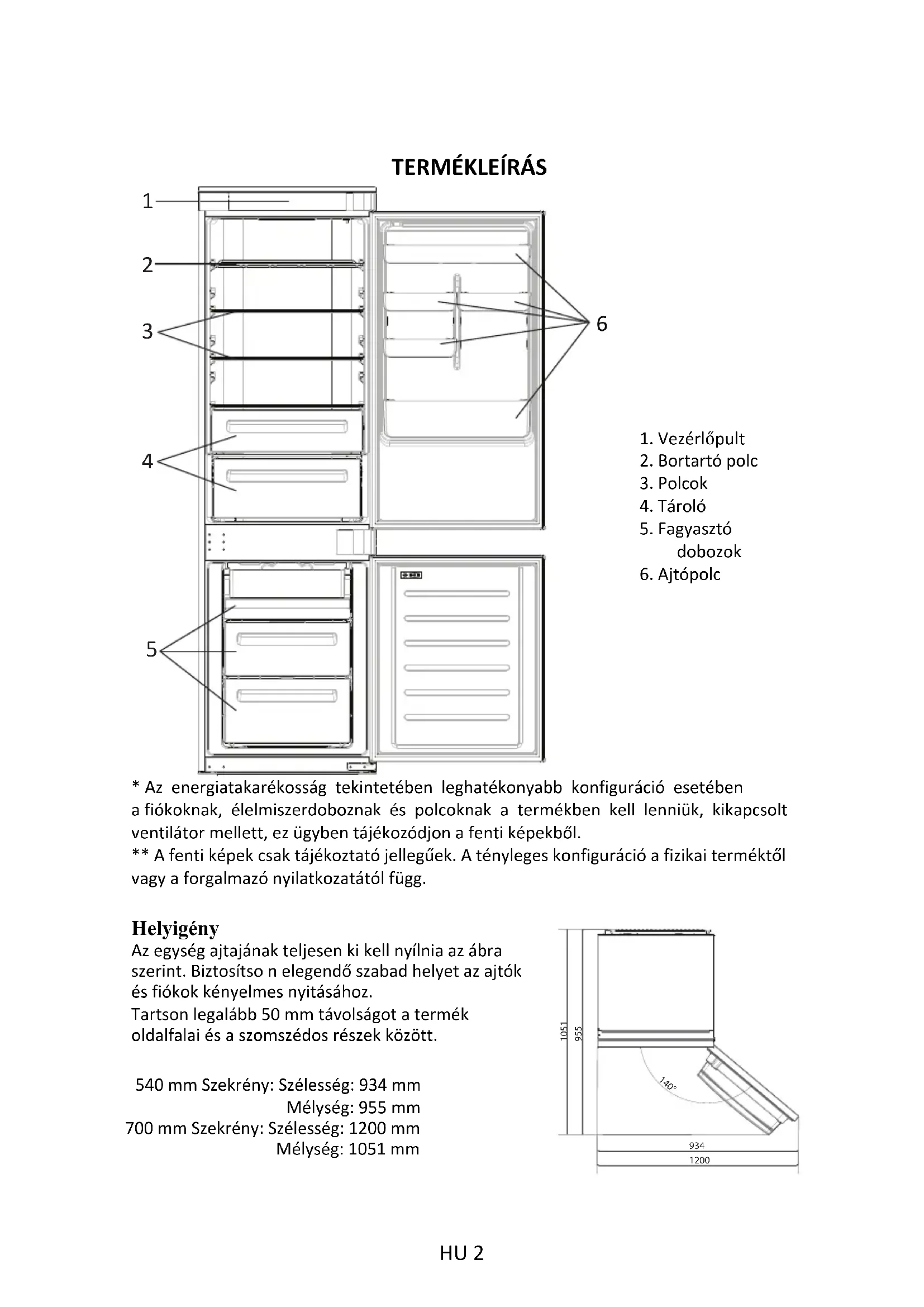 1. Vezérlőpult2. Bortartó polc3. Polcok4. Tároló5. Fagyasztódobozok6. Ajtópolc* Az energiatakarékosság tekintetében leghatékonyabb konfiguráció esetébena fiókoknak, élelmiszerdoboznak és polcoknak a termékben kell lenniük, kikapcsoltventilátor mellett, ez ügyben tájékozódjon a fenti képekből.** A fenti képek csak tájékoztató jellegűek. A tényleges konfiguráció a fizikai terméktőlvagy a forgalmazó nyilatkozatától függ.Helyigény Az egység ajtajának teljesen ki kell nyílnia az ábra szerint. Biztosítso n elegendő szabad helyet az ajtók és fiókok kényelmes nyitásához. Tartson legalább 50 mm távolságot a termék oldalfalai és a szomszédos részek között. 540 mm Szekrény: Szélesség: 934 mmMélység: 955 mm700 mm Szekrény: Szélesség: 1200 mmMélység: 1051 mm