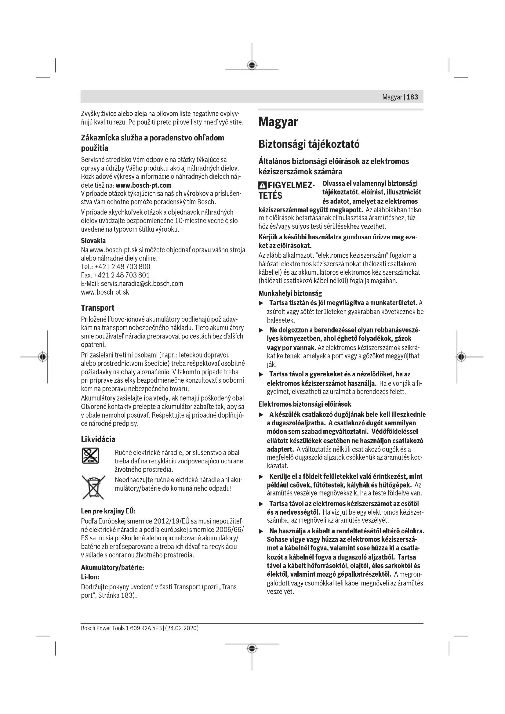 Pomocou vodiacej lišty (41) môžete vykonať priamočiare rezy. Priľnavý povlak zabraňuje skĺznutiu vodiacej lišty achráni povrch obrobku. Priľnavý povrch povlaku vodiacej lišty umožňuje ľahké kĺzanie ručného elektrického náradia. Nasaďte pílový kotúč priamo na vodiacu koľajnicu (41). Upevnite vodiacu koľajnicu (41) vhodnými upínacími pros- triedkami, napr. skrutkovými zvierkami, na obrobok tak, aby úzke rameno vodiacej lišty (41) smerovalo kpílovému kotú- ču. Vodiaca lišta (41) nesmie na narezávanej strane obrobku prečnievať. Zapnite ručné elektrické náradie arovnomerným pohybom amiernym posuvom ho posúvajte vsmere rezu. Spojovacím prvkom (43) môžete spojiť vodiace lišty. Upev- nenie sa uskutoční pomocou štyroch skrutiek, ktoré sa na- chádzajú vspojovacom prvku. Drážka (44) je vhodná pre systémy vodiacich líšt Bosch aMafell. Drážka (45) je vhodná pre systémy vodiacich líšt Festool aMakita. Pokyny na optimálne zaobchádzanie sakumulátorom Chráňte akumulátor pred vlhkosťou avodou. Akumulátor skladujte iba pri teplote vrozsahu od –20°C do 50°C. Nenechávajte akumulátor napríklad vlete položený vautomobile. Príležitostne vyčistite vetracie štrbiny akumulátora čistým, mäkkým asuchým štetcom. Výrazne skrátená doba prevádzky akumulátora po nabití sig- nalizuje, že akumulátor je opotrebovaný atreba ho vymeniť za nový. Dodržiavajte upozornenia týkajúce sa likvidácie. Údržba aservis Údržba ačistenie u Pred všetkými prácami na elektrickom náradí (naprí- klad údržba, výmena nástroja apodobne), ako aj pri jeho preprave auskladnení vyberte akumulátor zelektrického náradia. Vprípade neúmyselného aktivo- vania vypínača hrozí nebezpečenstvo poranenia. u Elektrické náradie ajeho vetracie štrbiny udržiavajte vždy včistote, aby ste mohli pracovať dobre abezpeč- ne. Výkyvný ochranný kryt sa musí dať vždy voľne pohybovať amusí sa samočinne uzavierať. Okolie výkyvného ochranné- ho krytu preto udržiavajte vždy včistote. Odstráňte prach atriesky pomocou štetca. Pílové kotúče bez povrchovej vrstvy je možné chrániť pred nástupom korózie tenkou vrstvou oleja neobsahujúceho ky- seliny. Pred pílením olej opäť odstráňte, inak by sa drevo za- fľakovalo. 1 609 92A 5FB | (24.02.2020) Bosch Power ToolsMagyar | 183 Zvyšky živice alebo gleja na pílovom liste negatívne ovplyv- ňujú kvalitu rezu. Po použití preto pílové listy hneď vyčistite. Zákaznícka služba aporadenstvo ohľadom použitia Servisné stredisko Vám odpovie na otázky týkajúce sa opravy aúdržby Vášho produktu ako aj náhradných dielov. Rozkladové výkresy ainformácie onáhradných dieloch náj- dete tiež na: www.bosch-pt.com Vprípade otázok týkajúcich sa našich výrobkov apríslušen- stva Vám ochotne pomôže poradenský tím Bosch. Vprípade akýchkoľvek otázok aobjednávok náhradných dielov uvádzajte bezpodmienečne 10‑miestne vecné číslo uvedené na typovom štítku výrobku. Slovakia Na www.bosch-pt.sk si môžete objednať opravu vášho stroja alebo náhradné diely online. Tel.: +421 2 48 703 800 Fax: +421 2 48 703 801 E-Mail: servis.naradia@sk.bosch.com www.bosch-pt.sk Transport Priložené lítiovo-iónové akumulátory podliehajú požiadav- kám na transport nebezpečného nákladu. Tieto akumulátory smie používateľ náradia prepravovať po cestách bez ďalších opatrení. Pri zasielaní tretími osobami (napr.: leteckou dopravou alebo prostredníctvom špedície) treba rešpektovať osobitné požiadavky na obaly aoznačenie. Vtakomto prípade treba pri príprave zásielky bezpodmienečne konzultovať sodborní- kom na prepravu nebezpečného tovaru. Akumulátory zasielajte iba vtedy, ak nemajú poškodený obal. Otvorené kontakty prelepte aakumulátor zabaľte tak, aby sa vobale nemohol posúvať. Rešpektujte aj prípadné doplňujú- ce národné predpisy. Likvidácia Ručné elektrické náradie, príslušenstvo a obal treba dať na recykláciu zodpovedajúcu ochrane životného prostredia. Neodhadzujte ručné elektrické náradie ani aku- mulátory/batérie do komunálneho odpadu! Len pre krajinyEÚ: Podľa Európskej smernice 2012/19/EÚ sa musí nepoužiteľ- né elektrické náradie apodľa európskej smernice 2006/66/ ES sa musia poškodené alebo opotrebované akumulátory/ batérie zbierať separovane atreba ich dávať na recykláciu vsúlade sochranou životného prostredia. Akumulátory/batérie: Li-Ion: Dodržujte pokyny uvedené včasti Transport (pozri „Trans- port“, Stránka183). Magyar Biztonsági tájékoztató Általános biztonsági előírások az elektromos kéziszerszámok számára FIGYELMEZ- TETÉS Olvassa el valamennyi biztonsági tájékoztatót, előírást, illusztrációt és adatot, amelyet az elektromos kéziszerszámmal együtt megkapott. Az alábbiakban felso- rolt előírások betartásának elmulasztása áramütéshez, tűz- höz és/vagy súlyos testi sérülésekhez vezethet. Kérjük a későbbi használatra gondosan őrizze meg eze- ket az előírásokat. Az alább alkalmazott "elektromos kéziszerszám" fogalom a hálózati elektromos kéziszerszámokat (hálózati csatlakozó kábellel) és az akkumulátoros elektromos kéziszerszámokat (hálózati csatlakozó kábel nélkül) foglalja magában. Munkahelyi biztonság u Tartsa tisztán és jól megvilágítva a munkaterületet. A zsúfolt vagy sötét területeken gyakrabban következnek be balesetek. u Ne dolgozzon a berendezéssel olyan robbanásveszé- lyes környezetben, ahol éghető folyadékok, gázok vagy por vannak. Az elektromos kéziszerszámok szikrá- kat keltenek, amelyek a port vagy a gőzöket meggyújthat- ják. u Tartsa távol a gyerekeket és a nézelődőket, ha az elektromos kéziszerszámot használja. Haelvonják a fi- gyelmét, elvesztheti az uralmát a berendezés felett. Elektromos biztonsági e