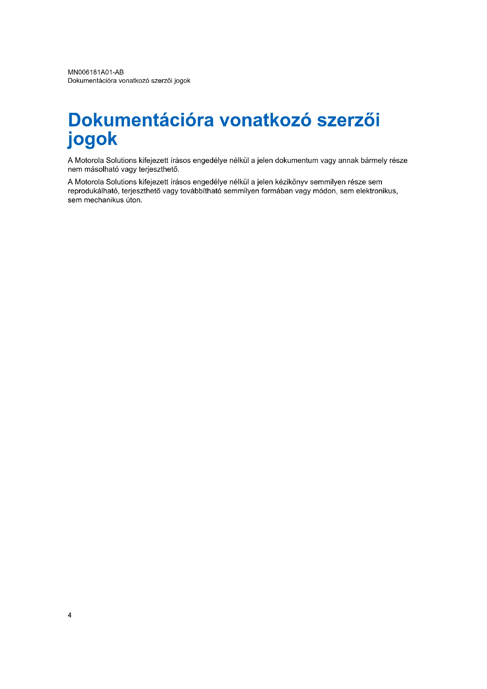 Fejezet 11: Tartozékok.............................................................................................50 MN006181A01-AB Tartalom 3Dokumentációra vonatkozó szerzői jogok A Motorola Solutions kifejezett írásos engedélye nélkül a jelen dokumentum vagy annak bármely része nem másolható vagy terjeszthető. A Motorola Solutions kifejezett írásos engedélye nélkül a jelen kézikönyv semmilyen része sem reprodukálható, terjeszthető vagy továbbítható semmilyen formában vagy módon, sem elektronikus, sem mechanikus úton. MN006181A01-AB Dokumentációra vonatkozó szerzői jogok 4Kizáró nyilatkozat Az ebben a dokumentumban szereplő információk gondosan meg vannak vizsgálva, és teljes mértékben megbízhatónak tartjuk őket. A pontatlanságokért azonban nem vállalunk felelősséget. Emellett a Motorola Solutions fenntartja a jogot az itt szereplő bármely terméke megbízhatóság, funkcionalitás vagy kialakítás javítása érdekében végzett módosítására. A Motorola Solutions nem vállal semmilyen felelősséget az itt ismertetett termékek vagy áramkörök alkalmazásából vagy használatából eredő károkért, és garanciája nem terjed ki a saját szabadalmi jogai vagy mások jogai alatti licencekre. MN006181A01-AB Kizáró nyilatkozat 5Számítógépes szoftverre vonatkozó szerzői jogok A kézikönyvben leírt Motorola Solutions termékek szerzői jogvédelmet élvező, félvezető memóriákon vagy más adathordozókon tárolt számítógépes programokat tartalmazhatnak. Az Egyesült Államok és más országok törvényei a Motorola Solutions részére kizárólagos jogokat tartanak fenn a szerzői jogvédelmet élvező számítógépes programok kizárólagos másolására vagy bármilyen egyéb formában történő sokszorosítására. Ennek megfelelően a kézikönyvben található Motorola Solutions termékek részét képező, szerzői jogvédelmet élvező számítógépes programok semmilyen formában nem másolhatók, módosíthatók, visszafejthetők, sokszorosíthatók vagy terjeszthetők a Motorola Solutions írásos engedélye nélkül. Továbbá a Motorola Solutions termékek megvásárlása nem tekinthető felhatalmazásnak, sem közvetlenül, sem hallgatólagosan, sem más módon, kivéve a nem kizárólagos, normál szerzői jogdíjmentes használati jogosítványt, amely a termékeladásban alkalmazott törvényből következik. MN006181A01-AB Számítógépes szoftverre vonatkozó szerzői jogok 6Akkumulátorok, töltők és audiotartozékok biztonsági információi Ez a dokumentum fontos biztonsági és használatra vonatkozó utasításokat tartalmaz. Figyelmesen olvassa el ezen utasításokat, és őrizze meg őket későbbi használatra. Az akkumulátortöltő használata előtt olvassa el az összes utasítást és figyelmeztető jelölést: