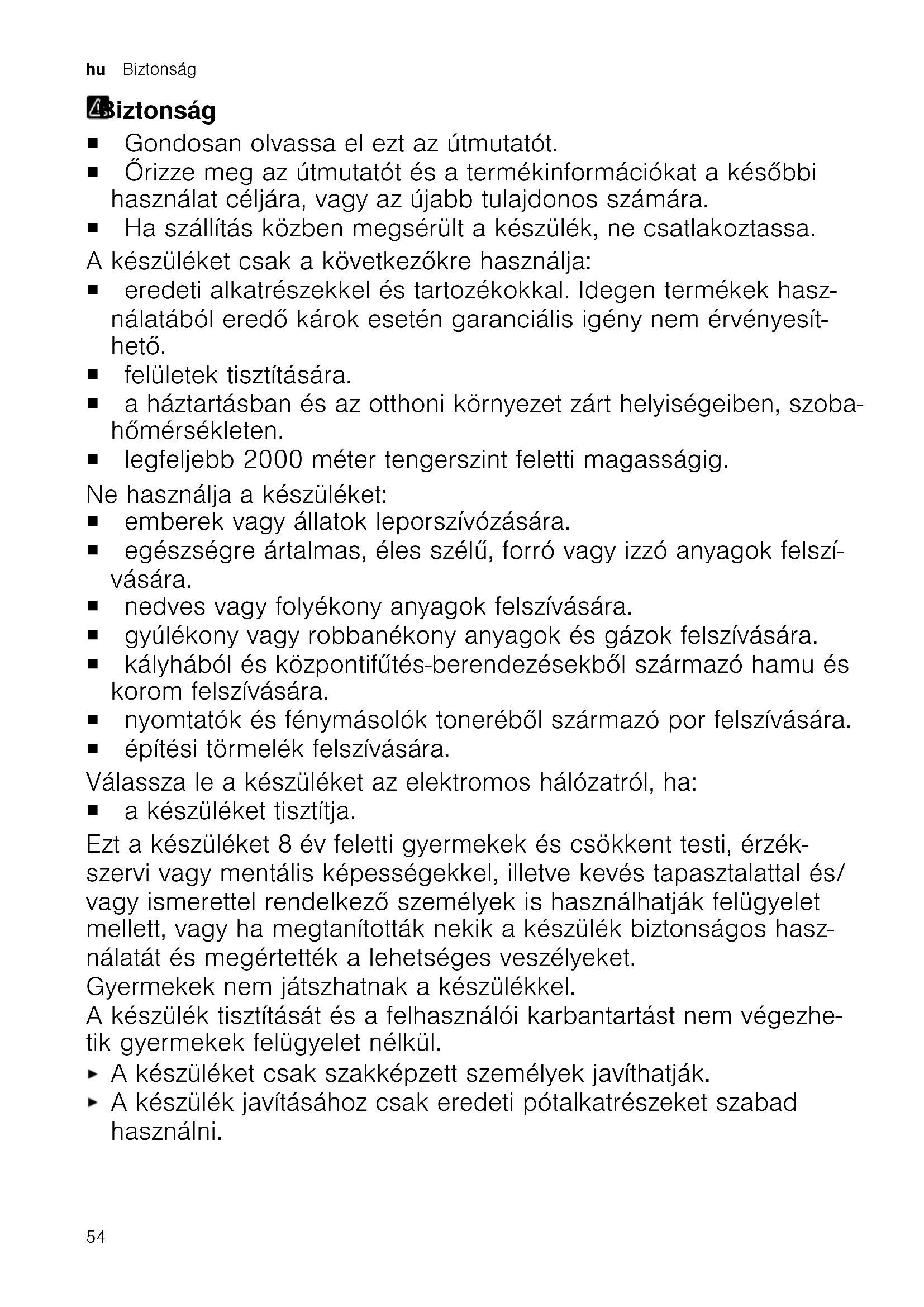Wyczyścić filtr pojemnika na pył. Filtr wylotu powietrza jest zanieczyszczony. Wyczyścić filtr wylotu powietrza. Szczotka lub turboszczot- ka nie obraca się. Wałek szczotki jest zanieczyszczony. Oczyścić wałek szczotki. Moc ssania jest zbyt niska. Obrócić regulator mocy na maksymalną moc ssania. Utylizacja zużytego urządzeniaUtylizacja zużytego urządzenia Urządzenie utylizować zgodnie z przepi- sami o ochronie środowiska naturalne- go. Informacje o aktualnych możliwościach utylizacji można uzyskać od sprzedawcy lub w urzędzie miasta lub gminy. To urządzenie jest oznaczone zgodnie z Dyrektywą Europej- ską 2012/09/UE oraz polską Ustawą z dnia 29 lipca 2005r. „O zużytym sprzęcie elektrycz- nym i elektronicznym” (Dz.U. z 2005 r. Nr 180, poz. 1495) symbolem przekreślonego kontenera na odpady. Takie oznakowanie informuje, że sprzęt ten, po okresie jego użytkowania nie może być umieszczany łącznie z innymi odpadami pochodzącymi z gospodarstwa domowego. Użytkownik jest zobowiązany do oddania go prowadzącym zbieranie zużytego sprzętu elektrycznego i elektroniczne- go. Prowadzący zbieranie, w 52Serwis pl tym lokalne punkty zbiórki, sklepy oraz gminne jednostka, tworzą odpowiedni system umożliwiający oddanie tego sprzętu. Właściwe postępowa- nie ze zużytym sprzętem elek- trycznym i elektronicznym przyczynia się do uniknięcia szkodliwych dla zdrowia ludzi i środowiska naturalnego kon- sekwencji, wynikających z obecności składników niebez- piecznych oraz niewłaściwego składowania i przetwarzania takiego sprzętu. SerwisSerwis Dokładne informacje na temat okresu i wa- runków gwarancji w danym kraju można uzyskać, korzystając z kodu QR na załączo- nym dokumencie dotyczącym kontaktów serwisowych i warunków gwarancji, od pra- cowników naszego serwisu, od sprzedawcy lub znaleźć na naszej stronie internetowej. Dane kontaktowe obsługi klienta można znaleźć za pomocą kodu QR w załączonym dokumencie dotyczącym kontaktów serwi- sowych i warunków gwarancji lub na naszej stronie internetowej. Informacje zgodne z Rozporządzeniem (EU) 2023/826 można znaleźć online pod adresem www.bosch-home.com na stronie produktu i stronie serwisowej urządzenia, w obszarze instrukcji obsługi i dodatkowych dokumentów. 53hu Biztonság Biztonság Biztonság ¡ Gondosan olvassa el ezt az útmutatót. ¡ Őrizze meg az útmutatót és a termékinformációkat a későbbi használat céljára, vagy az újabb tulajdonos számára. ¡ Ha szállítás közben megsérült a készülék, ne csatlakoztassa. A készüléket csak a következőkre használja: ¡ eredeti alkatrészekkel és tartozékokkal. Idegen termékek hasz- nálatából eredő károk esetén garanciális igény nem érvényesít- hető. ¡ felületek tisztítására. ¡ a háztartásban és az otthoni környezet zárt helyiségeiben, szoba- hőmérsékleten. ¡ legfeljebb 2000 méter tengerszint feletti magasságig. Ne használja a készüléket: ¡ emberek vagy állatok leporszívózására. ¡ egészségre ártalmas, éles szélű, forró vagy izzó anyagok felszí- vására. ¡ nedves vagy folyékony anyagok felszívására. ¡ gyúlékony vagy robbanékony anyagok és gázok felszívására. ¡ kályhából és központifűtés-berendezésekből származó hamu és korom felszívására. ¡ nyomtatók és fénymásolók toneréből származó por felszívására. ¡ építési törmelék felszívására. Válassza le a készüléket az elektromos hálózatról, ha: ¡ a készüléket tisztítja. Ezt a készüléket 8év feletti gyermekek és csökkent testi, érzék- szervi vagy mentális képességekkel, illetve kevés tapasztalattal és/ vagy ismerettel rendelkező személyek is használhatják felügyelet mellett, vagy ha megtanították nekik a készülék biztonságos hasz- nálatát és megértették a lehetséges veszélyeket. Gyermekek nem játszhatnak a készülékkel. A készülék tisztítását és a felhasználói karbantartást nem végezhe- tik gyermekek felügyelet nélkül. A készüléket csak szakképzett személyek javíthatják. A készülék javításához csak eredeti pótalkatrészeket szabad használni. 54Biztonság hu Ha a készülék hálózati csatlakozóvezetéke megsérül, akkor azt a veszélyek elkerülése érdekében csak a gyártó, a gyártó vevő- szolgálata vagy egy hasonlóan képzett személy cserélheti ki. Soha ne használjon megsérült készüléket. Soha ne használjon olyan készüléket, amelynek a felülete repedt vagy törött. Miközben a készüléket leválasztja az elektromos hálózatról, soha ne a hálózati csatlakozóvezetéket húzza. Mindig a hálózati csat- lakozóvezeték dugóját húzza. A készüléket soha ne a hálózati csatlakozóvezetéknél fogva húz- za vagy hordozza. Ha a készülék vagy a hálózati csatlakozóvezeték megsérült, azonnal húzza ki a hálózati csatlakozóvezeték csatlakozódugó- ját, vagy kapcsolja le a biztosítékszekrényben lévő biztosítékot. Forduljon a vevőszolgálathoz.