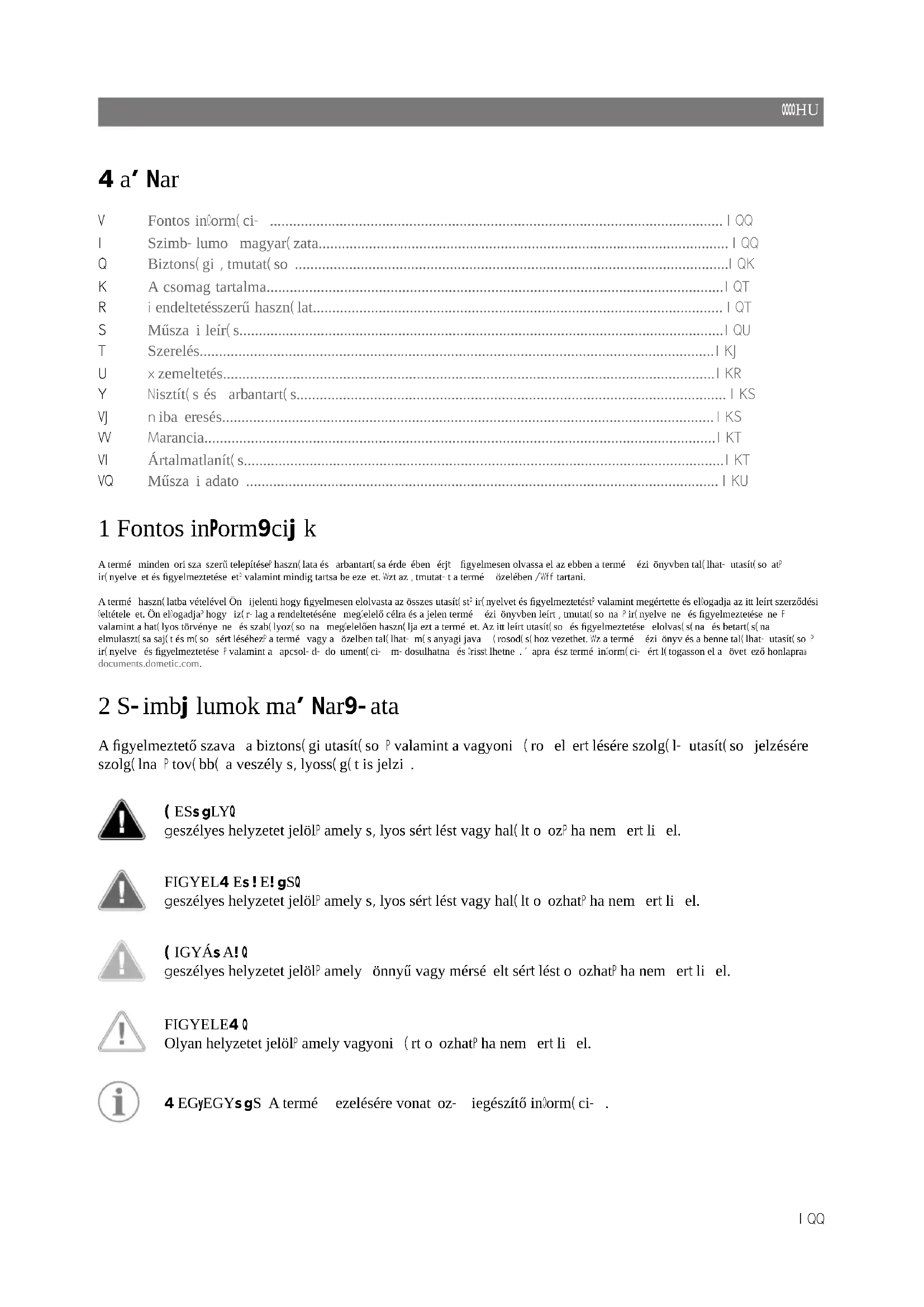 - Helytelen karbantartás, vagy a gyártó által szállított eredeti cserealkatrészektől eltérő cserealkatrészek használata