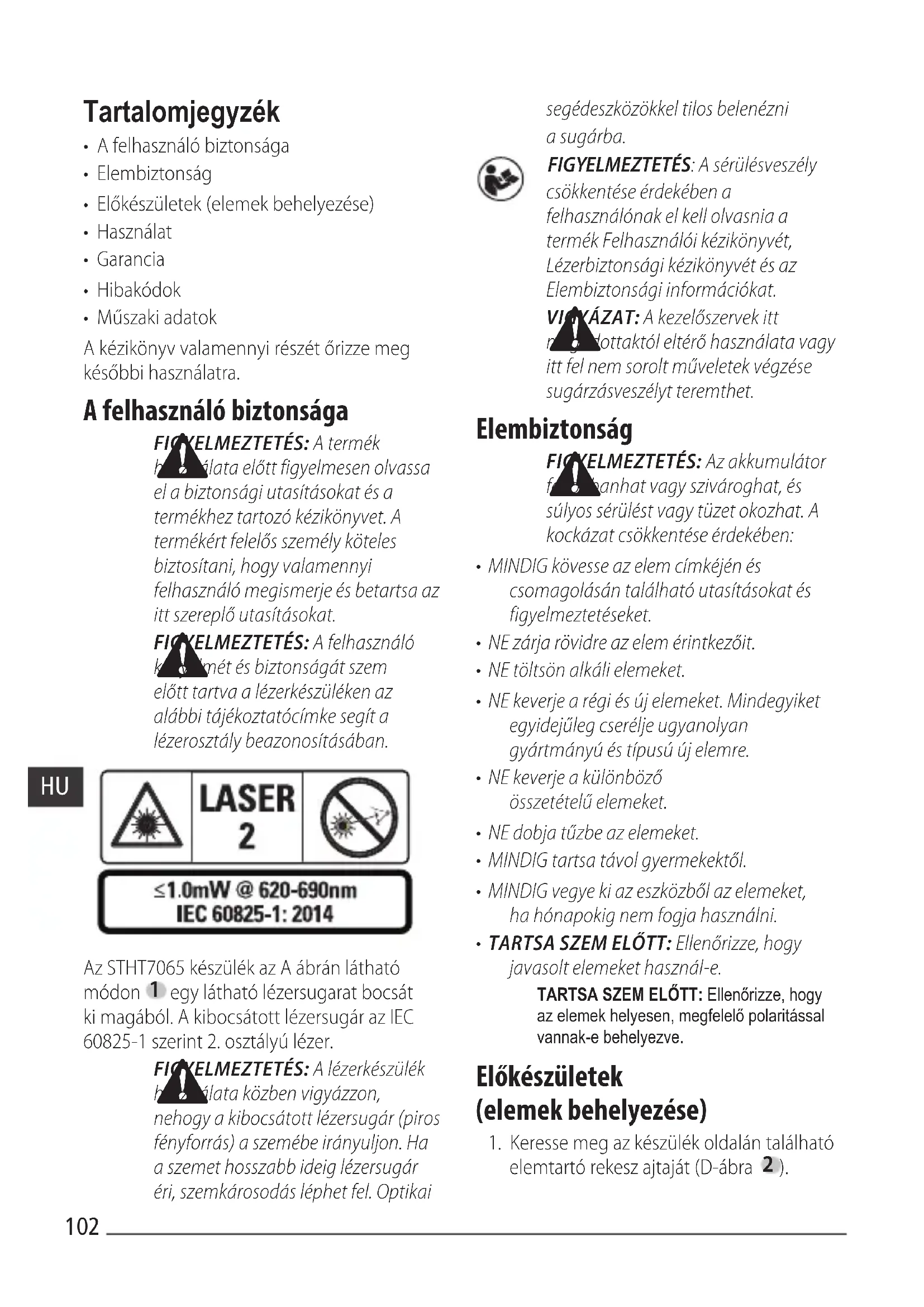 Az STHT7065 készülék az A ábrán látható módon egy látható lézersugarat bocsát ki magából. A kibocsátott lézersugár az IEC 60825-1 szerint 2. osztályúlézer. FIGYELMEZTETÉS: A lézerkészülék használata közben vigyázzon, nehogy a kibocsátott lézersugár (piros fényforrás) a szemébe irányuljon. Ha a szemet hosszabb ideig lézersugár éri, szemkárosodás léphet fel. Optikai segédeszközökkel tilos belenézni asugárba. FIGYELMEZTETÉS: A sérülésveszély csökkentése érdekében a felhasználónak el kell olvasnia a termék Felhasználói kézikönyvét, Lézerbiztonsági kézikönyvét és az Elembiztonságiinformációkat. VIGYÁZAT: A kezelőszervek itt megadottaktól eltérő használata vagy itt fel nem sorolt műveletek végzése sugárzásveszélytteremthet. Elembiztonság