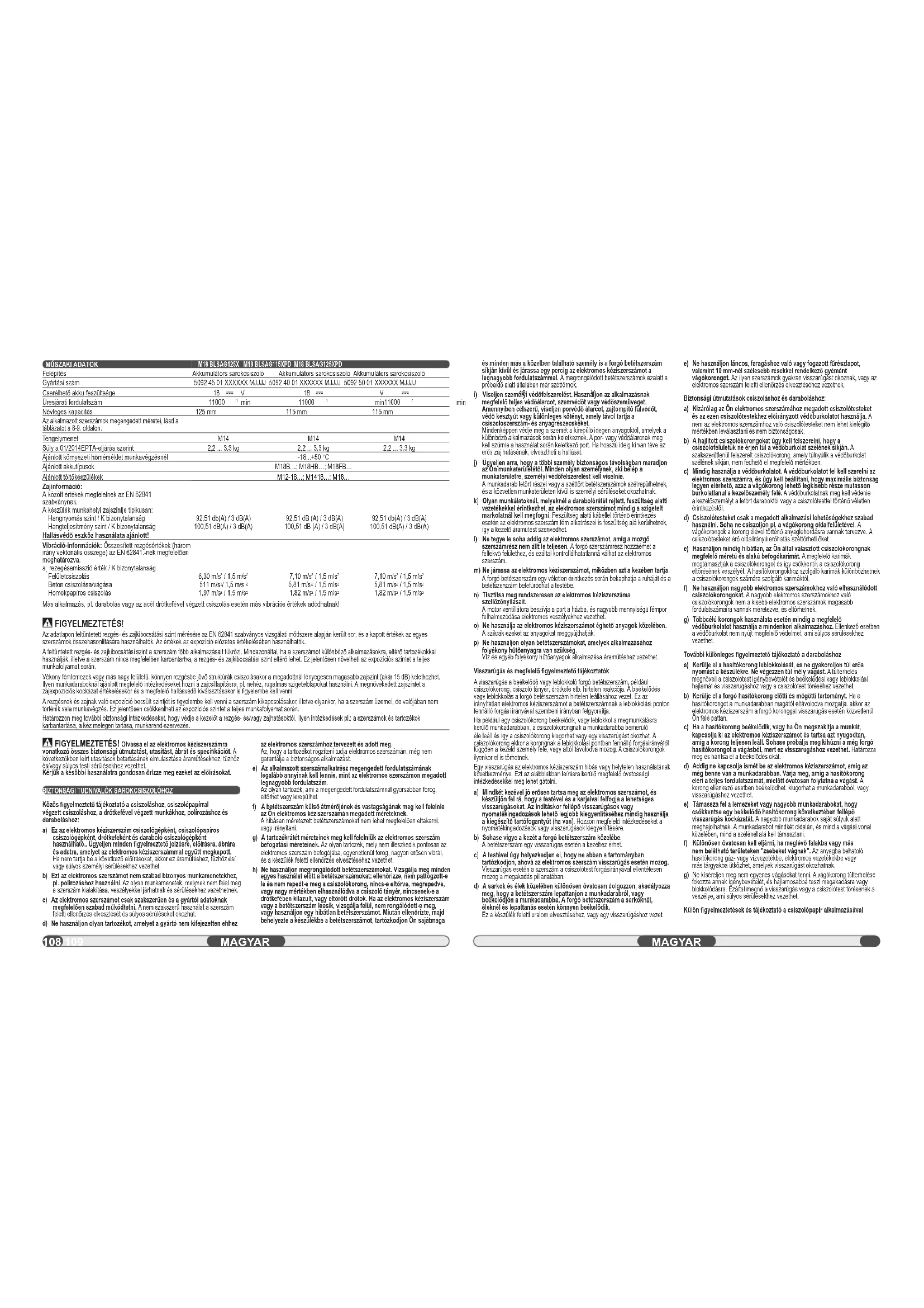 Közös fi gyelmeztető tájékoztató a csiszoláshoz, csiszolópapírral végzett csiszoláshoz, a drótkefével végzett munkákhoz, polírozáshoz és daraboláshoz: a) Ez az elektromos kéziszerszám csiszológépként, csiszolópapíros csiszológépként, drótkefeként és daraboló csiszológépként használható.. Ügyeljen minden fi gyelmeztető jelzésre, előírásra, ábrára és adatra, amelyet az elektromos kéziszerszámmal együtt megkapott. Ha nem tartja be a következő előírásokat, akkor ez áramütéshez, tűzhöz és/ vagy súlyos személyi sérülésekhez vezethet. b) Ezt az elektromos szerszámot nem szabad bizonyos munkamenetekhez, pl. polírozáshoz használni. Az olyan munkamenetek, melynek nem felel meg a szerszám kialakítása, veszélyekkel járhatnak és sérülésekhez vezethetnek. c) Az elektromos szerszámot csak szakszerűen és a gyártói adatoknak megfelelően szabad működtetni. A nem szakszerű használat a szerszám feletti ellenőrzés elvesztését és súlyos sérüléseket okozhat. d) Ne használjon olyan tartozékot, amelyet a gyártó nem kifejezetten ehhez az elektromos szerszámhoz tervezett és adott meg. Az, hogy a tartozékot rögzíteni tudja elektromos szerszámán, még nem garantálja a biztonságos alkalmazást. e) Az alkalmazott szerszámalkatrész megengedett fordulatszámának legalább annyinak kell lennie, mint az elektromos szerszámon megadott legnagyobb fordulatszám. Az olyan tartozék, ami a megengedett fordulatszámnál gyorsabban forog, eltörhet vagy lerepülhet. f) A betétszerszám külső átmérőjének és vastagságának meg kell felelnie az Ön elektromos kéziszerszámán megadott méreteknek. A hibásan méretezett betétszerszámokat nem lehet megfelelően eltakarni, vagy irányítani. g) A tartozékrátét méreteinek meg kell felelniük az elektromos szerszám befogatási méreteinek. Az olyan tartozék, mely nem illeszkedik pontosan az elektromos szerszám befogójába, egyenetlenül forog, nagyon erősen vibrál, és a készülék feletti ellenőrzés elvesztéséhez vezethet. h) Ne használjon megrongálódott betétszerszámokat. Vizsgálja meg minden egyes használat előtt a betétszerszámokat: ellenőrizze, nem pattogzott-e le és nem repedt-e meg a csiszolókorong, nincs-e eltörve, megrepedve, vagy nagy mértékben elhasználódva a csiszoló tányér, nincsenek-e a drótkefében kilazult, vagy eltörött drótok. Ha az elektromos kéziszerszám vagy a betétszerszám leesik, vizsgálja felül, nem rongálódott-e meg, vagy használjon egy hibátlan betétszerszámot. Miután ellenőrizte, majd behelyezte a készülékbe a betétszerszámot, tartózkodjon Ön sajátmaga Más alkalmazás, pl. darabolás vagy az acél drótkefével végzett csiszolás esetén más vibrációs értékek adódhatnak! FIGYELMEZTETÉS! Az adatlapon feltüntetett rezgés- és zajkibocsátási szint mérésére az EN 62841 szabványos vizsgálati módszere alapján került sor, és a kapott értékek az egyes szerszámok összehasonlítására használhatók. Az értékek az expozíció előzetes értékelésében használhatók. A feltüntetett rezgés- és zajkibocsátási szint a szerszám főbb alkalmazásait tükrözi. Mindazonáltal, ha a szerszámot különböző alkalmazásokra, eltérő tartozékokkal használják, illetve a szerszám nincs megfelelően karbantartva, a rezgés- és zajkibocsátási szint eltérő lehet. Ez jelentősen növelheti az expozíciós szintet a teljes munkafolyamat során. Vékony fémlemezek vagy más nagy felületű, könnyen rezgésbe jövő struktúrák csiszolásakor a megadottnál lényegesen magasabb zajszint (akár 15 dB) keletkezhet. Ilyen munkadaraboknál ajánlott megfelelő intézkedéseket hozni a zajcsillapításra, pl. nehéz, rugalmas szigetelőlapokat használni. A megnövekedett zajszintet a zajexpozíciós kockázat értékelésekor és a megfelelő hallásvédő kiválasztásakor is fi gyelembe kell venni. A rezgésnek és zajnak való expozíció becsült szintjét is fi gyelembe kell venni a szerszám kikapcsolásakor, illetve olyankor, ha a szerszám üzemel, de valójában nem történik vele munkavégzés. Ez jelentősen csökkentheti az expozíciós szintet a teljes munkafolyamat során. Határozzon meg további biztonsági intézkedéseket, hogy védje a kezelőt a rezgés- és/vagy zajhatásoktól. Ilyen intézkedések pl.: a szerszámok és tartozékok karbantartása, a kéz melegen tartása, munkarend-szervezés. Akkumulátors sarokcsiszoló Akkumulátors sarokcsiszoló Akkumulátors sarokcsiszoló MAGYAR110 111MAGYAR 90-es típus: homokpapíros csiszolókorong ALKALMAZOTT SZERSZÁMOK ÉS VÉDŐKÉSZÜLÉKEK MEGENGEDETT