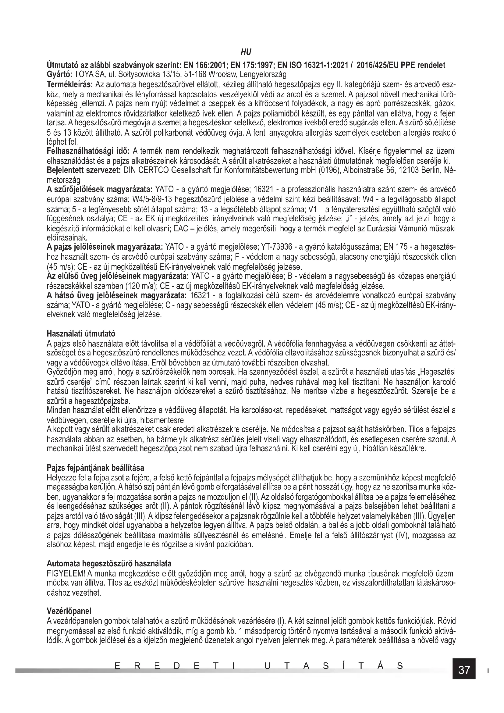 Útmutató az alábbi szabványok szerint: EN 166:2001; EN 175:1997; EN ISO 16321-1:2021 / 2016/425/EU PPE rendelet Gyártó: TOYA SA, ul. Sołtysowicka 13/15, 51-168 Wrocław, Lengyelország Termékleírás: Az automata hegesztőszűrővel ellátott, kézileg állítható hegesztőpajzs egy II. kategóriájú szem- és arcvédő esz- köz, mely a mechanikai és fényforrással kapcsolatos veszélyektől védi az arcot és a szemet. A pajzsot növelt mechanikai tűrő- képesség jellemzi. A pajzs nem nyújt védelmet a cseppek és a kifröccsent folyadékok, a nagy és apró porrészecskék, gázok, valamint az elektromos rövidzárlatkor keletkező ívek ellen. A pajzs poliamidból készült, és egy pánttal van ellátva, hogy a fején tartsa. A hegesztőszűrő megóvja a szemet a hegesztéskor keletkező, elektromos ívekből eredő sugárzás ellen. A szűrő sötétítése 5 és 13 között állítható. A szűrőt polikarbonát védőüveg óvja. A fenti anyagokra allergiás személyek esetében allergiás reakció léphet fel. Felhasználhatósági idő: A termék nem rendelkezik meghatározott felhasználhatósági idővel. Kísérje fi gyelemmel az üzemi elhasználódást és a pajzs alkatrészeinek károsodását. A sérült alkatrészeket a használati útmutatónak megfelelően cserélje ki. Bejelentett szervezet: DIN CERTCO Gesellschaft für Konformitätsbewertung mbH (0196), Alboinstraße 56, 12103 Berlin, Né- metország A szűrőjelölések magyarázata: YATO - a gyártó megjelölése; 16321 - a professzionális használatra szánt szem- és arcvédő európai szabvány száma; W4/5-8/9-13 hegesztőszűrő jelölése a védelmi szint kézi beállításával: W4 - a legvilágosabb állapot száma; 5 - a legfényesebb sötét állapot száma; 13 - a legsötétebb állapot száma; V1 – a fényáteresztési együttható szögtől való függésének osztálya; CE - az EK új megközelítési irányelveinek való megfelelőség jelzése; „i” - jelzés, amely azt jelzi, hogy a kiegészítő információkat el kell olvasni; EAC – jelölés, amely megerősíti, hogy a termék megfelel az Eurázsiai Vámunió műszaki előírásainak. A pajzs jelöléseinek magyarázata: YATO - a gyártó megjelölése; YT-73936 - a gyártó katalógusszáma; EN 175 - a hegesztés- hez használt szem- és arcvéd ő európai szabvány száma; F - védelem a nagy sebességű, alacsony energiájú részecskék ellen (45 m/s); CE - az új megközelítésű EK-irányelveknek való megfelelőség jelzése. Az elülső üveg jelöléseinek magyarázata: YATO - a gyártó megjelölése; B - védelem a nagysebességű és közepes energiájú részecskékkel szemben (120 m/s); CE - az új megközelítésű EK-irányelveknek való megfelelőség jelzése. A hátsó üveg jelöléseinek magyarázata: 16321 - a foglalkozási célú szem- és arcvédelemre vonatkozó európai szabvány száma; YATO - a gyártó megjelölése; C - nagy sebességű részecskék elleni védelem (45 m/s); CE - az új megközelítésű EK-irány- elveknek való megfelelőség jelzése. Használati útmutató A pajzs első használata előtt távolítsa el a védőfóliát a védőüvegről. A védőfólia fennhagyása a védőüvegen csökkenti az áttet- szőséget és a hegesztőszűrő rendellenes működéséhez vezet. A védőfólia eltávolításához szükségesnek bizonyulhat a szűrő és/ vagy a védőüvegek eltávolítása. Erről bővebben az útmutató további részeiben olvashat. Győződjön meg arról, hogy a szűrőérzékelők nem porosak. Ha szennyeződést észlel, a szűrőt a használati utasítás „Hegesztési szűrő cseréje” című részben leírtak szerint ki kell venni, majd puha, nedves ruhával meg kell tisztítani. Ne használjon karcoló hatású tisztítószereket. Ne használjon oldószereket a szűrő tisztításához. Ne merítse vízbe a hegesztőszűrőt. Szerelje be a szűrőt a hegesztőpajzsba. Minden használat előtt ellenőrizze a védőüveg állapotát. Ha karcolásokat, repedéseket, mattságot vagy egyéb sérülést észlel a védőüvegen, cserélje ki újra, hibamentesre. A kopott vagy sérült alkatrészeket csak eredeti alkatrészekre cserélje. Ne módosítsa a pajzsot saját hatáskörben. Tilos a fejpajzs használata abban az esetben, ha bármelyik alkatrész sérülés jeleit viseli vagy elhasználódott, és esetlegesen cserére szorul. A mechanikai ütést szenvedett hegesztőpajzsot nem szabad újra felhasználni. Ki kell cserélni egy új, hibátlan készülékre. Pajzs fejpántjának beállítása Helyezze fel a fejpajzsot a fejére, a felső kettő fejpánttal a fejpajzs mélységét állíthatjuk be, hogy a szemünkhöz képest megfelelő magasságba kerüljön. A hátsó szíj pántján lévő gomb elforgatásával állítsa be a pánt hosszát úgy, hogy az ne szorítsa munka köz- ben, ugyanakkor a fej mozgatása során a pajzs ne mozduljon el (II). Az oldalsó forgatógombokkal állítsa be a pajzs felemeléséhez és leengedéséhez szükséges erőt (II). A pántok rögzítésénél lévő klipsz megnyomásával a pajzs belsejében lehet beállítani a pajzs arctól való távolságát (III). A klipsz felengedésekor a pajzsnak rögzülnie kell a többféle helyzet valamelyikében (III). Ügyeljen arra, hogy mindkét oldal ugyanabba a helyzetbe legyen állítva. A pajzs belső oldalán, a bal és a jobb oldali gomboknál található a pajzs dőlésszögének beállítása maximális süllyesztésnél és emelésnél. Emelje fel a felső állítószárnyat (IV), mozgassa az alsóhoz képest, majd engedje le és rögzítse a kívánt pozícióban. Automata hegesztőszűrő használata FIGYELEM! A munka megkezdése előtt győződjön meg arról, hogy a szűrő az elvégzendő munka típusának megfelelő üzem- módba van állítva. Tilos az eszközt működésképtelen szűrővel használni hegesztés közben, ez visszafordíthatatlan látáská
