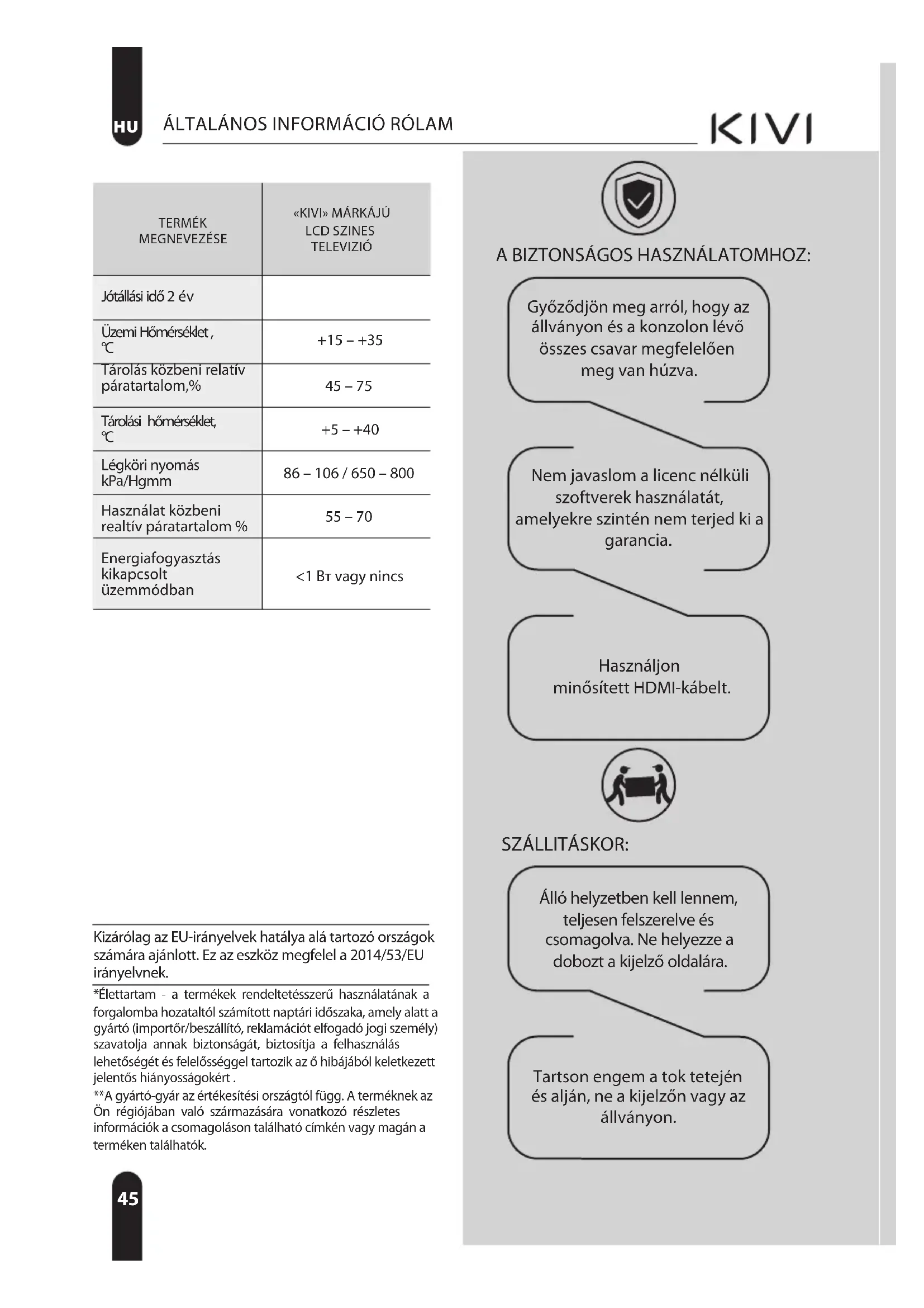 *Élettartam - a termékek rendeltetésszerű használatának a forgalomba hozataltól számított naptári időszaka, amely alatt a gyártó (importőr/beszállító, reklamációt elfogadó jogi személy) szavatolja annak biztonságát, biztosítja a felhasználás lehetőségét és felelősséggel tartozik az ő hibájából keletkezett jelentős hiányosságokért . **A gyártó-gyár az értékesítési országtól függ. A terméknek az Ön régiójában való származására vonatkozó részletes információk a csomagoláson található címkén vagy magán a terméken találhatók. Kizárólag az EU-irányelvek hatálya alá tartozó országok számára ajánlott. Ez az eszköz megfelel a 2014/53/EU irányelvnek. SZÁLLITÁSKOR: Álló helyzetben kell lennem, teljesen felszerelve és csomagolva. Ne helyezze a dobozt a kijelző oldalára. Tartson engem a tok tetején és alján, ne a kijelzőn vagy az állványon. Használjon minősített HDMI-kábelt. Nem javaslom a licenc nélküli szoftverek használatát, amelyekre szintén nem terjed ki a garancia. Győződjön meg arról, hogy az állványon és a konzolon lévő összes csavar megfelelően meg van húzva. A BIZTONSÁGOS HASZNÁLATOMHOZ: TERMÉK MEGNEVEZÉSE
