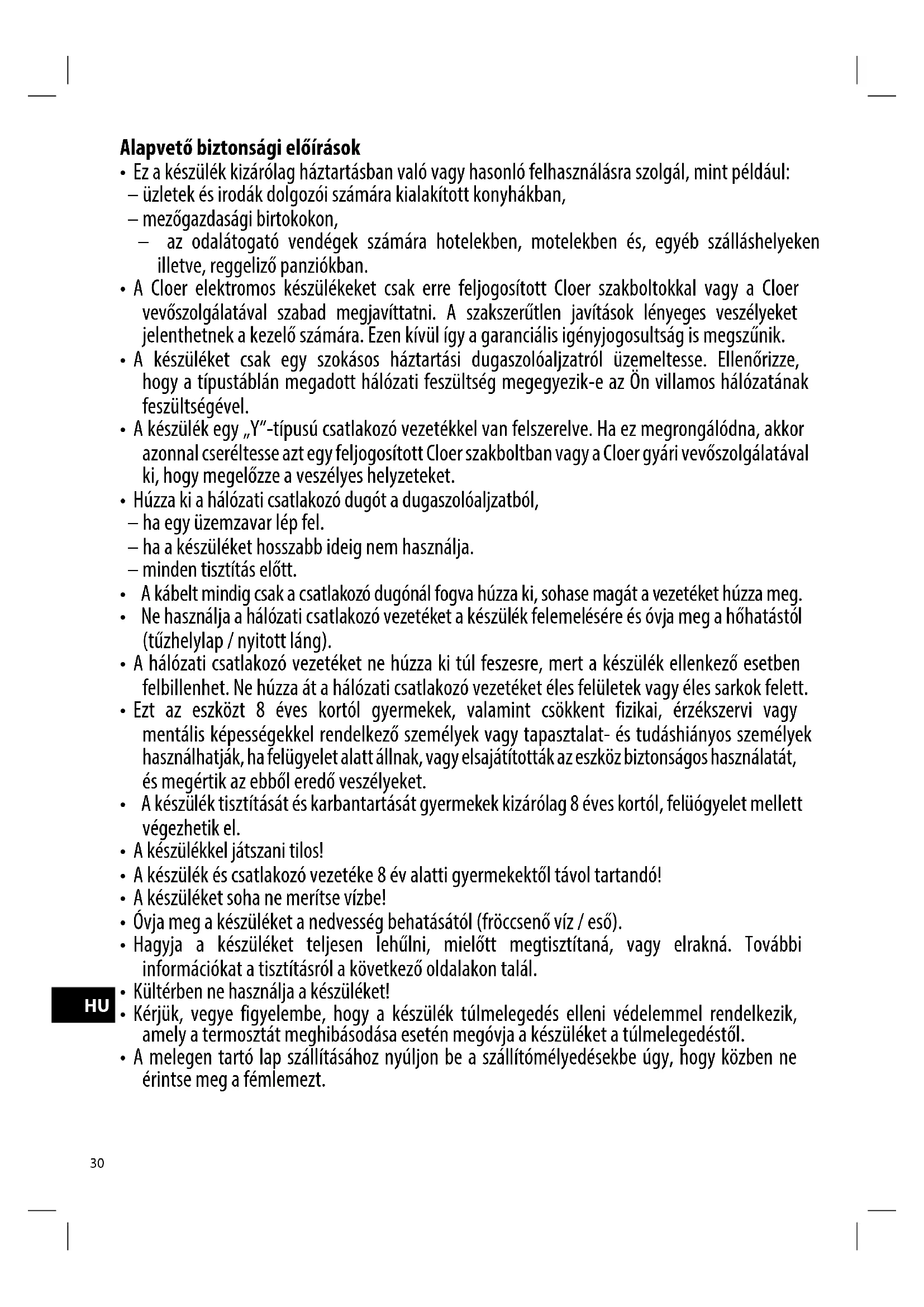 - A készülék egy „Y“-típusú csatlakozó vezetékkel van felszerelve. Ha ez megrongálódna, akkor azonnal cseréltesse azt egy feljogosított Cloer szakboltban vagy a Cloer gyári vevőszolgálatával ki, hogy megelőzze a veszélyes helyzeteket.